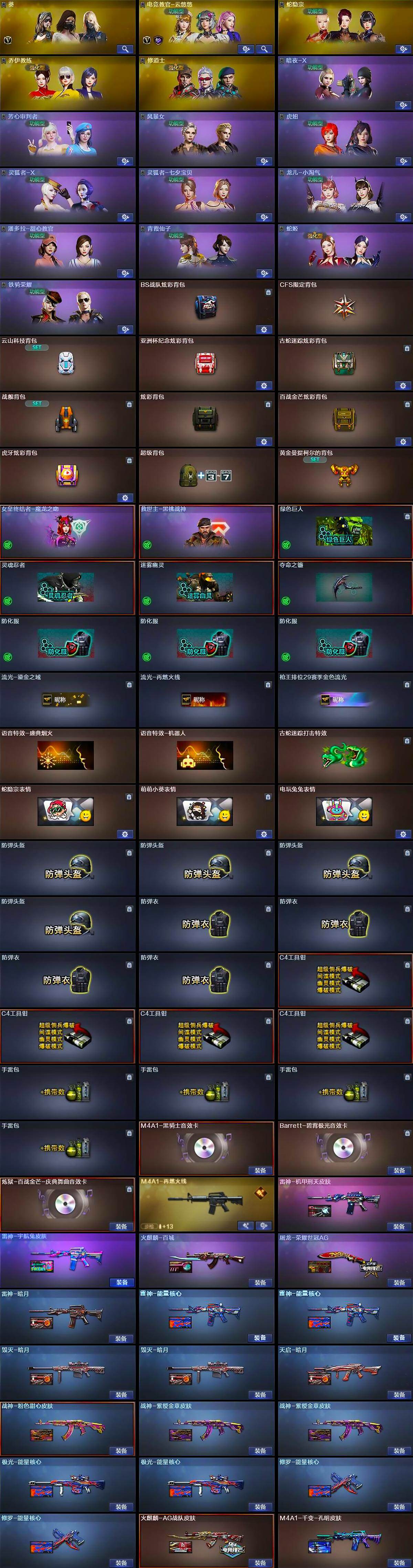 【道具】:BS战队炫彩背包,CFS限定背包,云山科技背包,亚洲杯纪念炫彩背包,古蛇迷踪炫彩背包,战舰背包,炫彩背包,百战金芒炫彩背包,虎牙炫彩背包,超级背包,黄金曼提柯尔的背包,
