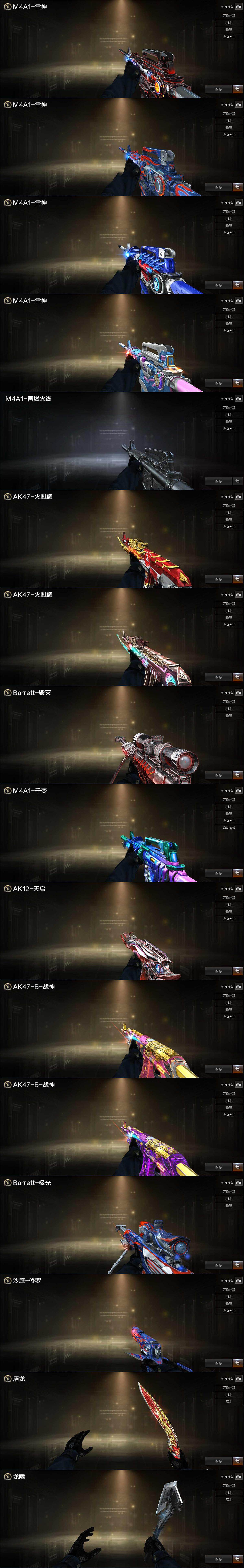 【英雄级武器】:M4A1-千变,AK47-火麒麟*2,M4A1-雷神,M4A1-黑骑士,AK12-天启,金色蔷薇-古蛇迷踪,M4A1-玫瑰精灵,QBZ03-金色蔷薇,AK-47-猩红传说*2,AK47-B-战神,白虎-电玩蓝兔,Barrett-毁灭,Barrett-极光,M200-竞技荣光,炼狱-百战金芒,沙鹰-修罗*2,沙鹰-天神*2,USP-雷暴,荣耀世冠-柯尔特,柯尔特-竞技荣光*2,修罗-古蛇迷踪,屠龙,龙啸,擎天*3,擎天-竞技荣光,麒麟刺-百战金芒,高爆手雷-竞技荣光*4,高爆手雷-古蛇迷踪,闪光弹-竞技荣光*4,烟雾弹-竞技荣光*4,烟雾弹-古蛇迷踪,M4A1-苍鸣雷神,Barrett-碧霄极光