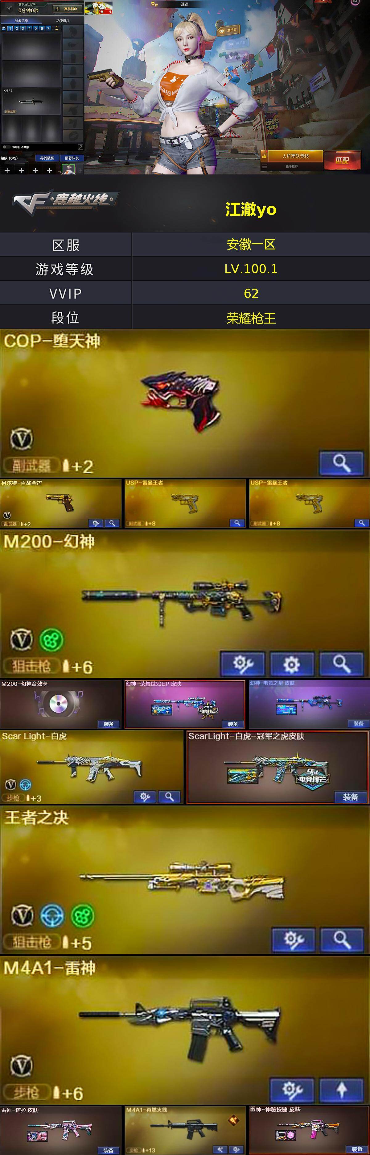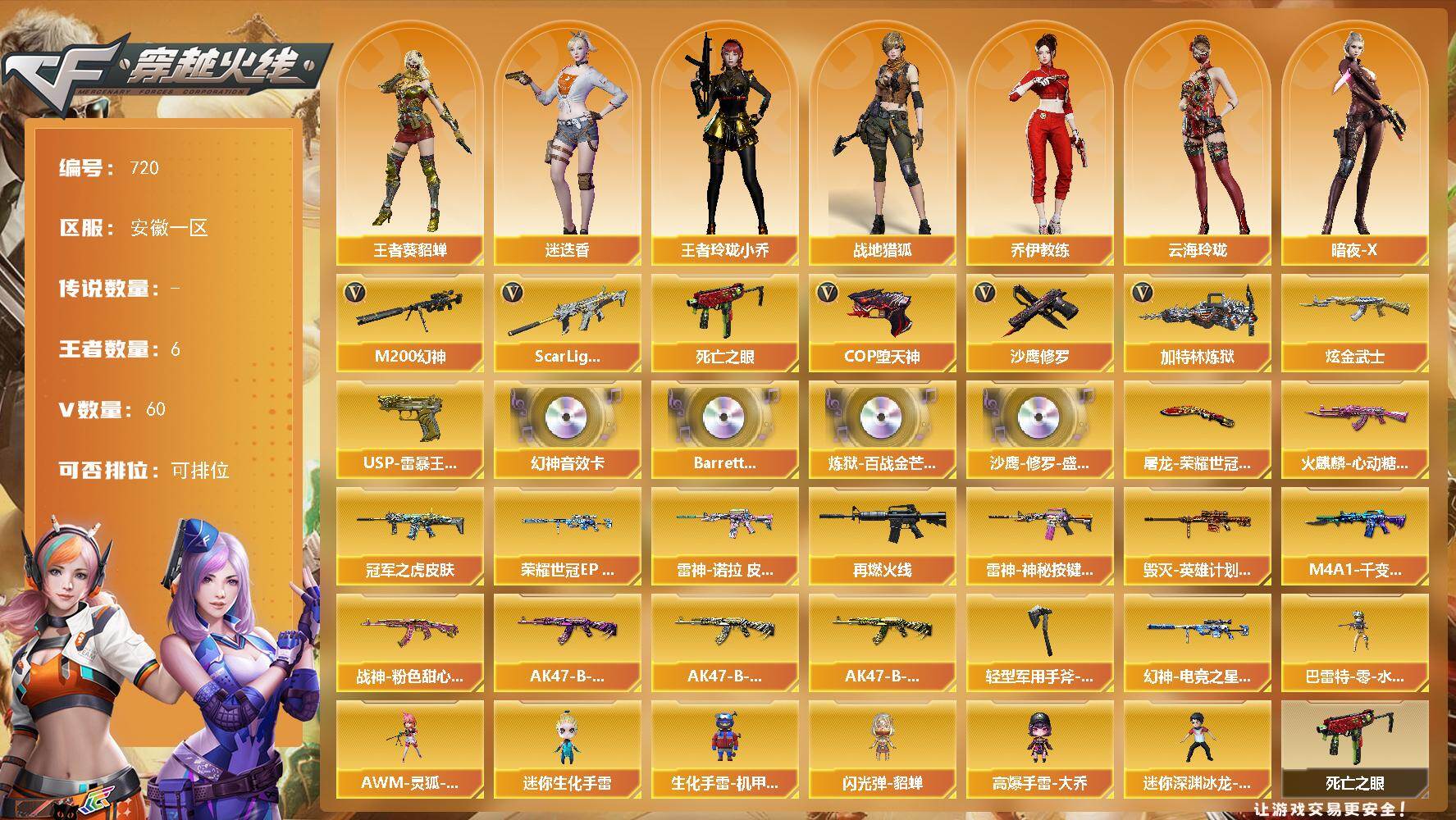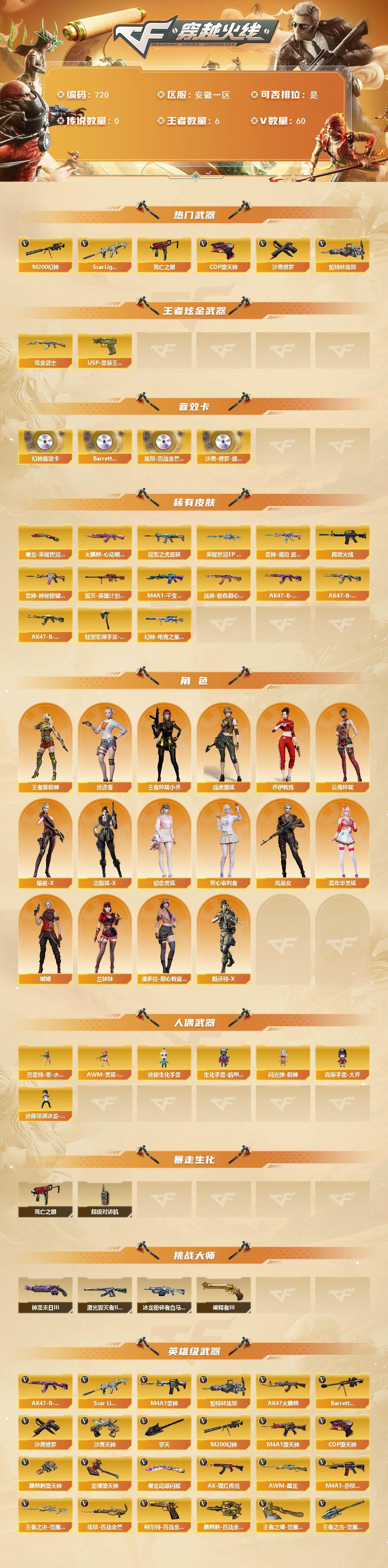 [15422783]安徽一区-60V-6王者-1炫金 【热门武器】:Scar Light-白虎,M200-幻神,死亡之眼,加特林-炼狱,COP-堕天神,沙鹰-修罗*2 【王者炫金武器】:USP-雷暴王者*2,炫金武士 【音效卡】:M200-幻神音效卡,Barrett-碧霄极光音效卡,炼狱-百战金芒-庆典舞曲音效卡,沙鹰-修罗-盛典舞曲音效卡 【皮肤】:幻神-荣耀世冠EP 皮肤,幻神-电竞之星 皮肤,ScarLight-白虎-冠军之虎皮肤,雷神-诺拉 皮肤,M4A1-再燃火线,雷神-神秘按键 皮肤,火麒麟-心动糖果,毁灭-英雄计划 皮肤,M4A1-千变-孔明皮肤,战神-粉色甜心皮肤,AK47-B-常胜将军-曹操*3,AK47-B-常胜将军-刘备*3,AK47-B-常胜将军-孙权,屠龙-荣耀世冠AG,轻型军用手斧-再燃火线 【角色】:迷迭香,战地猎狐,王者-葵-貂蝉,王者玲珑-小乔,乔伊教练,云海玲珑,暗夜-X,北极狐-X,初恋灵狐,芳心审判者,风暴女,嘉年华灵狐,娟娟,兰妹妹,潘多拉-甜心教官,斯沃特-X 【人偶武器】:巴雷特-零-水下丽影*2,AWM-灵狐-15周年嘉年华*3,迷你生化手雷,生化手雷-机甲核心,闪光弹-貂蝉,高爆手雷-大乔,迷你深渊冰龙-王绿豆 【暴走生化】:死亡之眼,超级对讲机 【挑战大师】:冰龙粉碎者-白马银枪,激光毁灭者III-白马银枪*2,神圣爆裂者-末日III,阐释者III 【英雄级武器】:AK47-火麒麟*2,M4A1-雷神,M4A1-堕天神,Scar Light-白虎,AK-47-猩红传说,AK47-B-常胜将军,Barrett-毁灭,M200-幻神,王者之决-觉醒版,加特林-炼狱,炼狱-百战金芒,沙鹰-修罗*2,沙鹰-天神*2,COP-堕天神,柯尔特-百战金芒,麒麟刺-堕天神*2,擎天,屠龙-动感闪耀,龙啸-堕天神*3,麒麟刺-百战金芒,王者之啸-觉醒版,王者之击-觉醒版*2,高爆手雷-堕天神*7,闪光弹-堕天神*7,烟雾弹-堕天神*7,M4A1-赤狱骑士,M4A1-苍鸣雷神,AWM-昌龙,Barrett-碧霄极光 【道具】:BS战队炫彩背包,CFS限定背包,云山科技背包,女皇终结者-背包,炫彩背包-诺拉,百战金芒炫彩背包,超级背包,女皇终结者-魔龙之吻,救世主-黑桃战神,绿色巨人,灵魂忍者*2,变异宝贝,迷雾幽灵*2,夺命之镰,防化服*3,金色流光-