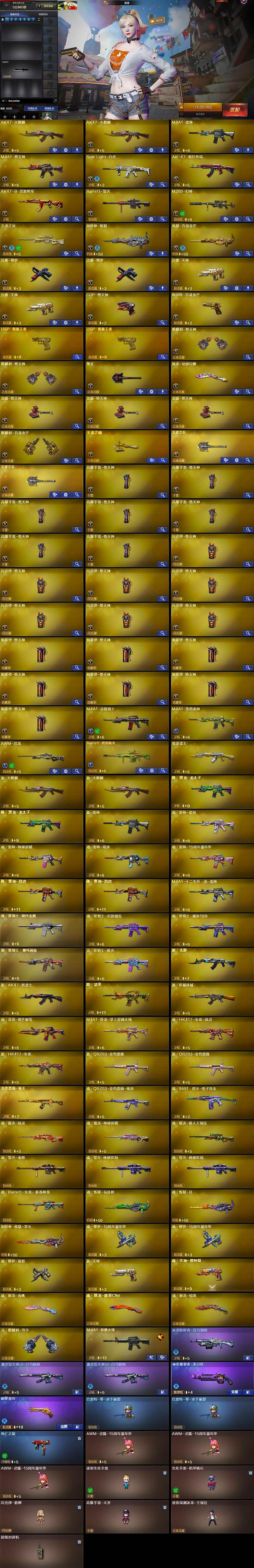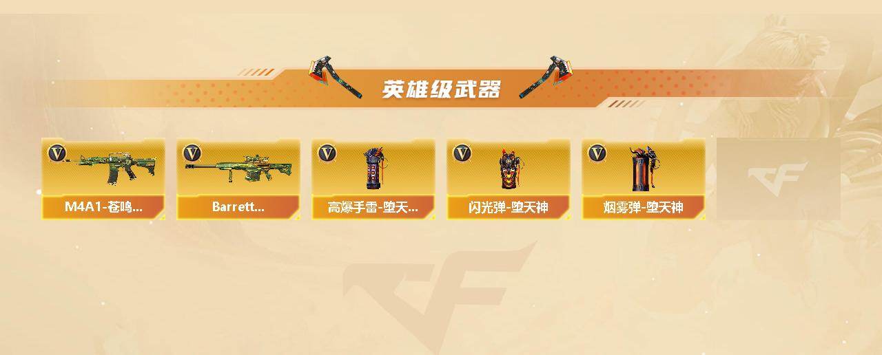 【英雄级武器】:AK47-火麒麟*2,M4A1-雷神,M4A1-堕天神,Scar Light-白虎,AK-47-猩红传说,AK47-B-常胜将军,Barrett-毁灭,M200-幻神,王者之决-觉醒版,加特林-炼狱,炼狱-百战金芒,沙鹰-修罗*2,沙鹰-天神*2,COP-堕天神,柯尔特-百战金芒,麒麟刺-堕天神*2,擎天,屠龙-动感闪耀,龙啸-堕天神*3,麒麟刺-百战金芒,王者之啸-觉醒版,王者之击-觉醒版*2,高爆手雷-堕天神*7,闪光弹-堕天神*7,烟雾弹-堕天神*7,M4A1-赤狱骑士,M4A1-苍鸣雷神,AWM-昌龙,Barrett-碧霄极光