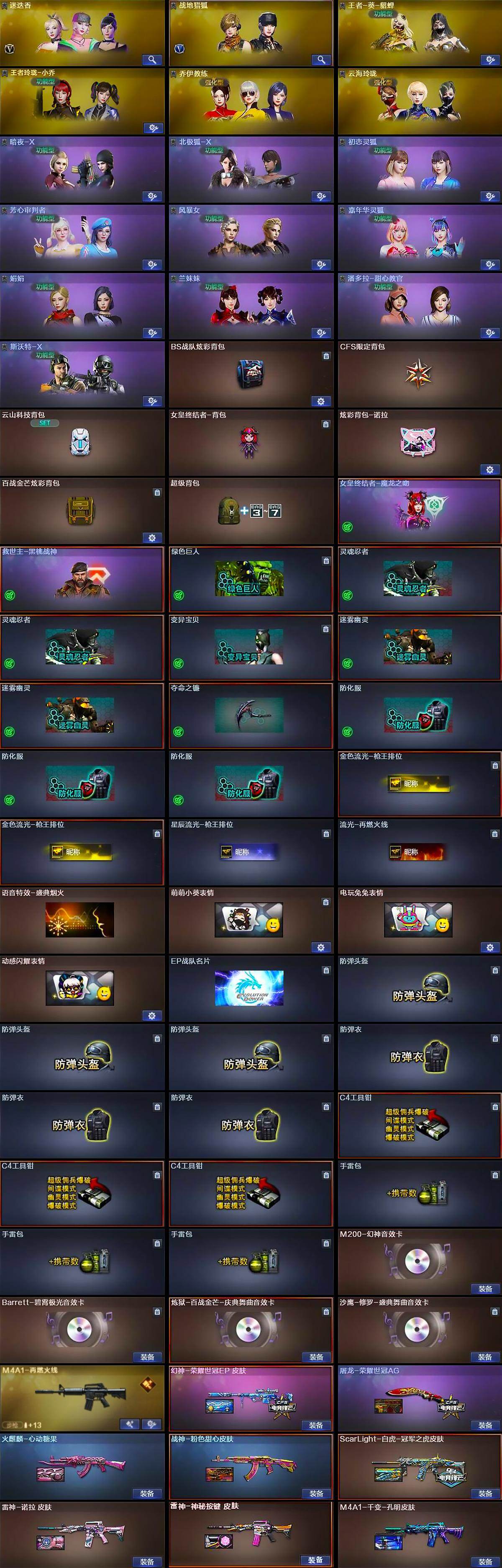 【道具】:BS战队炫彩背包,CFS限定背包,云山科技背包,女皇终结者-背包,炫彩背包-诺拉,百战金芒炫彩背包,超级背包,女皇终结者-魔龙之吻,救世主-黑桃战神,绿色巨人,灵魂忍者*2,变异宝贝,迷雾幽灵*2,夺命之镰,防化服*3,金色流光-