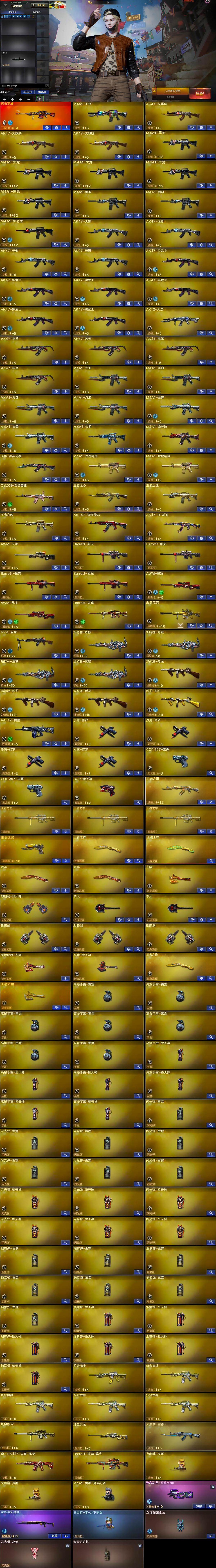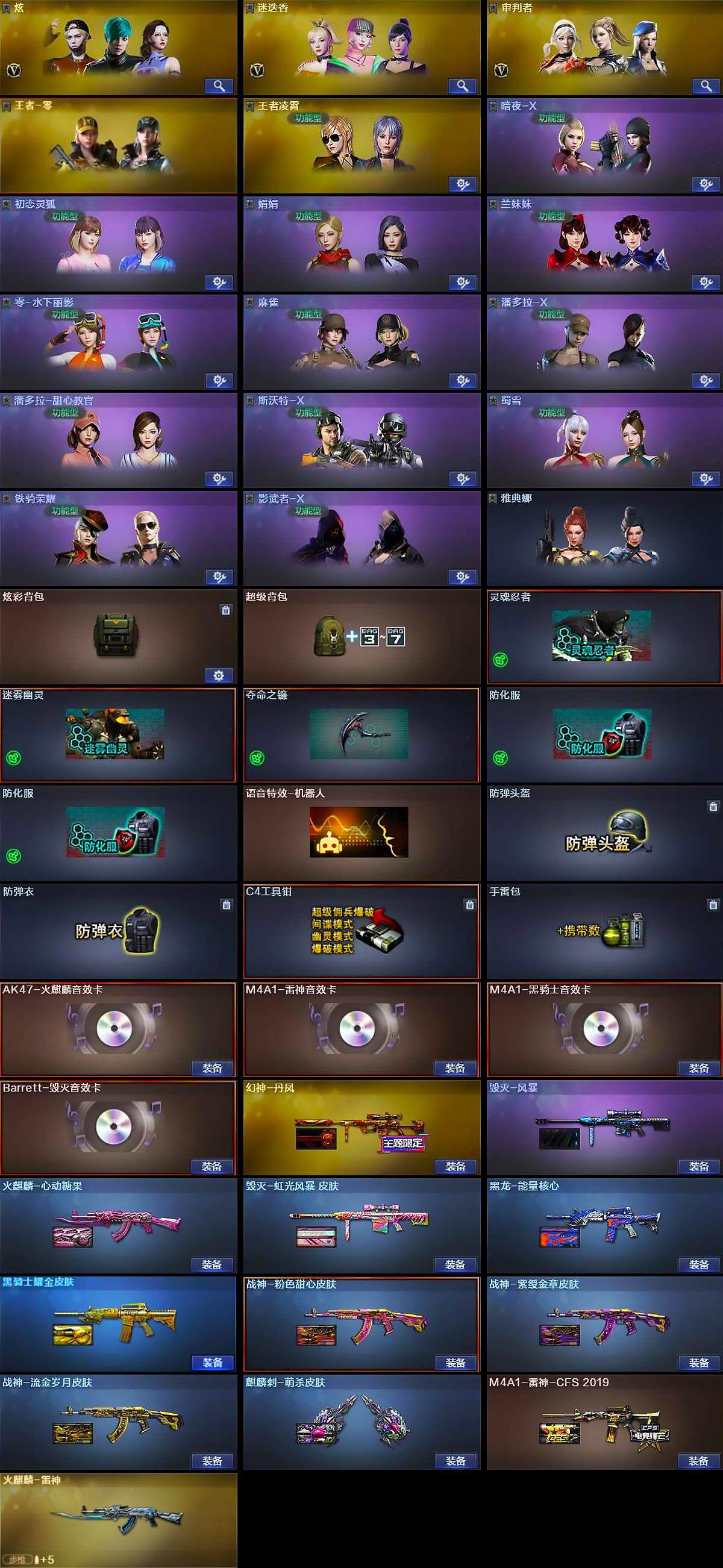 【英雄级武器】:M4A1-千变,AK47-火麒麟*3,M4A1-黑龙*5,M4A1-雷神*2,M4A1-黑骑士,AK47-无影*4,AK47-黑武士*6,AK12-天启,AK47-黑鲨*4,M4A1-龙血*4,M4A1-雷霆*2,M4A1-青龙,M4A1-堕天神,无影-神兵利器,M4A1-玫瑰精灵*2,QBZ03-金色蔷薇,王者之心-觉醒版,王者之武-觉醒版,王者之魄-觉醒版,AK-47-猩红传说,AK47-B-战神,AWM-天龙,Barrett-毁灭*2,Barrett-极光*2,AWM-裁决*2,Barrett-朱雀,王者之光-觉醒版,RPK-盘龙,加特林-炼狱*4,汤姆逊-烈龙*3,烈龙-悦心-觉醒版,AA-12-雷霆,沙鹰-修罗*4,COP-雷霆*2,COP-堕天神,屠龙*2,龙啸,麒麟刺-堕天神,擎天*2,麒麟刺*3,荣耀世冠-龙啸,龙啸-堕天神,王者之锋-觉醒版,王者之啸-觉醒版,高爆手雷-雷霆*7,高爆手雷-堕天神*6,闪光弹-雷霆*7,闪光弹-堕天神*6,烟雾弹-雷霆*7,烟雾弹
