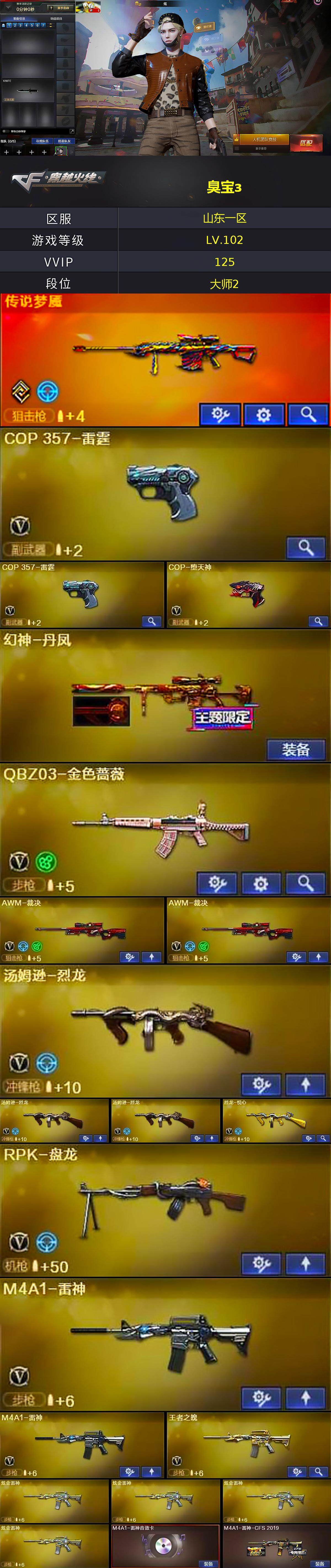 [15248777]山东一区-124V-14王者-7炫金 【传说武器】:传说梦魇 【热门武器】:传说梦魇,QBZ03-金色蔷薇,M4A1-青龙,M4A1-黑骑士,汤姆逊-烈龙*3,RPK-盘龙,加特林-炼狱*4,COP-堕天神,沙鹰-修罗*4,荣耀世冠-龙啸 【王者炫金武器】:王者之翼,王者之怒*3,王者之灵,王者之锋,王者玉锋,炫金骑士,炫金雷神*4,炫金毁灭,炫金天龙 【音效卡】:AK47-火麒麟音效卡,M4A1-雷神音效卡,M4A1-黑骑士音效卡,Barrett-毁灭音效卡 【皮肤】:幻神-丹凤,裁决-胜者为王 皮肤,M4A1-雷神-CFS 2019,火麒麟-雷神,火麒麟-心动糖果,毁灭-风暴,毁灭-虹光风暴 皮肤,黑龙-能量核心,黑骑士耀金皮肤,战神-粉色甜心皮肤,战神-紫绶金章皮肤,战神-流金岁月皮肤,麒麟刺-萌杀皮肤 【角色】:炫,迷迭香,审判者,王者-零,王者凌霄,暗夜-X,初恋灵狐,娟娟,兰妹妹,零-水下丽影,麻雀,潘多拉-X,潘多拉-甜心教官,斯沃特-X,蜀雪,铁骑荣耀,影武者-X,雅典娜 【人偶武器】:火麒麟-灵狐*2,M4A1-雷神-精英刀锋,巴雷特-零-水下丽影,迷你深渊冰龙,闪光弹-小乔 【暴走生化】:超级对讲机 【挑战大师】:致命乱世-超越Max,试炼破坏者III 【英雄级武器】:M4A1-千变,AK47-火麒麟*3,M4A1-黑龙*5,M4A1-雷神*2,M4A1-黑骑士,AK47-无影*4,AK47-黑武士*6,AK12-天启,AK47-黑鲨*4,M4A1-龙血*4,M4A1-雷霆*2,M4A1-青龙,M4A1-堕天神,无影-神兵利器,M4A1-玫瑰精灵*2,QBZ03-金色蔷薇,王者之心-觉醒版,王者之武-觉醒版,王者之魄-觉醒版,AK-47-猩红传说,AK47-B-战神,AWM-天龙,Barrett-毁灭*2,Barrett-极光*2,AWM-裁决*2,Barrett-朱雀,王者之光-觉醒版,RPK-盘龙,加特林-炼狱*4,汤姆逊-烈龙*3,烈龙-悦心-觉醒版,AA-12-雷霆,沙鹰-修罗*4,COP-雷霆*2,COP-堕天神,屠龙*2,龙啸,麒麟刺-堕天神,擎天*2,麒麟刺*3,荣耀世冠-龙啸,龙啸-堕天神,王者之锋-觉醒版,王者之啸-觉醒版,高爆手雷-雷霆*7,高爆手雷-堕天神*6,闪光弹-雷霆*7,闪光弹-堕天神*6,烟雾弹-雷霆*7,烟雾弹
