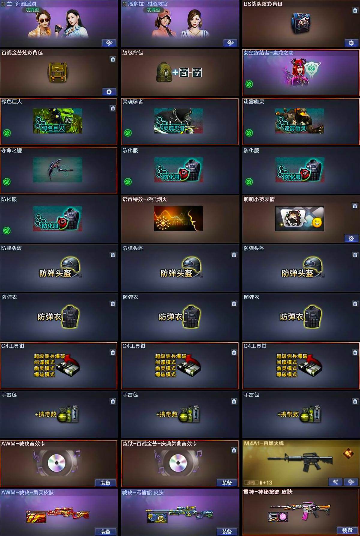 【道具】:BS战队炫彩背包,百战金芒炫彩背包,超级背包,女皇终结者-魔龙之吻,绿色巨人,灵魂忍者,迷雾幽灵,夺命之镰,防化服*3,语音特效-盛典烟火,萌萌小葵表情,防弹头盔*3,防弹衣*3,C4工具钳*3,手雷包*3