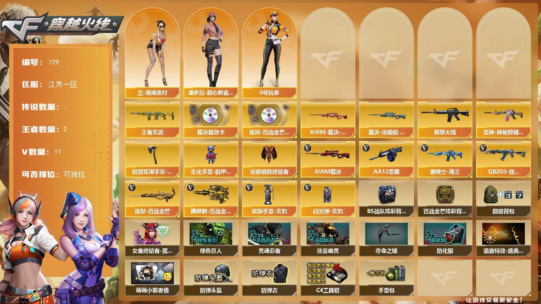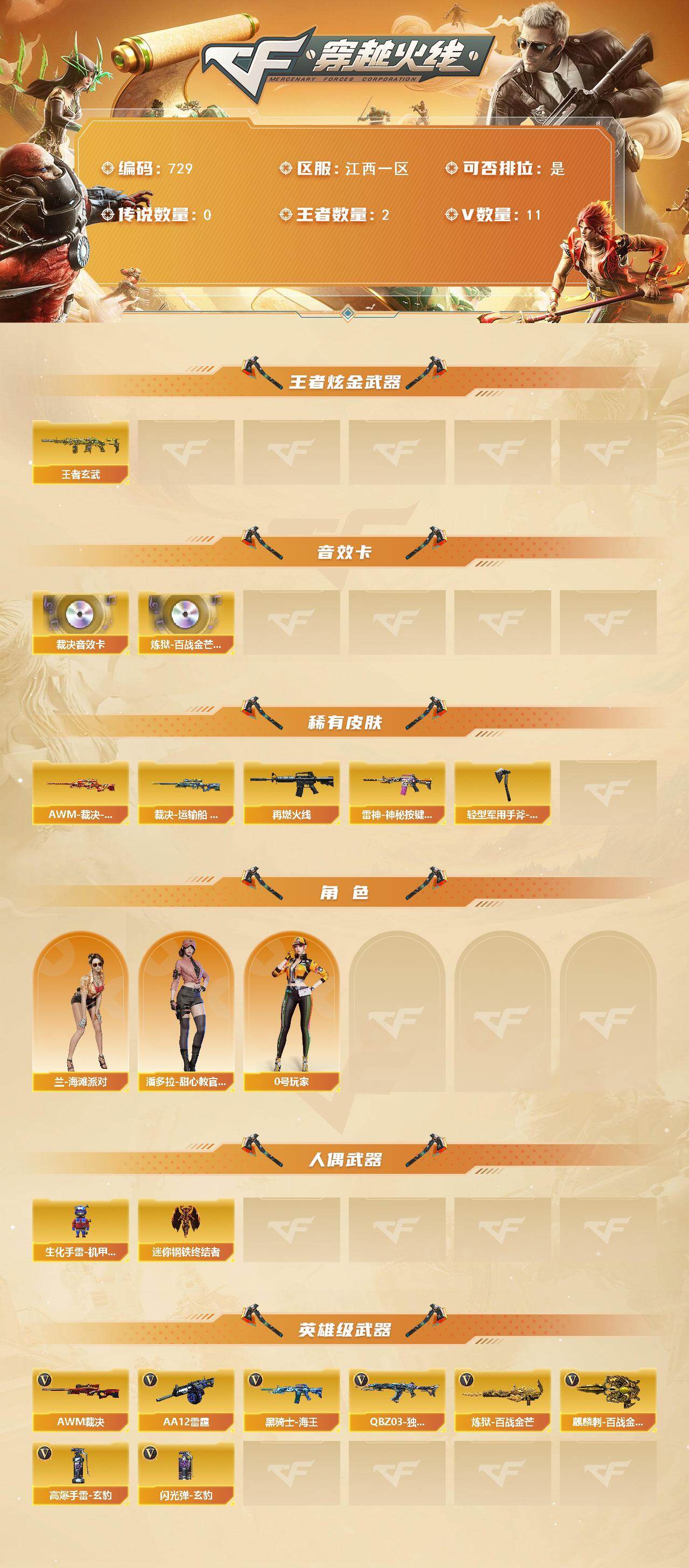 [15426951]江西一区-11V-2王者-0炫金 【王者炫金武器】:王者玄武 【音效卡】:AWM-裁决音效卡,炼狱-百战金芒-庆典舞曲音效卡 【皮肤】:AWM-裁决-凤灵皮肤,裁决-运输船 皮肤,M4A1-再燃火线,雷神-神秘按键 皮肤,轻型军用手斧-再燃火线 【角色】:兰-海滩派对,0号玩家,潘多拉-甜心教官 【人偶武器】:迷你钢铁终结者,生化手雷-机甲核心 【英雄级武器】:QBZ03-独角-III,黑骑士-海王,AWM-裁决,炼狱-百战金芒,AA-12-雷霆,麒麟刺-百战金芒,高爆手雷-玄豹,闪光弹-玄豹 【道具】:BS战队炫彩背包,百战金芒炫彩背包,超级背包,女皇终结者-魔龙之吻,绿色巨人,灵魂忍者,迷雾幽灵,夺命之镰,防化服*3,语音特效-盛典烟火,萌萌小葵表情,防弹头盔*3,防弹衣*3,C4工具钳*3,手雷包*3 【特殊枪械】:
