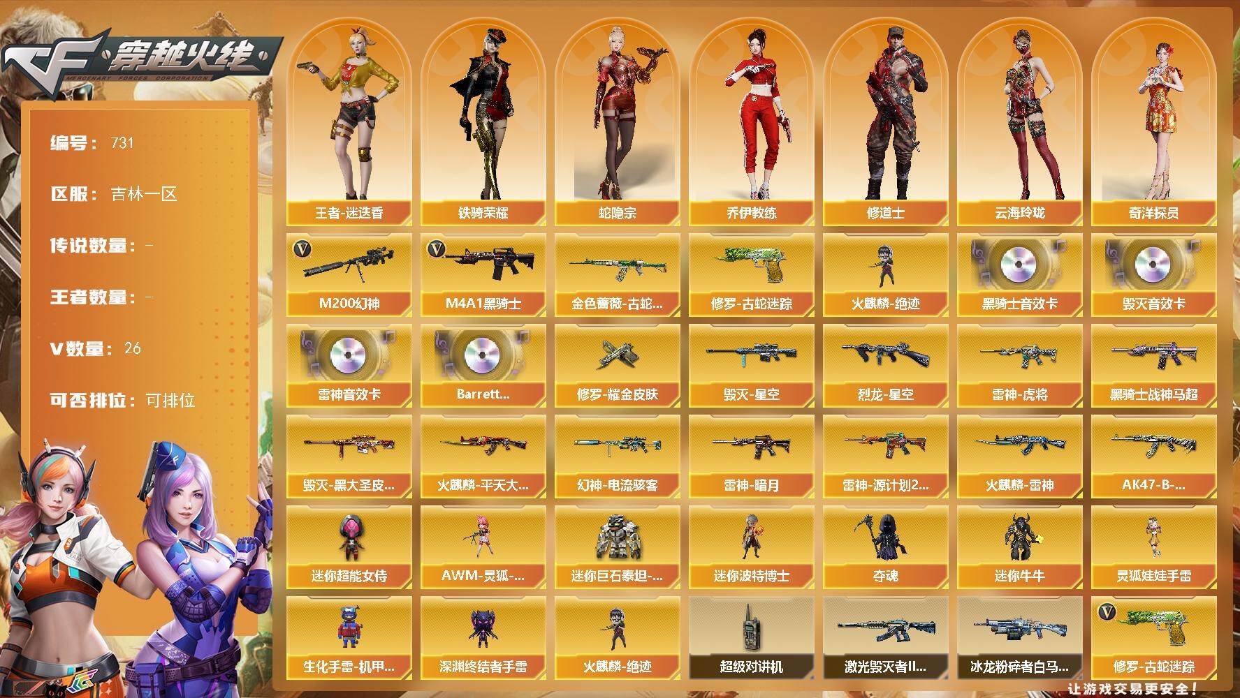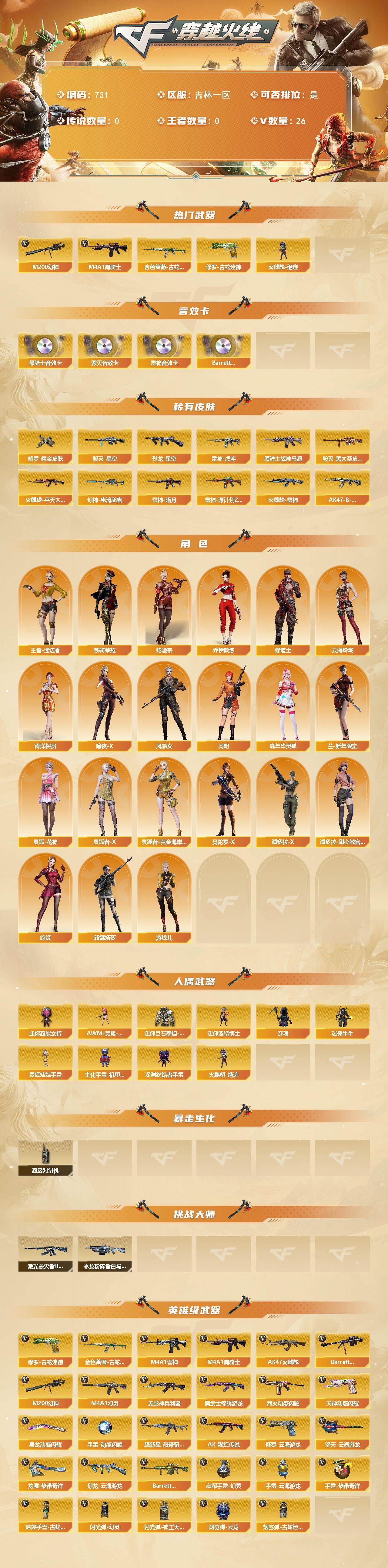 [15427359]吉林一区-26V-0王者-0炫金 【热门武器】:M200-幻神,金色蔷薇-古蛇迷踪,修罗-古蛇迷踪,M4A1-黑骑士,火麒麟-绝迹 【音效卡】:M4A1-雷神音效卡,M4A1-黑骑士音效卡,Barrett-毁灭音效卡,Barrett-碧霄极光音效卡 【皮肤】:幻神-电流骇客 皮肤,烈龙-星空,雷神-暗月,雷神-虎将,雷神-源计划2.0专属 皮肤,火麒麟-雷神,火麒麟-平天大圣,毁灭-星空,毁灭-黑大圣皮肤,黑骑士-战神马超,AK47-B-常胜将军-刘备*2,修罗耀金皮肤 【角色】:王者-迷迭香,蛇隐宗,奇洋探员,乔伊教练,修道士,云海玲珑,暗夜-X,风暴女,虎妞,嘉年华灵狐,兰-新年限定,灵狐-花神,灵狐者-X,灵狐者-黄金海岸,曼陀罗-X,潘多拉-X,潘多拉-甜心教官,蛇姬,铁骑荣耀,新娜塔莎,游珑儿 【人偶武器】:火麒麟-绝迹,AWM-灵狐-15周年嘉年华,迷你波特博士,夺魂,迷你牛牛,生化手雷-机甲核心*2,深渊终结者手雷,迷你超能女侍,迷你巨石泰坦-魔花研究所,灵狐娃娃手雷 【暴走生化】:超级对讲机 【挑战大师】:冰龙粉碎者-白马银枪,激光毁灭者III-白马银枪 【英雄级武器】:AK47-火麒麟,M4A1-雷神*2,M4A1-黑骑士,M4A1-幻灵,无影-神兵利器,黑武士-锦绣游龙,超新星-热带奇洋,金色蔷薇-古蛇迷踪,烈火-动感闪耀,AK-47-猩红传说,Barrett-毁灭,M200-幻神,烈龙-云海游龙,天神-动感闪耀,修罗-云海游龙,修罗-古蛇迷踪,屠龙-动感闪耀,擎天-云海游龙,龙啸-热带奇洋,高爆手雷-幻灵,手雷-动感闪耀,手雷-云海游龙,手雷-热带奇洋,高爆手雷-古蛇迷踪,闪光弹-幻灵,闪光弹-神工天巧,烟雾弹-云龙,烟雾弹-古蛇迷踪,Barrett-碧霄极光 【道具】:云海游龙炫彩背包,全能枪王背包,古蛇迷踪炫彩背包,奇洋探员-海龟背包,女皇终结者-背包,热带奇洋炫彩背包,超级背包,黄金生化钩,绿色巨人,灵魂忍者,迷雾幽灵,生化弹匣,夺命之镰,防化服*3,金色流光-枪王排位*2,星辰流光-枪王排位,枪王排位28赛季金色流光,枪王排位29赛季金色流光,古蛇迷踪打击特效,蛇隐宗表情,电玩兔兔表情,热带奇洋表情,动感闪耀表情,云海游龙表情,防弹头盔*5,防弹衣*5,C4工具钳*5,手雷包*5 【特殊枪械】:1黑骑士