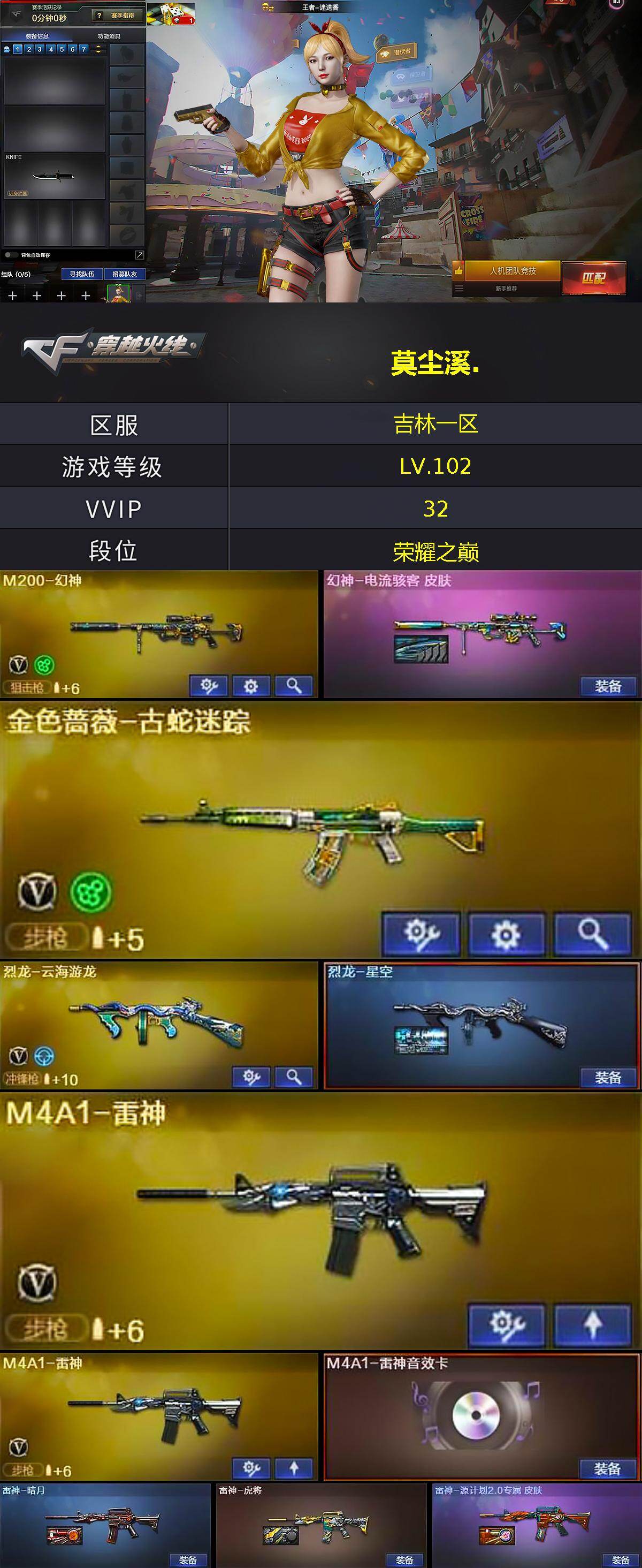 - [12954261]四川一区-27V-2王者-0炫金 【角色】:王者零-传说之路,华,铁骑荣耀 【热门武器】:M200-幻神,Scar Light-白虎 【稀有皮肤】:火麒麟-冠军之心,火麒麟-心动糖果,火麒麟-CFSTAR 【其他皮肤】:QBZ03-烛龙,QBZ03-烛龙,AK47-B-常胜将军-孙权,AK47-B-常胜将军-曹操,AK47-丹龙,AK47-齐天大圣,AK47-齐天大圣,AK47-苍龙,AK47-苍龙,AK47-苍龙,AK47-苍龙,AK47-苍龙,98K-烛龙,98K-烛龙,98K-黑金,98K-幻能朋克 【人偶武器】:迷你深渊冰龙,迷你超能女侍,AWM-灵狐-15周年嘉年华,海滩汪汪-巴雷特,迷你裂空之翼,迷你波特博士,迷你波特博士,迷你波特博士,夺魂,迷你牛牛,迷你深渊冰龙,迷你火种,迷你火种 【音效卡】:幻神音效卡 【挑战大师】:VEPR-12-金魔,冰龙粉碎者-白马银枪,巨龙咆哮-深渊金 【英雄级武器】:M4A1-雷神,无影-神兵利器,匕首-幻能朋克,闪光弹-竞技荣光,闪光弹-竞技荣光,烟雾弹-竞技荣光,烟雾弹-竞技荣光,高爆手雷-竞技荣光,高爆手雷-竞技荣光,AK47-火麒麟,AK47-火麒麟,Scar Light-白虎,M200-幻神,AK47-黑鲨,擎天-竞技荣光,擎天-竞技荣光 【特殊枪械】:1白虎,0黑骑士,0烈龙,0盘龙,0炼狱,0蝴蝶斯泰尔