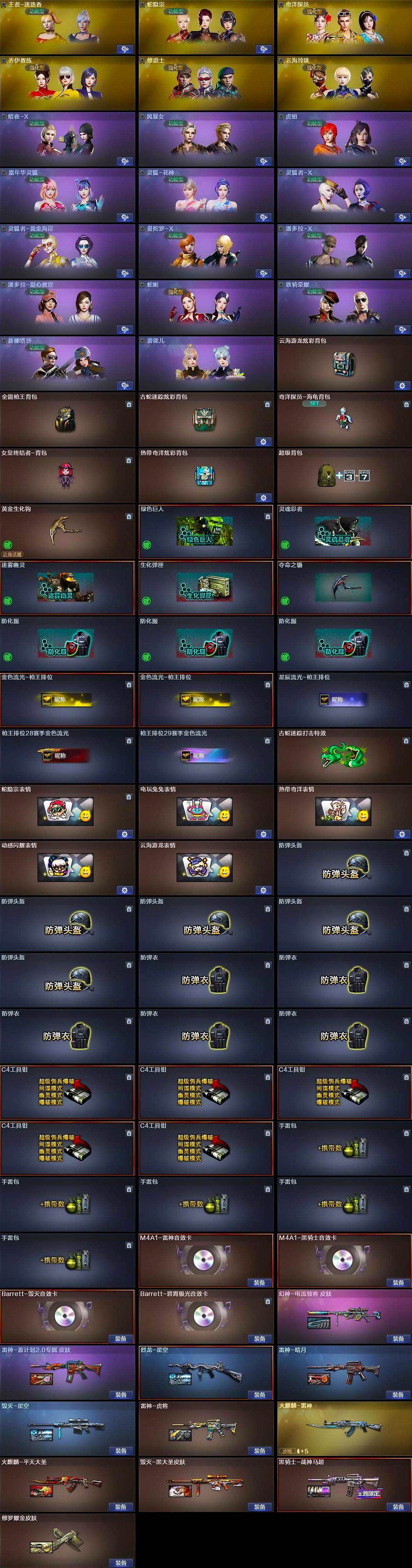 【道具】:云海游龙炫彩背包,全能枪王背包,古蛇迷踪炫彩背包,奇洋探员-海龟背包,女皇终结者-背包,热带奇洋炫彩背包,超级背包,黄金生化钩,绿色巨人,灵魂忍者,迷雾幽灵,生化弹匣,夺命之镰,防化服*3,金色流光-枪王排位*2,星辰流光-枪王排位,枪王排位28赛季金色流光,枪王排位29赛季金色流光,古蛇迷踪打击特效,蛇隐宗表情,电玩兔兔表情,热带奇洋表情,动感闪耀表情,云海游龙表情,防弹头盔*5,防弹衣*5,C4工具钳*5,手雷包*5