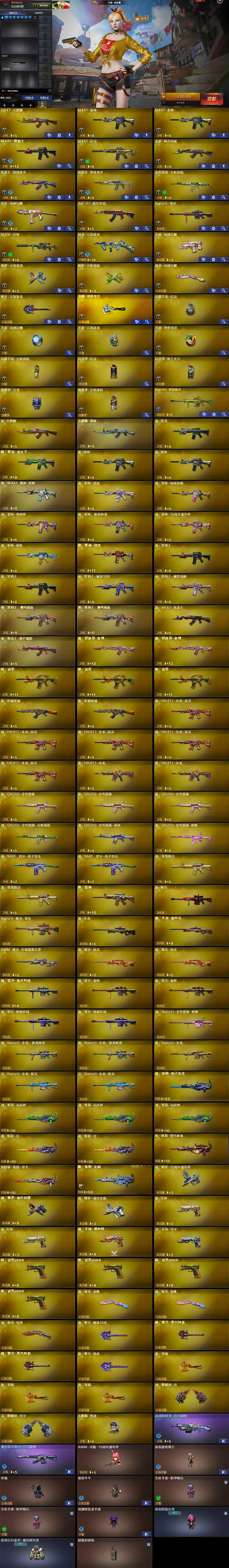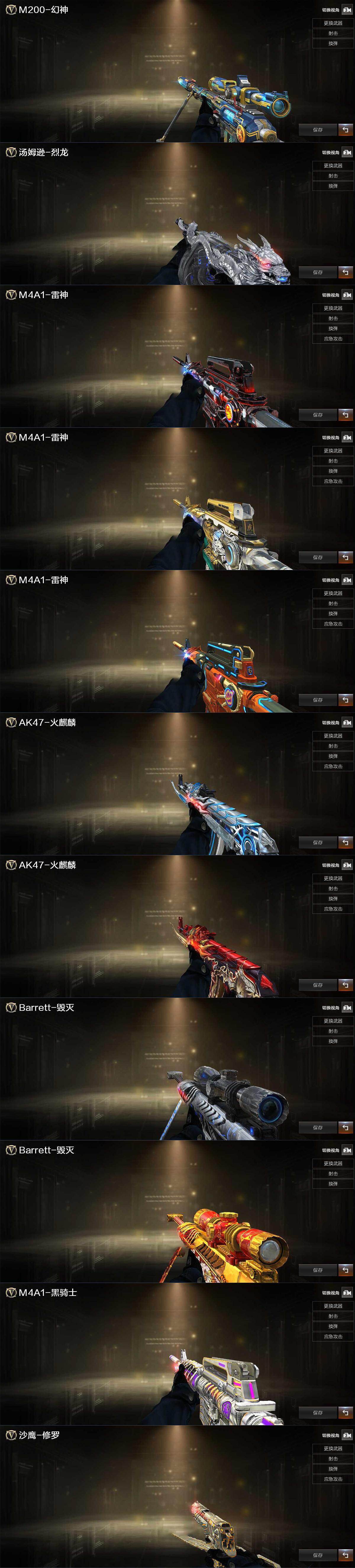 【英雄级武器】:AK47-火麒麟,M4A1-雷神*2,M4A1-黑骑士,M4A1-幻灵,无影-神兵利器,黑武士-锦绣游龙,超新星-热带奇洋,金色蔷薇-古蛇迷踪,烈火-动感闪耀,AK-47-猩红传说,Barrett-毁灭,M200-幻神,烈龙-云海游龙,天神-动感闪耀,修罗-云海游龙,修罗-古蛇迷踪,屠龙-动感闪耀,擎天-云海游龙,龙啸-热带奇洋,高爆手雷-幻灵,手雷-动感闪耀,手雷-云海游龙,手雷-热带奇洋,高爆手雷-古蛇迷踪,闪光弹-幻灵,闪光弹-神工天巧,烟雾弹-云龙,烟雾弹-古蛇迷踪,Barrett-碧霄极光