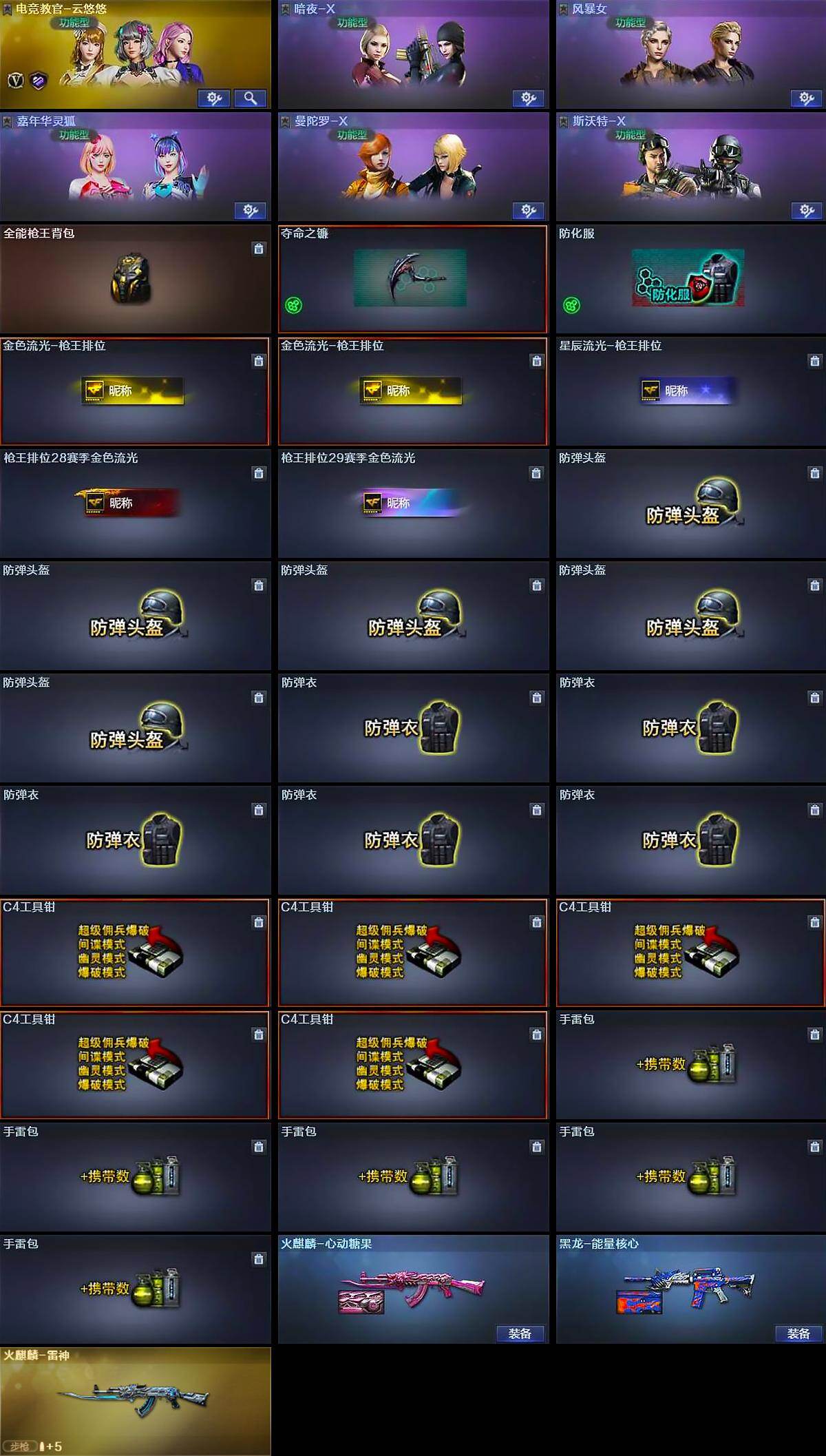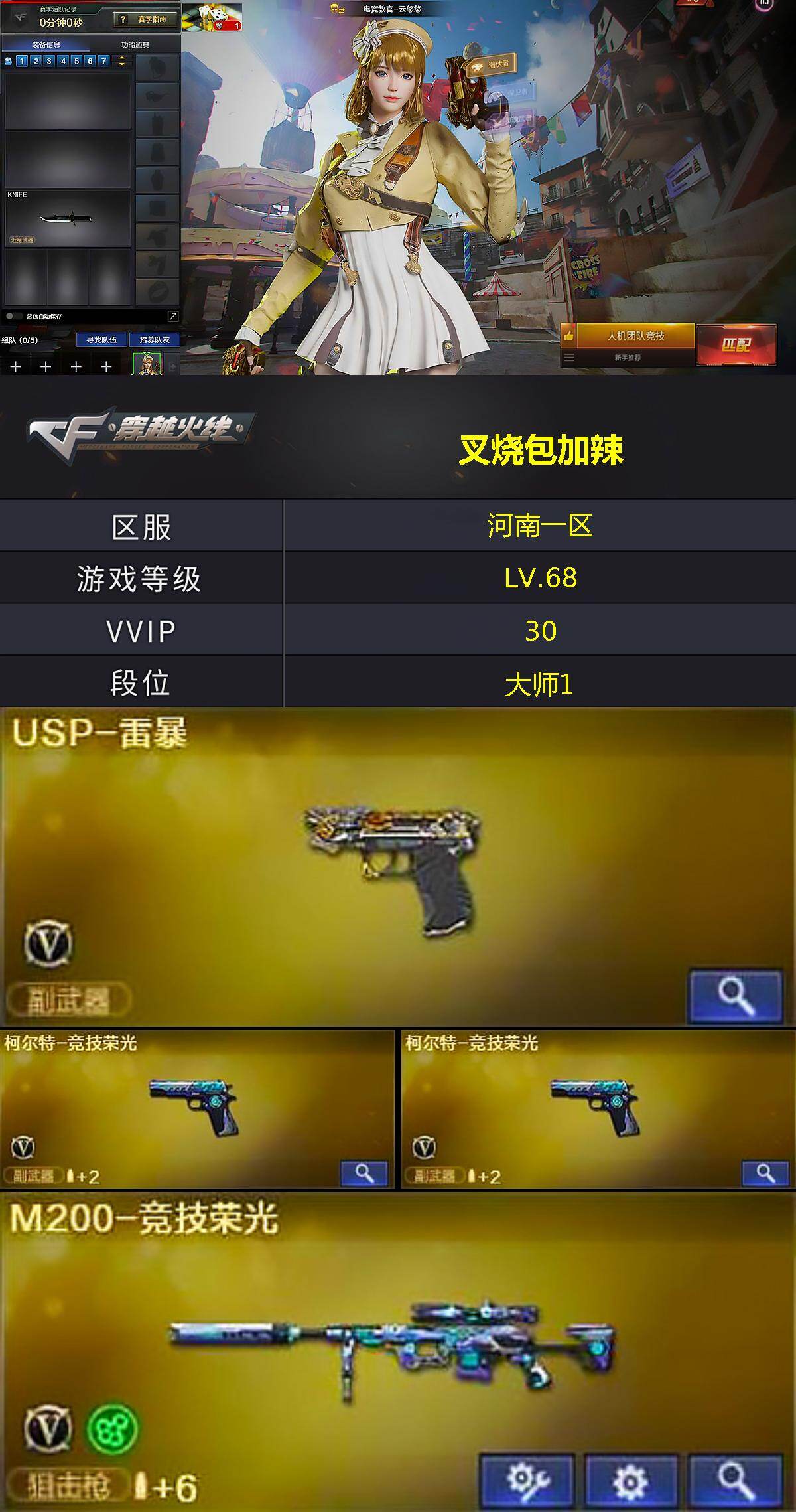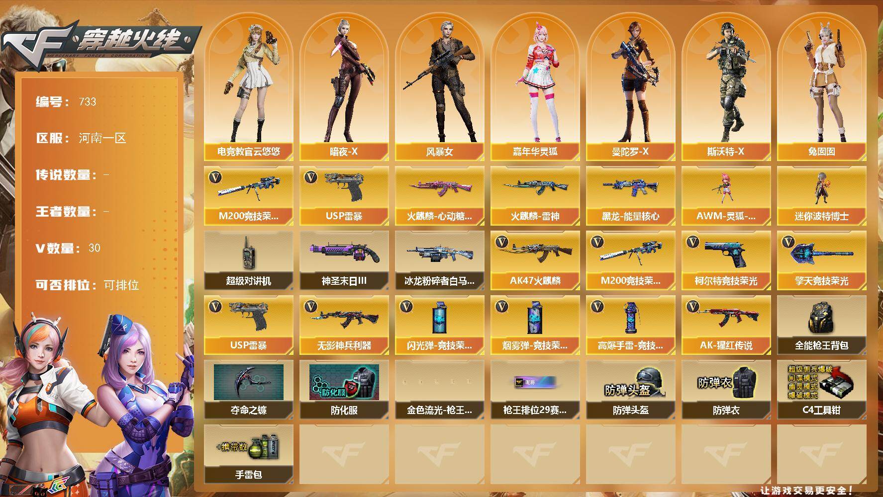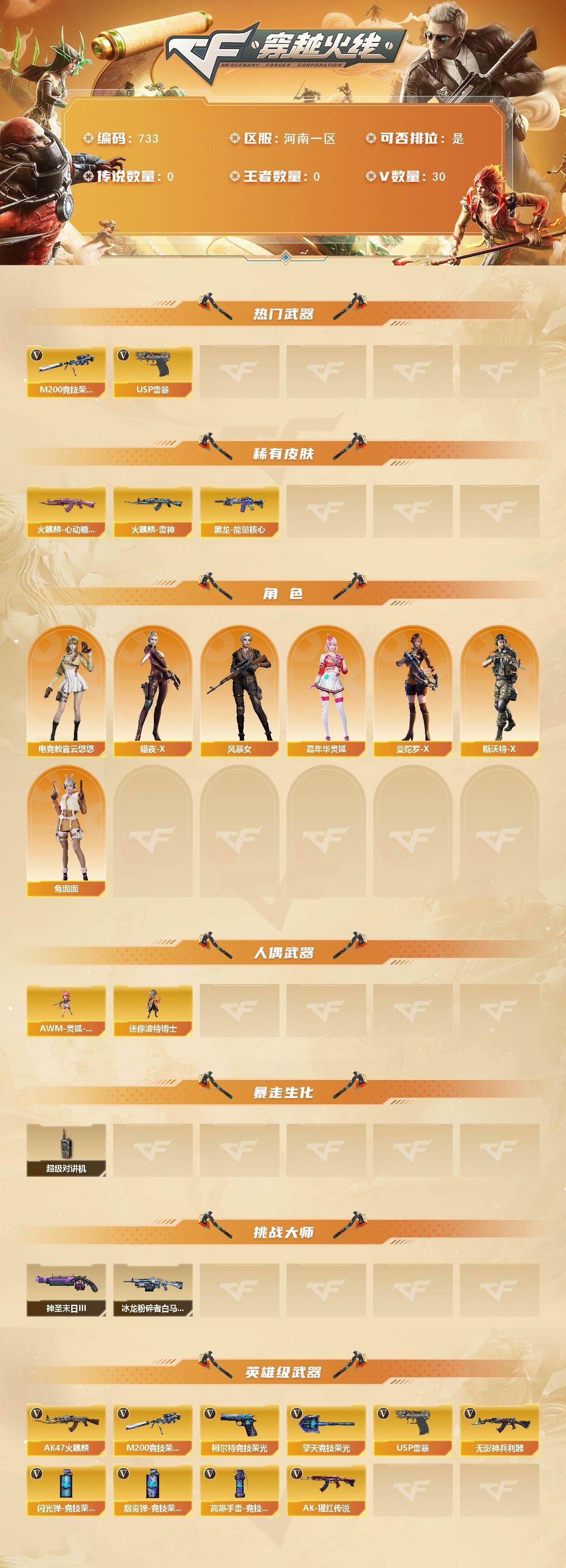 [15427835]河南一区-30V-0王者-0炫金 【热门武器】:M200-竞技荣光,USP-雷暴 【皮肤】:火麒麟-雷神,火麒麟-心动糖果,黑龙-能量核心 【角色】:电竞教官-云悠悠,暗夜-X,风暴女,嘉年华灵狐,曼陀罗-X,斯沃特-X,兔囡囡 【人偶武器】:AWM-灵狐-15周年嘉年华,迷你波特博士 【暴走生化】:超级对讲机 【挑战大师】:冰龙粉碎者-白马银枪,神圣爆裂者-末日III 【英雄级武器】:AK47-火麒麟,无影-神兵利器,AK-47-猩红传说,M200-竞技荣光,USP-雷暴,柯尔特-竞技荣光*2,擎天-竞技荣光*3,高爆手雷-竞技荣光*6,闪光弹-竞技荣光*6,烟雾弹-竞技荣光*6 【道具】:全能枪王背包,夺命之镰,防化服,金色流光-枪王排位*2,星辰流光-枪王排位,枪王排位28赛季金色流光,枪王排位29赛季金色流光,防弹头盔*5,防弹衣*5,C4工具钳*5,手雷包*5 【特殊枪械】: