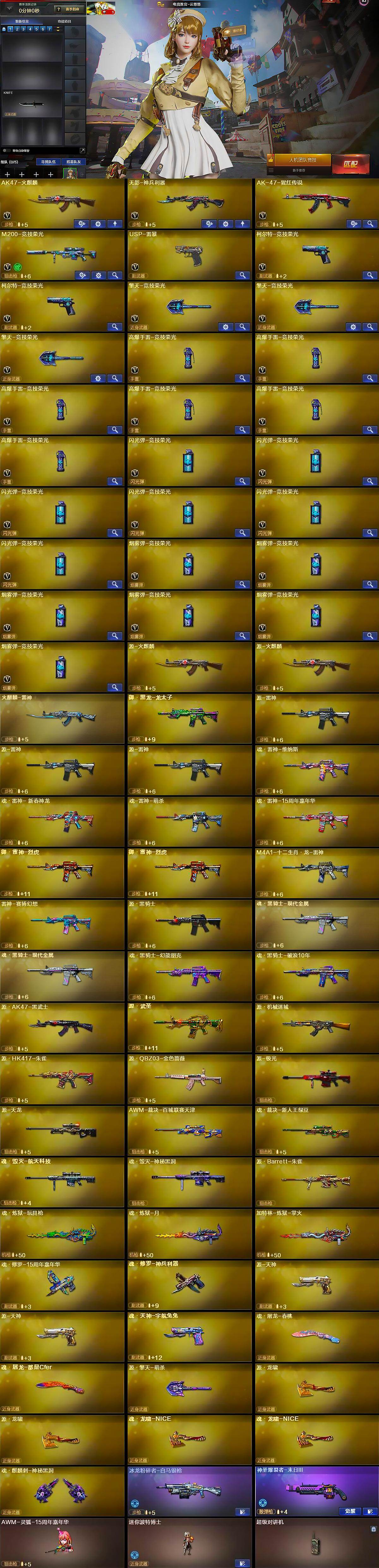 【英雄级武器】:AK47-火麒麟,无影-神兵利器,AK-47-猩红传说,M200-竞技荣光,USP-雷暴,柯尔特-竞技荣光*2,擎天-竞技荣光*3,高爆手雷-竞技荣光*6,闪光弹-竞技荣光*6,烟雾弹-竞技荣光*6