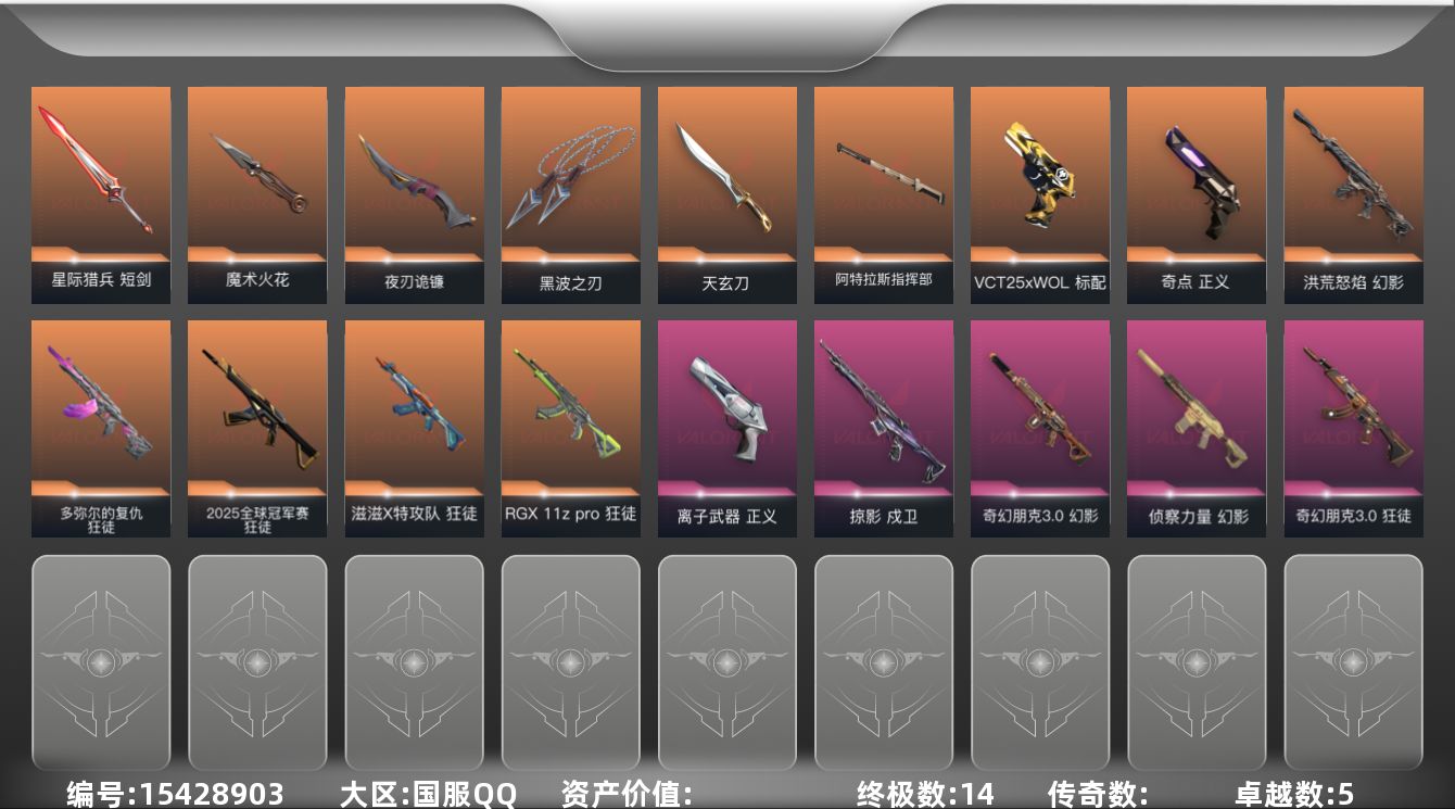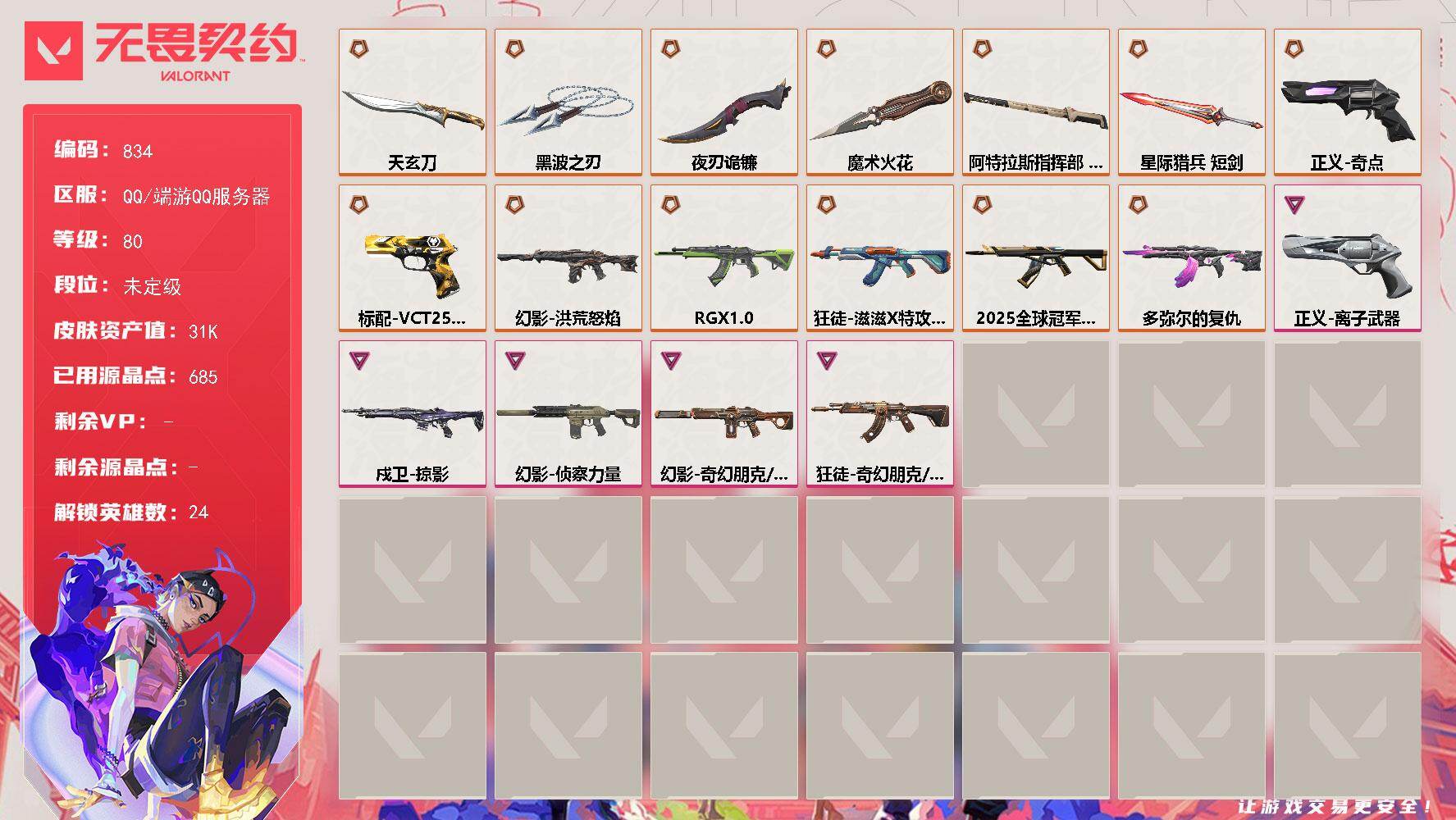 [15428903]【英雄】:幻棱,炼狱,维斯,暮蝶,壹决,铁臂,捷风,雷兹,幽影,不死鸟,贤者,猎枭,零,芮娜,奇乐,尚勃勒,霓虹,斯凯,夜露,K/O,盖可,黑梦,钢锁 【近战武器】:近战武器-魔术火花,近战武器-黑波之刃,近战武器-天玄刀,近战武器-夜刃诡镰,近战武器-阿特拉斯指挥部 甩棍,近战武器-星际猎兵 短剑,近战武器-魔术火花 【狂徒】:狂徒-2025全球冠军赛,狂徒-RGX 11z Pro,狂徒-滋滋X特攻队,狂徒-多弥尔的复仇,狂徒-奇幻朋克//3.0 【幻影】:幻影-洪荒怒焰,幻影-侦察力量,幻影-奇幻朋克//3.0 【戍卫】:戍卫-掠影 【VCT手枪】:标配-VCT25 x WOL 【正义】:正义-奇点,正义-离子武器 【卡面】:热舞环节 卡面,Clutch 卡面,梦幻奶茶 卡面,零点嗅探设计图 卡面,无畏契约GO!第一卷:芮娜 卡面,无畏契约GO!第一卷:零 卡面,《双城之战》金克丝 卡面,代号红色 卡面,新兵报到 卡面,V契约 卡面,无畏契约 卡面 【喷漆】:买装还是存钱 喷漆,松叶 喷漆,胜利属于无畏契约 喷漆,GLHF 喷漆,无畏契约 喷漆 【挂饰】:瞬云履 挂饰,天外飞客 挂饰,无畏契约 纪念币 挂饰