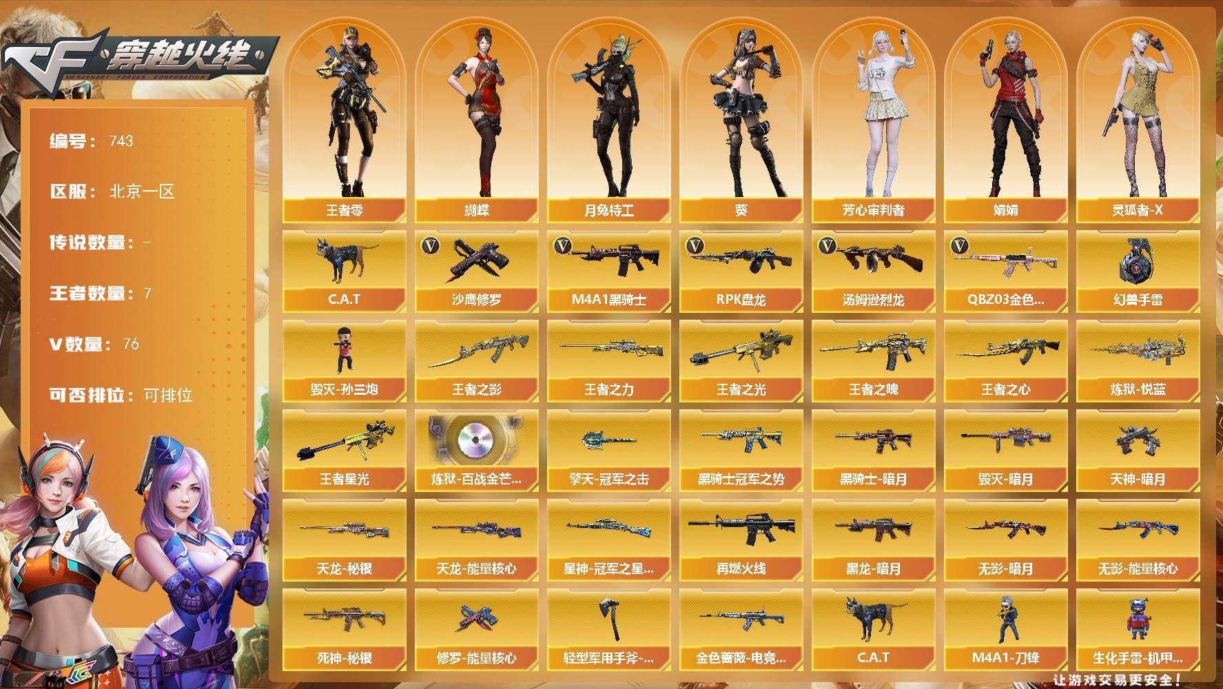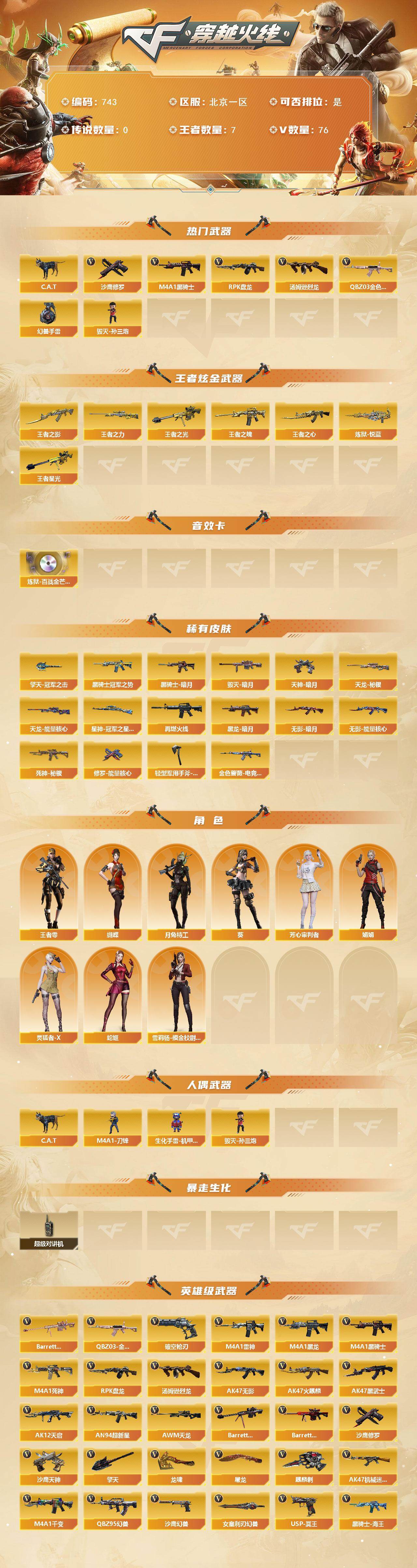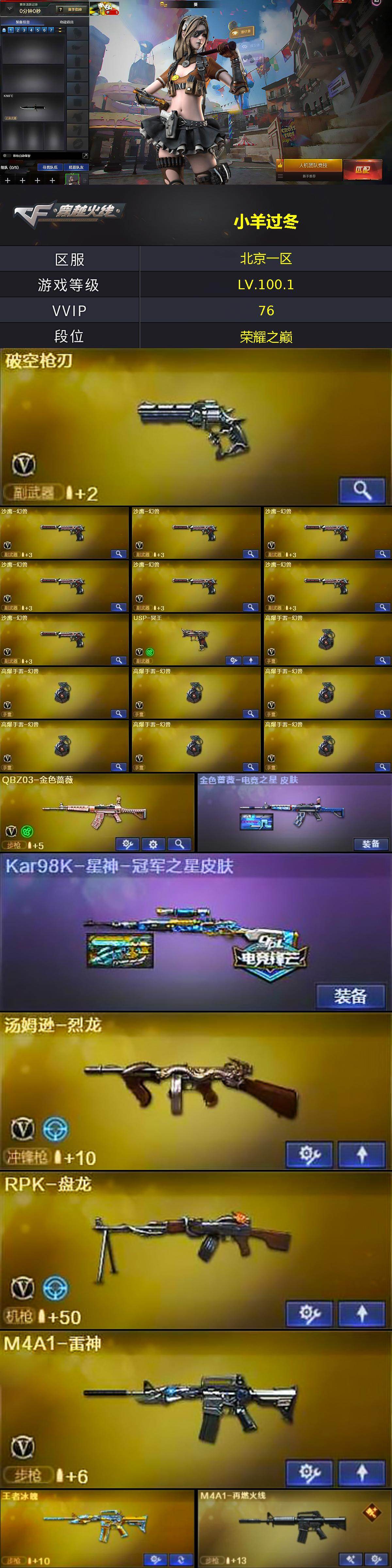 [15429199]北京一区-76V-7王者-0炫金 【热门武器】:QBZ03-金色蔷薇,C.A.T,M4A1-黑骑士*2,汤姆逊-烈龙,RPK-盘龙,毁灭-孙三炮,沙鹰-修罗*3,高爆手雷-幻兽*7 【王者炫金武器】:王者之影,王者之魄,王者之心,王者之光,王者之力,王者星光,炼狱-悦蓝 【音效卡】:炼狱-百战金芒-庆典舞曲音效卡 【皮肤】:金色蔷薇-电竞之星 皮肤,Kar98K-星神-冠军之星皮肤,M4A1-再燃火线,毁灭-暗月*3,黑龙-暗月,黑骑士-暗月,黑骑士-冠军之势,无影-暗月,无影-能量核心,死神-秘银*3,天龙-秘银,天龙-能量核心,修罗-能量核心,天神-暗月*4,轻型军用手斧-再燃火线,擎天-冠军之击 【角色】:葵,蝴蝶,月兔特工,王者-零,芳心审判者,娟娟,灵狐者-X,蛇姬,雪莉杨-摸金校尉 【人偶武器】:毁灭-孙三炮,C.A.T,M4A1-刀锋,生化手雷-机甲核心 【暴走生化】:超级对讲机 【英雄级武器】:M4A1-千变,AK47-火麒麟,M4A1-黑龙*2,M4A1-雷神,M4A1-黑骑士*2,AK47-无影*2,M4A1-死神,AK47-黑武士,AK12-天启,AN94-超新星,AK47-机械迷城,QBZ95-幻兽,QBZ03-金色蔷薇,黑骑士-海王,AWM-天龙,Barrett-毁灭*2,Barrett-极光,Barrett-金色蔷薇,RPK-盘龙,炼狱-百战金芒,汤姆逊-烈龙,沙鹰-修罗*3,沙鹰-天神,破空枪刃,沙鹰-幻兽*7,USP-冥王,屠龙*2,龙啸*2,擎天,麒麟刺,女皇利刃-幻兽,麒麟刺-百战金芒,高爆手雷-幻兽*7,闪光弹-幻兽*7,烟雾弹-幻兽*7 【道具】:BS战队炫彩背包,EP战队炫彩背包,云山科技背包,亚洲杯纪念炫彩背包,炫彩背包,百战金芒炫彩背包,超级背包,女皇终结者-魔龙之吻,救世主-黑桃战神,黄金生化钩,绿色巨人,灵魂忍者,迷雾幽灵,夺命之镰*2,防化服*3,枪王排位29赛季金色流光,语音特效-盛典烟火,蝴蝶表情,萌萌小葵表情,防弹头盔*3,防弹衣*3,C4工具钳*3,手雷包*3 【特殊枪械】:2黑骑士,1烈龙,1盘龙