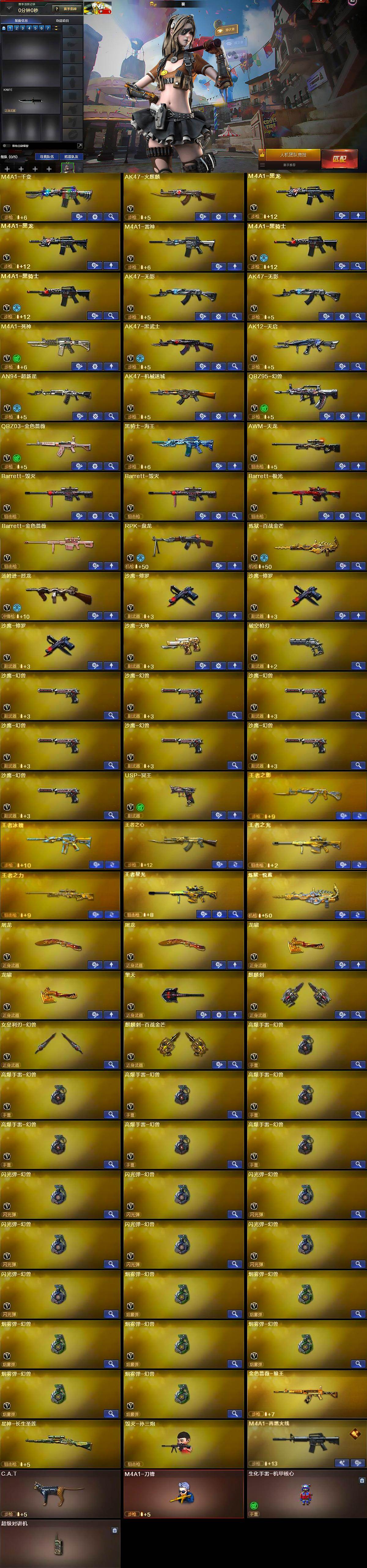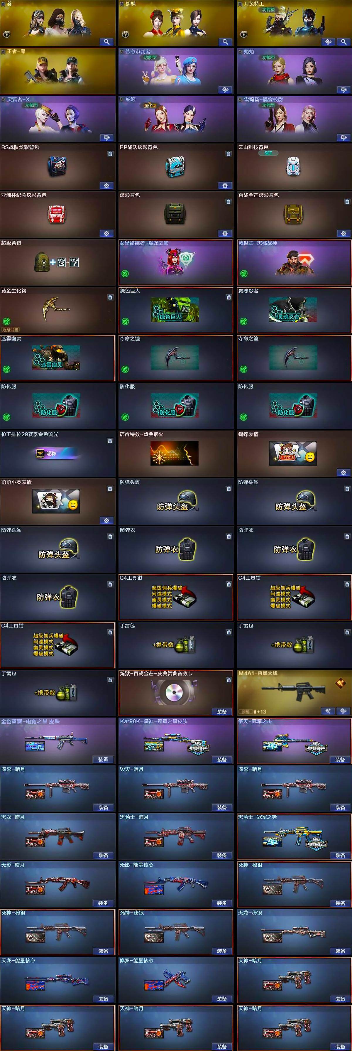 【英雄级武器】:M4A1-千变,AK47-火麒麟,M4A1-黑龙*2,M4A1-雷神,M4A1-黑骑士*2,AK47-无影*2,M4A1-死神,AK47-黑武士,AK12-天启,AN94-超新星,AK47-机械迷城,QBZ95-幻兽,QBZ03-金色蔷薇,黑骑士-海王,AWM-天龙,Barrett-毁灭*2,Barrett-极光,Barrett-金色蔷薇,RPK-盘龙,炼狱-百战金芒,汤姆逊-烈龙,沙鹰-修罗*3,沙鹰-天神,破空枪刃,沙鹰-幻兽*7,USP-冥王,屠龙*2,龙啸*2,擎天,麒麟刺,女皇利刃-幻兽,麒麟刺-百战金芒,高爆手雷-幻兽*7,闪光弹-幻兽*7,烟雾弹-幻兽*7
