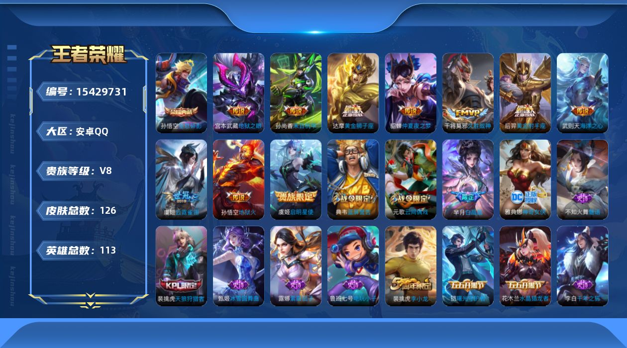 [15429731]安卓Q-V8-荣耀黄金IV段位-109英雄-126皮肤-1典藏皮肤-1典藏英雄-10传说-44史诗