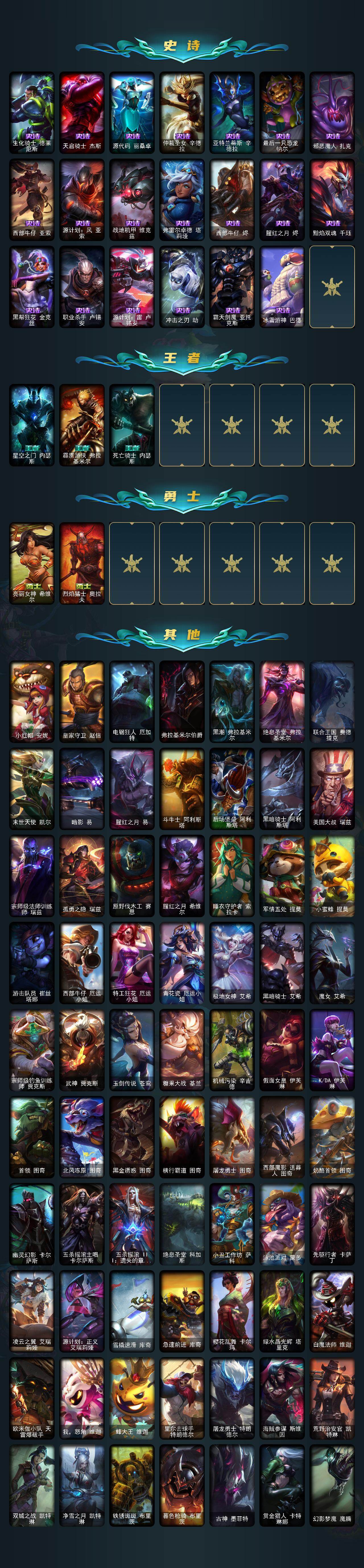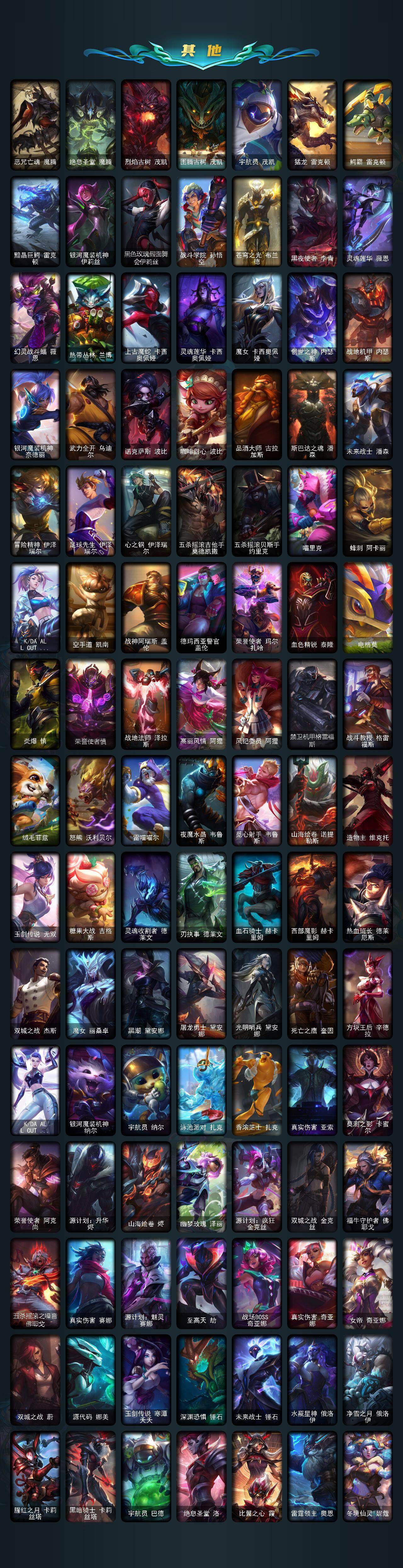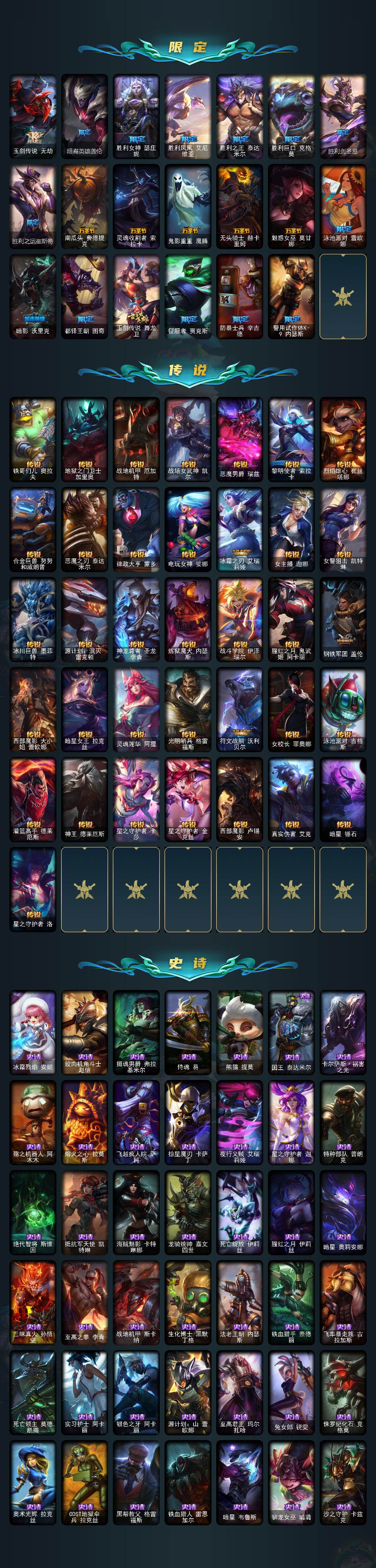 【冰雪限定】:圣诞开心鬼提莫,冰封王子蒙多,邪恶圣诞老人维迦,圣诞驯鹿克格莫,魄罗骑士瑟庄妮,冰雪节辛吉德,北极星神黛安娜