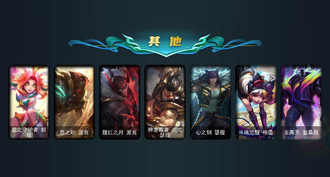 【传说皮肤】:铁哥们儿奥拉夫,地狱之门卫士加里奥,战地机甲厄加特,战场女武神凯尔,