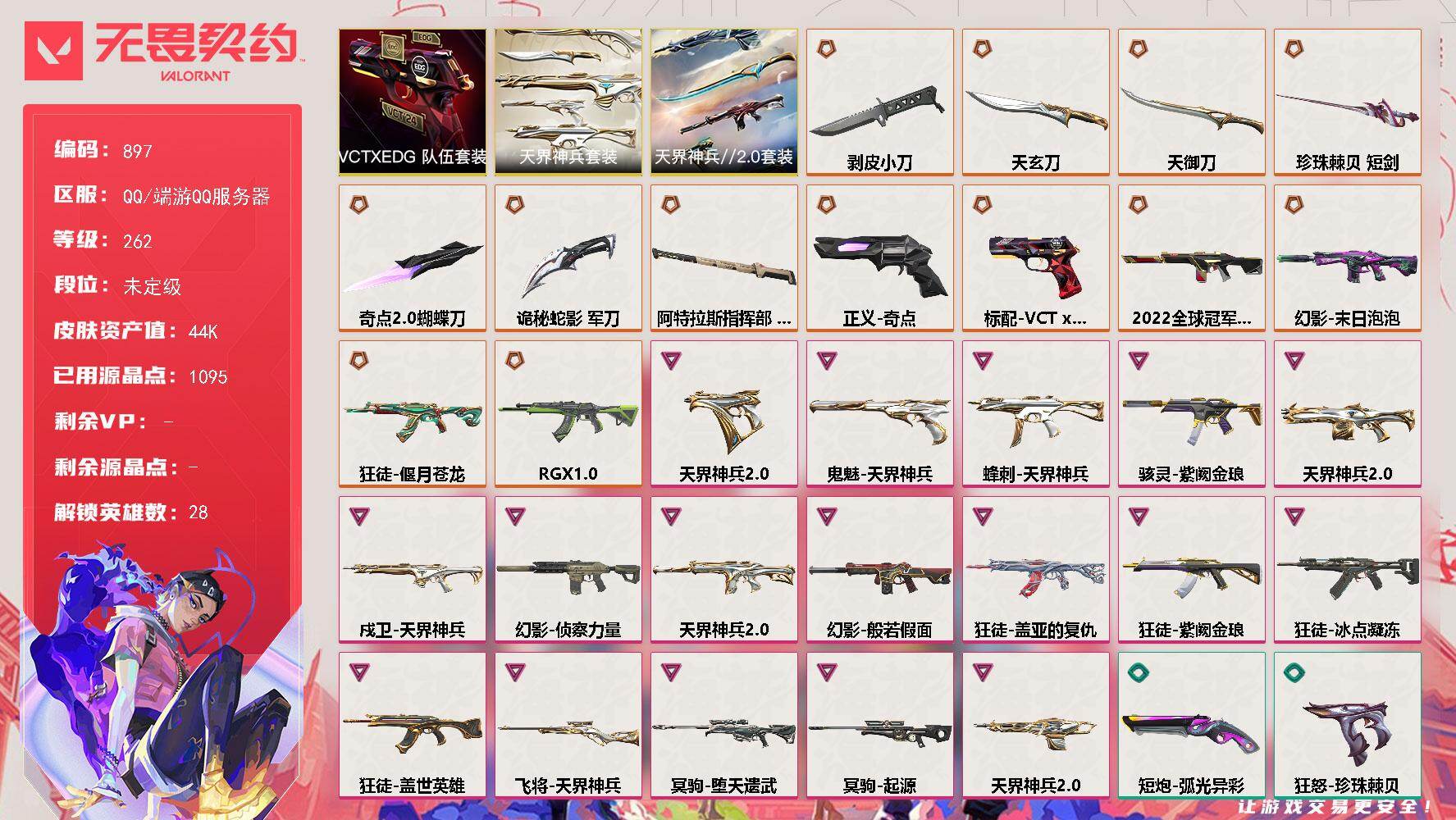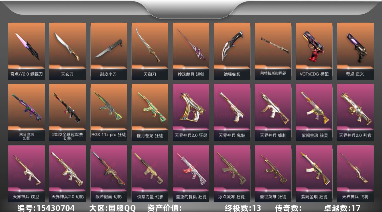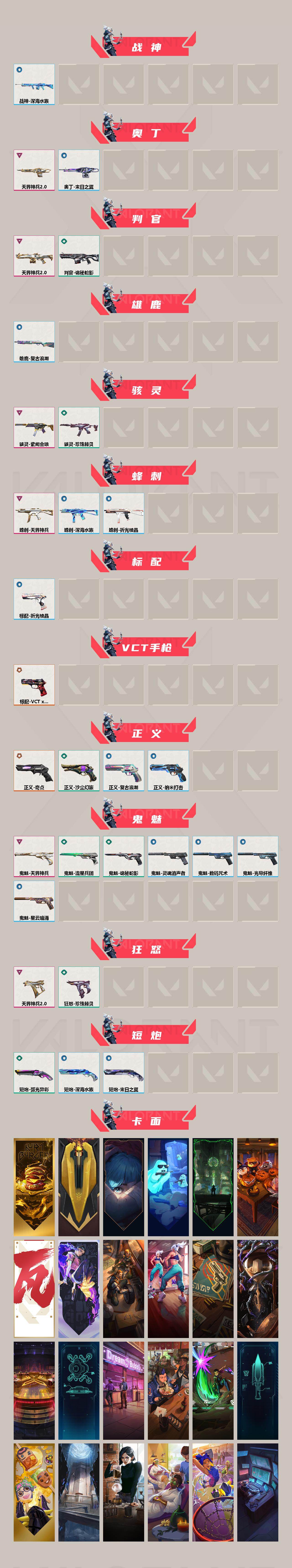 [15430704]【套装】:VCTxEDG 队伍套装,天界神兵//2.0套装,天界神兵套装 【英雄】:幻棱,炼狱,维斯,暮蝶,钛狐,壹决,铁臂,捷风,雷兹,幽影,不死鸟,贤者,猎枭,蝰蛇,零,芮娜,奇乐,尚勃勒,霓虹,斯凯,夜露,星礈,K/O,海神,盖可,黑梦,钢锁 【近战武器】:近战武器-剥皮小刀,近战武器-奇点//2.0 蝴蝶刀,近战武器-珍珠棘贝 短剑,近战武器-天玄刀,近战武器-天御刀,近战武器-诡秘蛇影 军刀,近战武器-阿特拉斯指挥部 甩棍 【狂徒】:狂徒-偃月苍龙,狂徒-RGX 11z Pro,狂徒-冰点凝冻,狂徒-盖世英雄,狂徒-盖亚的复仇,狂徒-紫阙金琅,狂徒-诡秘蛇影 【幻影】:幻影-2022全球冠军赛,幻影-末日泡泡,幻影-般若假面,幻影-天界神兵//2.0,幻影-侦察力量,幻影-珍珠棘贝,幻影-末日之翼 【戍卫】:戍卫-天界神兵,戍卫-珍珠棘贝,戍卫-折光棱晶 【獠犬】:獠犬-金纹世家,獠犬-复古浪潮 【冥驹】:冥驹-堕天遗武,冥驹-起源,冥驹-复古浪潮,冥驹-沙场老兵 【飞将】:飞将-天界神兵,飞将-末日之翼 【莽侠】:莽侠-诡秘蛇影,莽侠-深海水族 【战神】:战神-深海水族 【奥丁】:奥丁-天界神兵//2.0,奥丁-末日之翼 【判官】:判官-天界神兵//2.0,判官-诡秘蛇影 【雄鹿】:雄鹿-复古浪潮 【骇灵】:骇灵-紫阙金琅,骇灵-珍珠棘贝 【蜂刺】:蜂刺-天界神兵,蜂刺-深海水族,蜂刺-折光棱晶 【标配】:标配-折光棱晶 【VCT手枪】:标配-VCT x EDG 【正义】:正义-奇点,正义-沙尘幻旅,正义-复古浪潮,正义-纳米打击 【鬼魅】:鬼魅-天界神兵,鬼魅-流星兵团,鬼魅-诡秘蛇影,鬼魅-光导纤维,鬼魅-灵魂消声者,鬼魅-数码咒术,鬼魅-星云暗涌 【狂怒】:狂怒-天界神兵//2.0,狂怒-珍珠棘贝 【短炮】:短炮-弧光异彩,短炮-深海水族,短炮-末日之翼 【卡面】:终章:激斗汉堡 卡面,进入射程 卡面,《双城之战》拥抱 卡面,精灵大战 卡面,欢迎来到底城 卡面,南瓜盛典 卡面,VCT CN首冠 卡面,无畏契约:暮蝶 卡面,修车达人 卡面,热舞环节 卡面,正义的化身 卡面,时间到 卡面,最高舞台 卡面,声感陷阱设计图 卡面,梦幻奶茶 卡面,趁热吃 卡面,源能反应 卡面,零点嗅探设计图 卡面,终章:瓦娃脸雪糕 卡面,表象之下 卡面,虹吸式咖啡壶 卡面