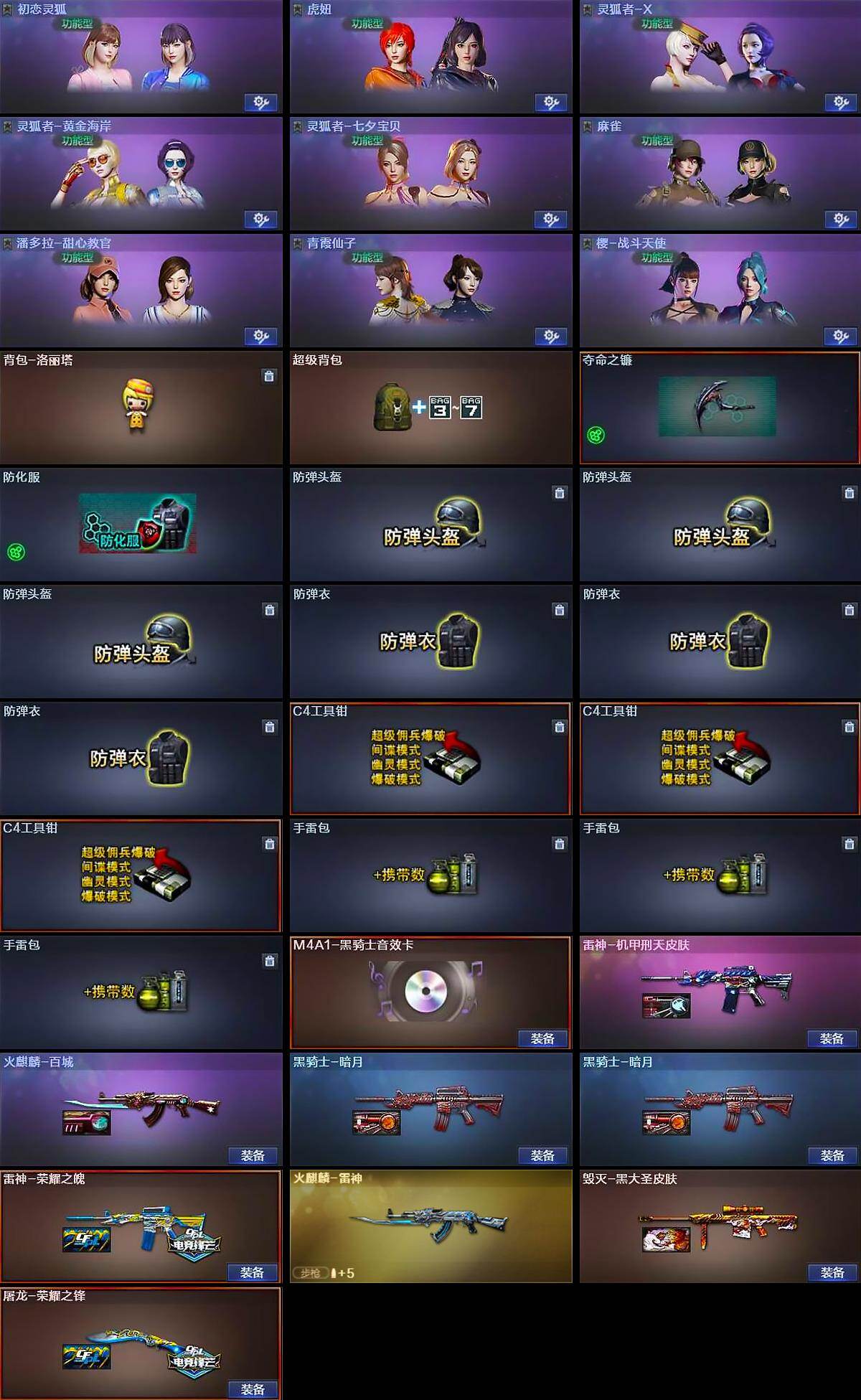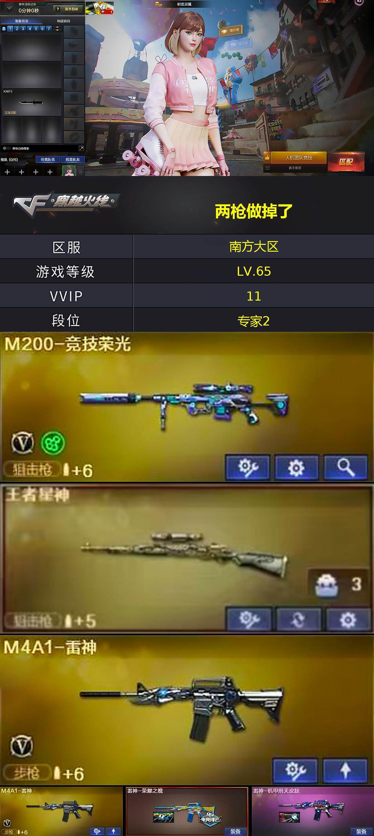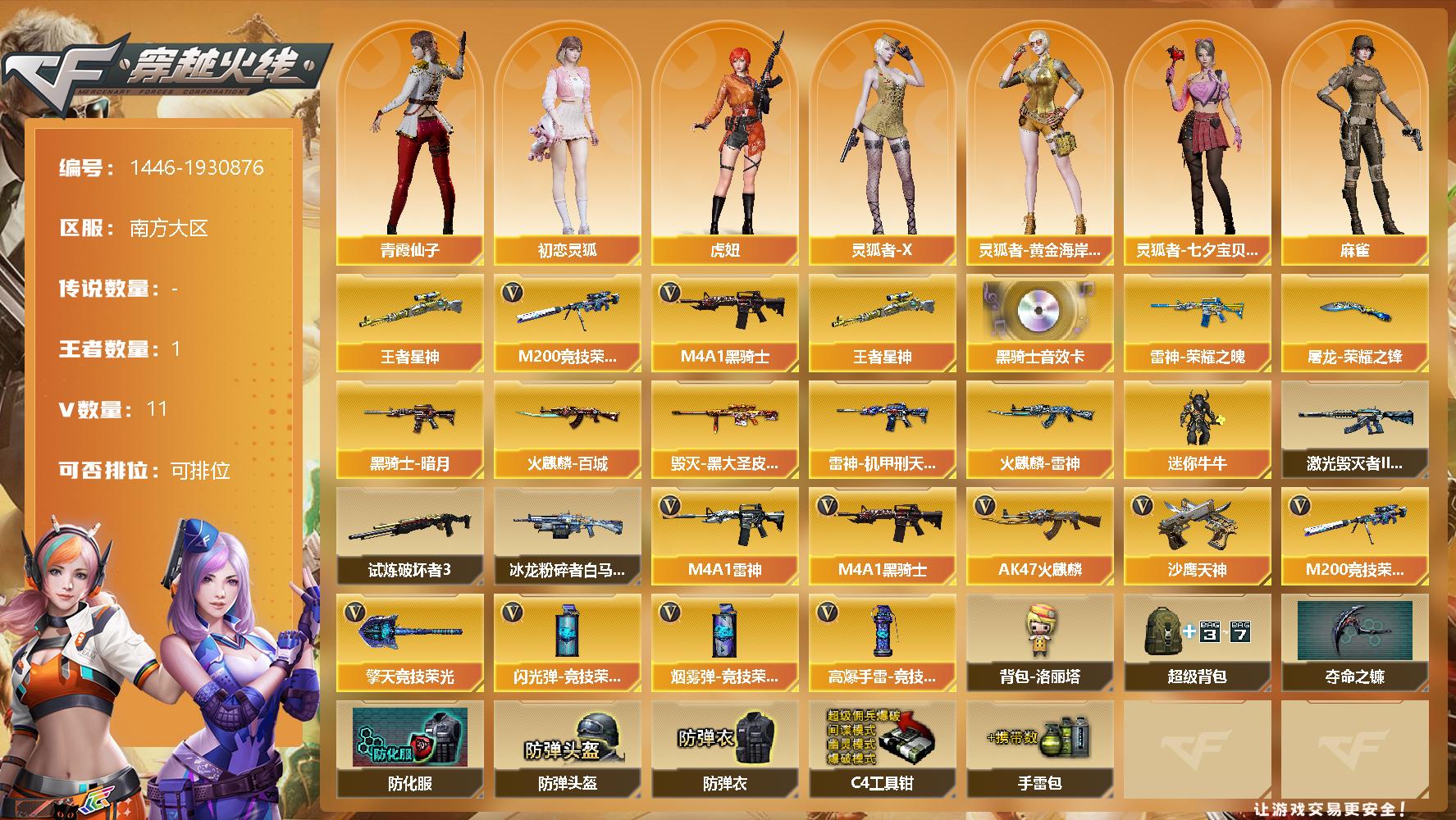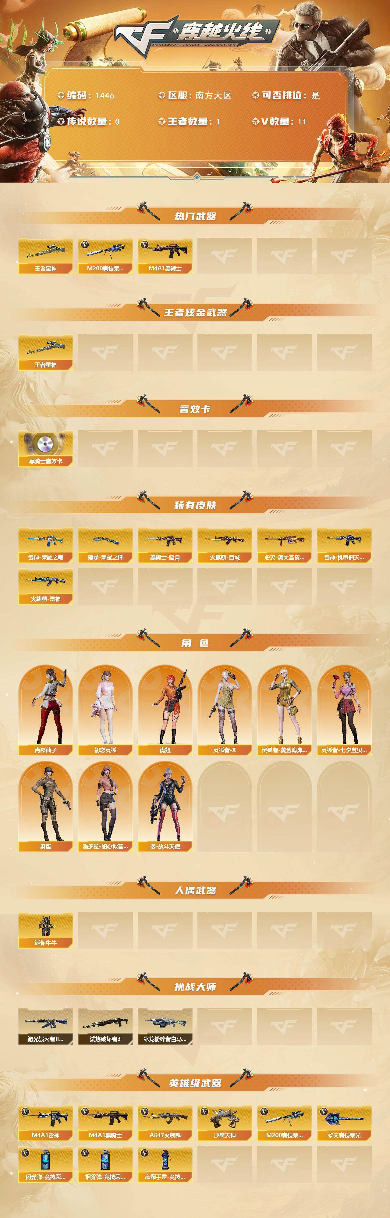 [15432059]南方大区-11V-1王者-0炫金 【热门武器】:王者星神,M200-竞技荣光,M4A1-黑骑士 【王者炫金武器】:王者星神 【音效卡】:M4A1-黑骑士音效卡 【皮肤】:雷神-荣耀之魄,雷神-机甲刑天皮肤,火麒麟-雷神,火麒麟-百城,毁灭-黑大圣皮肤,黑骑士-暗月*2,屠龙-荣耀之锋 【角色】:初恋灵狐,虎妞,灵狐者-X,灵狐者-黄金海岸,灵狐者-七夕宝贝,麻雀,潘多拉-甜心教官,青霞仙子,樱