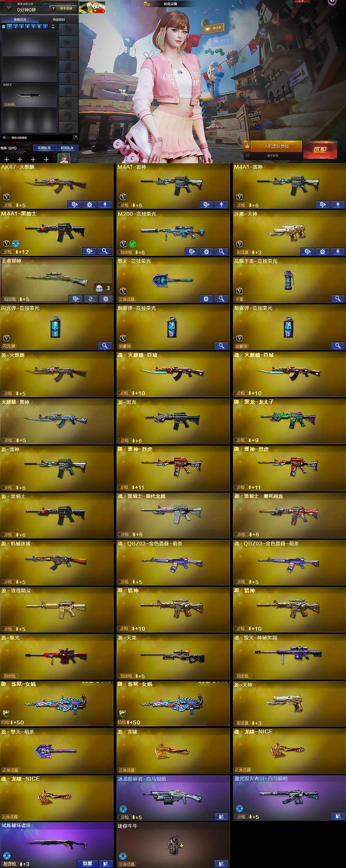- [12770509]广东三区-76V-13王者-0炫金 【传说武器】:传说幽冥 【热门武器】:传说幽冥,QBZ03-金色蔷薇,Scar Light-白虎,M200-幻神,金色蔷薇-古蛇迷踪,修罗-古蛇迷踪,M200-竞技荣光,Kar98K-星神,雷神-小红,USP-雷暴,沙鹰-修罗,炽芒蝶刃 【王者炫金武器】:王者星霆 【音效卡】:烈火-动感闪耀 音效卡,M200-幻神音效卡,Barrett-毁灭音效卡 【稀有皮肤】:幻神-Heartshot 皮肤,星神-璀璨皮肤,雷神-星空,雷神-传奇N9,火麒麟-百城,炼狱-星空,无影耀金皮肤 【角色】:王者凌霄,王者涂鸦,王者玲珑,王者云悠悠,审判者,炫,幽,电竞教官-云悠悠,关小雨,雾萌萌,晴雅,岚兮儿,雨墨,蜀雪,炽天使,铁骑荣耀,青霞仙子 【人偶武器】:雷神-小红,AWM-灵狐-15周年嘉年华,M4A1-雷神-精英刀锋,M37-葵,COP-旗袍,迷你牛魔王,兔宝宝,灵狐娃娃手雷,深渊终结者手雷 【暴走生化】:黑龙吞噬者 【挑战大师】:神圣爆裂者-末日III,VEPR-12-金魔,激光毁灭者III-白马银枪,冰龙粉碎者-白马银枪 【英雄级武器】:M200-竞技荣光,柯尔特-竞技荣光,擎天-竞技荣光,高爆手雷-竞技荣光,烟雾弹-竞技荣光,闪光弹-竞技荣光*2,破空枪刃-夜魔,马来剑-夜魔,USP-雷暴,烈火-动感闪耀,天神-动感闪耀,屠龙-动感闪耀,手雷-动感闪耀,QBZ03-金色蔷薇,Scar Light-白虎,金色蔷薇-古蛇迷踪,无影-神兵利器,M4A1-雷神*2,AK47-无影,AK47-火麒麟,Barrett-毁灭,AWM-裁决,Kar98K-星神,M200-幻神,黑武士-锦绣游龙,修罗-古蛇迷踪,沙鹰-修罗,炽芒蝶刃,麒麟刺,龙啸,屠龙 【特殊枪械】:1白虎