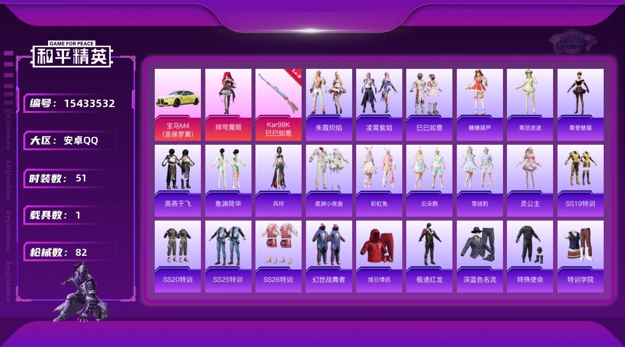 [15433532]【店主推荐捡漏号!可直接换绑】 安卓 手Q-1粉装-1特效枪-1载具-1粉色飞行器-2.2w热力值-5王牌印记-51套装-82枪皮【粉色套装】:角色-绯穹魔姬【粉色枪皮等级】:Kar98K-巳巳如意(五级)【粉色载具】:宝马M4(圣保罗黄)