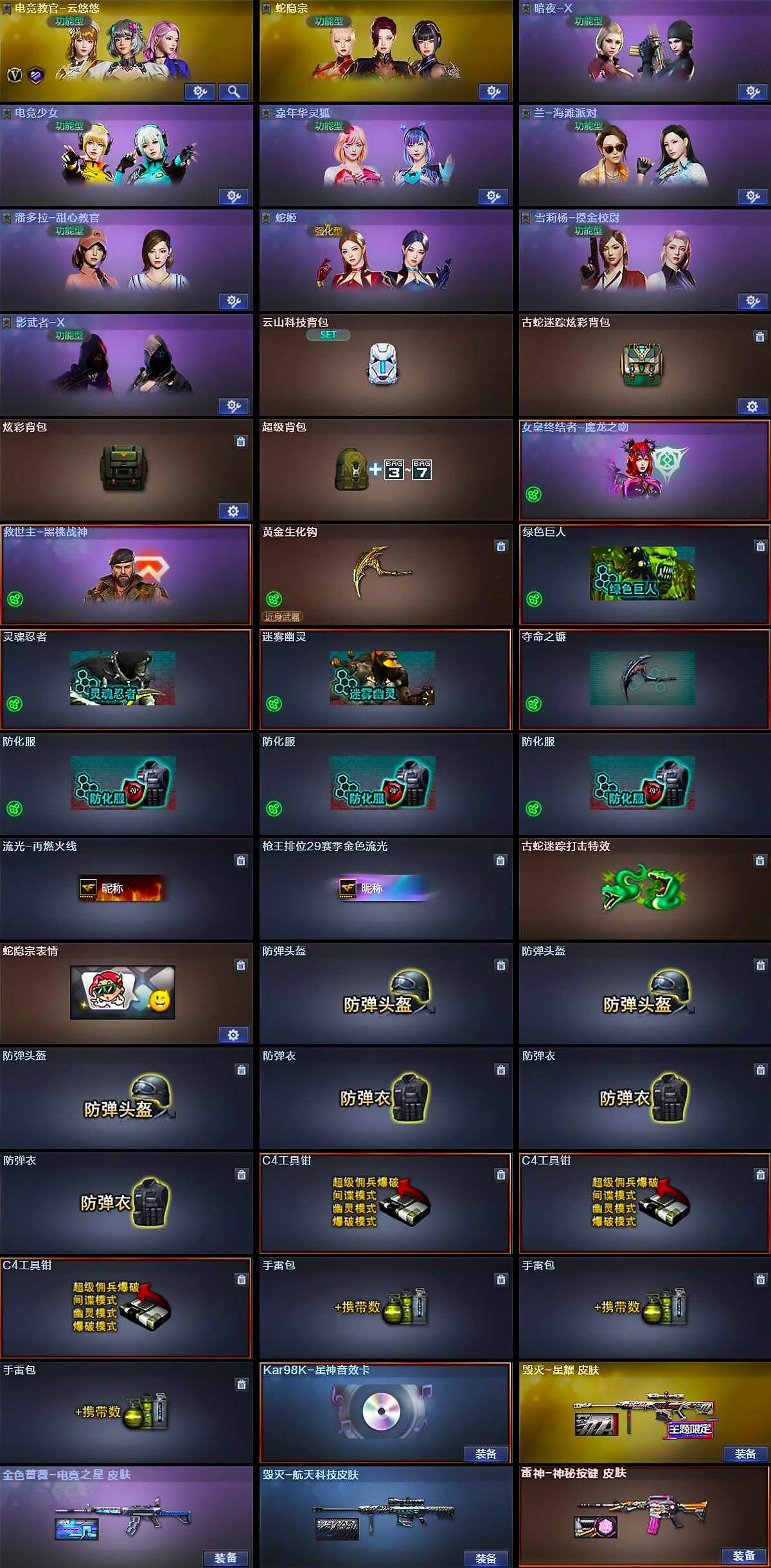 【道具】:云山科技背包,古蛇迷踪炫彩背包,炫彩背包,超级背包,女皇终结者-魔龙之吻,救世主-黑桃战神,黄金生化钩,绿色巨人,灵魂忍者,迷雾幽灵,夺命之镰,防化服*3,流光-再燃火线,枪王排位29赛季金色流光,古蛇迷踪打击特效,蛇隐宗表情,防弹头盔*3,防弹衣*3,C4工具钳*3,手雷包*3