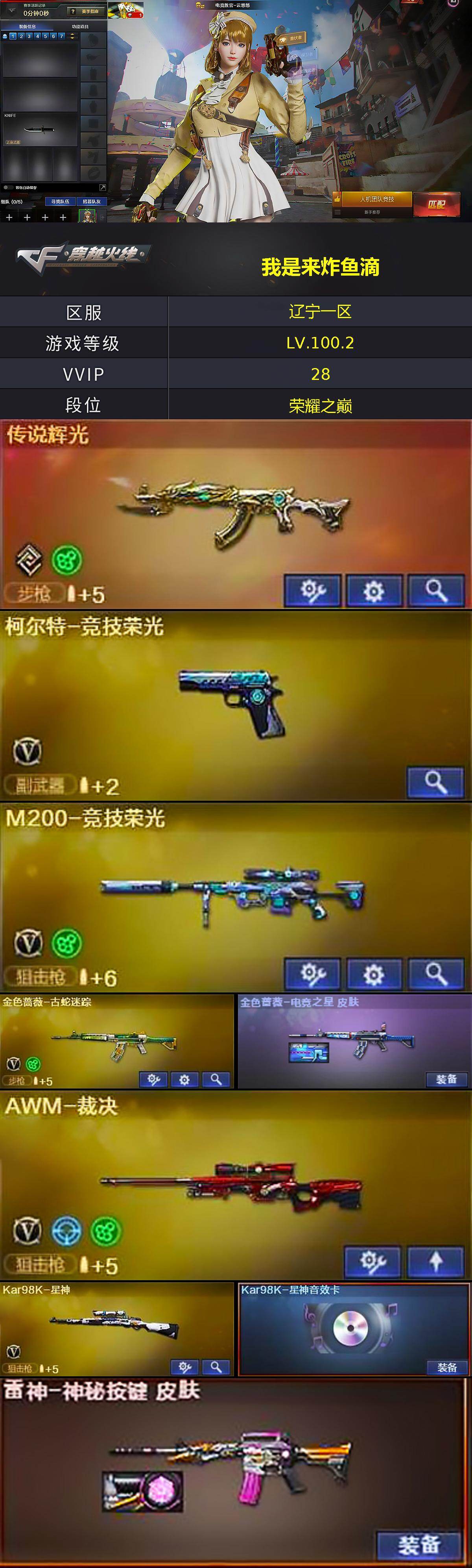 [15386414]辽宁一区-23V-0王者-0炫金 【传说武器】:传说辉光 【热门武器】:传说辉光,金色蔷薇-古蛇迷踪,修罗-古蛇迷踪,M200-竞技荣光,Kar98K-星神,羊驼玩偶 【音效卡】:Kar98K-星神音效卡 【皮肤】:金色蔷薇-电竞之星 皮肤,裁决-胜者为王 皮肤,雷神-神秘按键 皮肤,毁灭-星耀 皮肤,毁灭-航天科技皮肤,龙啸-青青莓果 皮肤 【角色】:电竞教官-云悠悠,蛇隐宗,暗夜-X,电竞少女,嘉年华灵狐,兰-海滩派对,潘多拉-甜心教官,蛇姬,雪莉杨-摸金校尉,影武者-X 【人偶武器】:迷你生化手雷,迷你艾比 【英雄级武器】:AK47-火麒麟,AK12-天启,金色蔷薇-古蛇迷踪,AWM-裁决,Kar98K-星神,M200-竞技荣光,柯尔特-竞技荣光,修罗-古蛇迷踪,龙啸,擎天-竞技荣光,高爆手雷-竞技荣光*3,高爆手雷-古蛇迷踪,闪光弹-竞技荣光*4,烟雾弹-竞技荣光*2,烟雾弹-古蛇迷踪,M4A1-赤狱骑士 【道具】:云山科技背包,古蛇迷踪炫彩背包,炫彩背包,超级背包,女皇终结者-魔龙之吻,救世主-黑桃战神,黄金生化钩,绿色巨人,灵魂忍者,迷雾幽灵,夺命之镰,防化服*3,流光-再燃火线,枪王排位29赛季金色流光,古蛇迷踪打击特效,蛇隐宗表情,防弹头盔*3,防弹衣*3,C4工具钳*3,手雷包*3 【特殊枪械】: