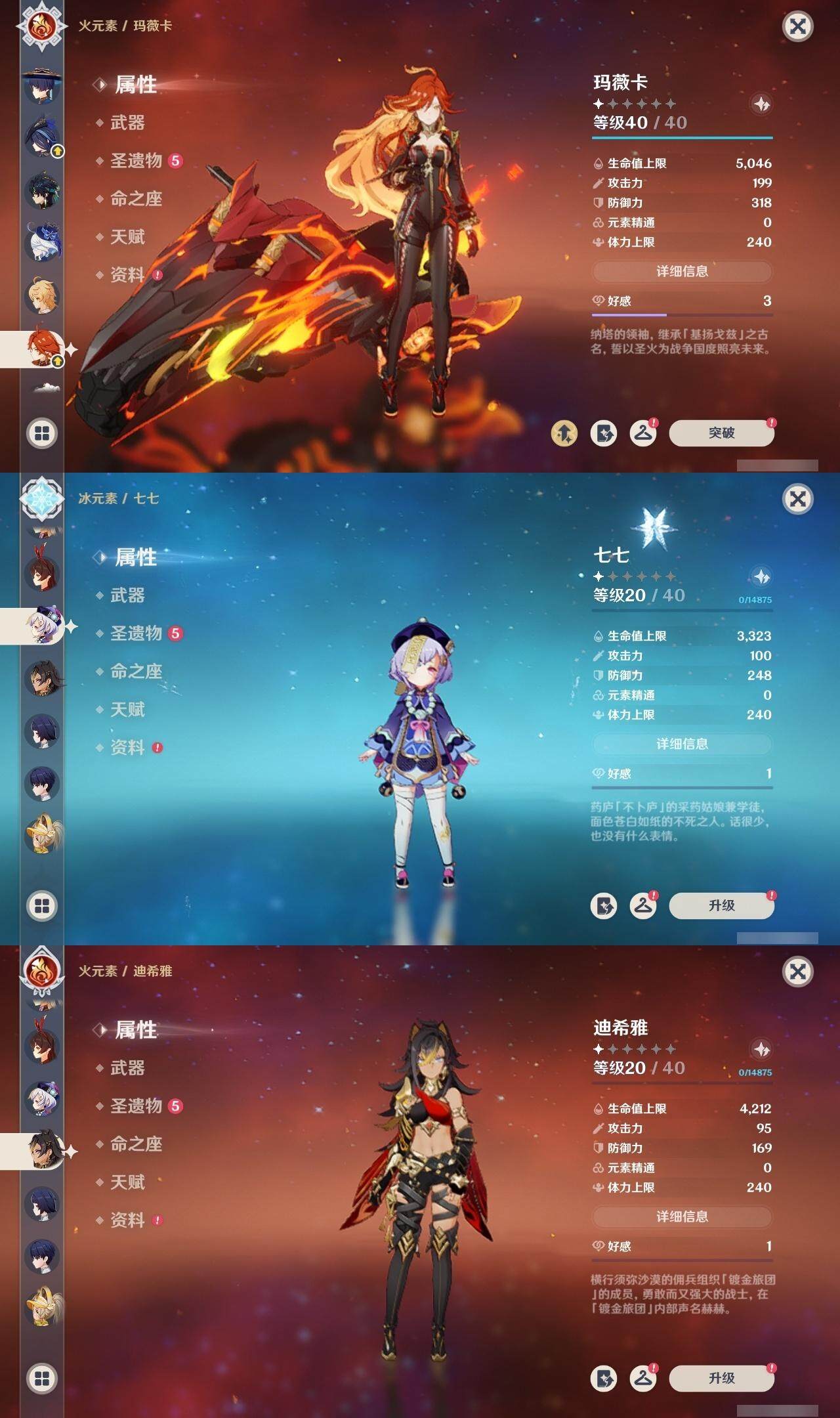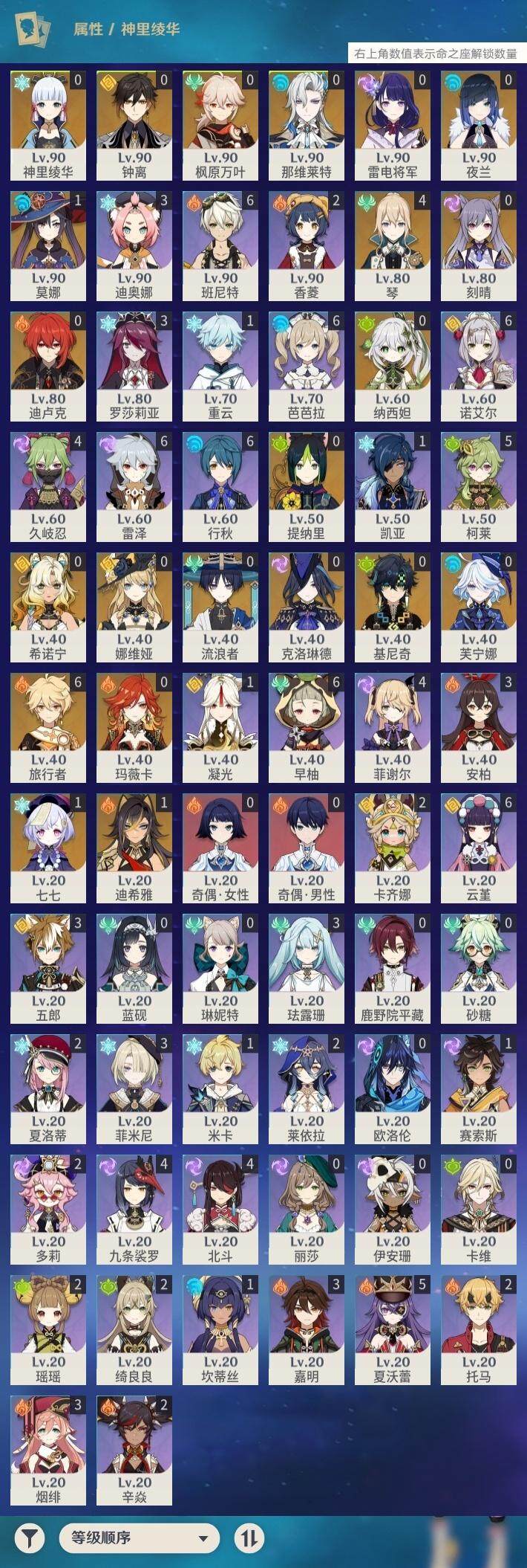 - [14832686]60级/41黄/女主/21个五星角色/10个五星武器 0命闲云,0命娜维娅,0命那维莱特,0命迪希雅,0命纳西妲,0命妮露,1命提纳里,0命夜兰,0命雷电将军,1命枫原万叶,0命神里绫华,0命钟离,1命胡桃,0命魈,0命达达利亚,0命刻晴,2命七七,1命琴,2命莫娜,2命迪卢克,0命玛拉妮,精1千夜浮梦,精1圣显之钥,精1若水,精1护摩之杖,精1磐岩结绿,精1和璞鸢,精1天空之翼,精1天空之卷,精1天空之傲