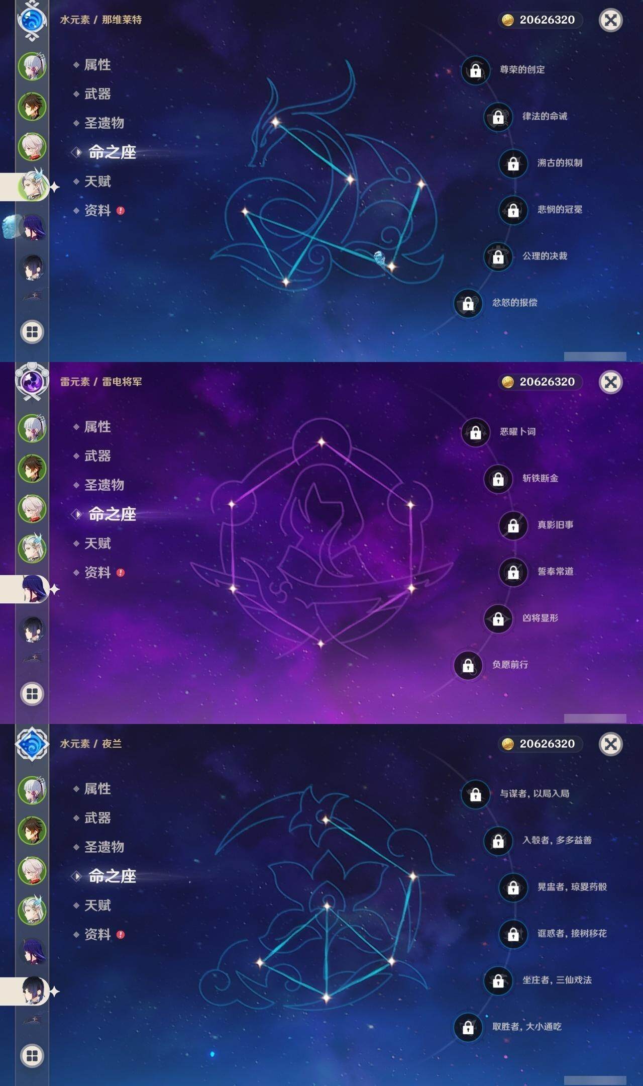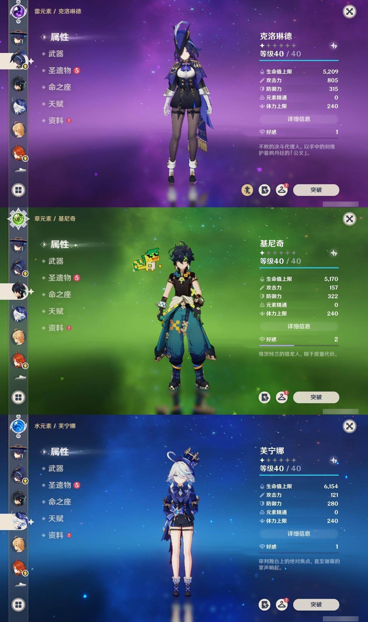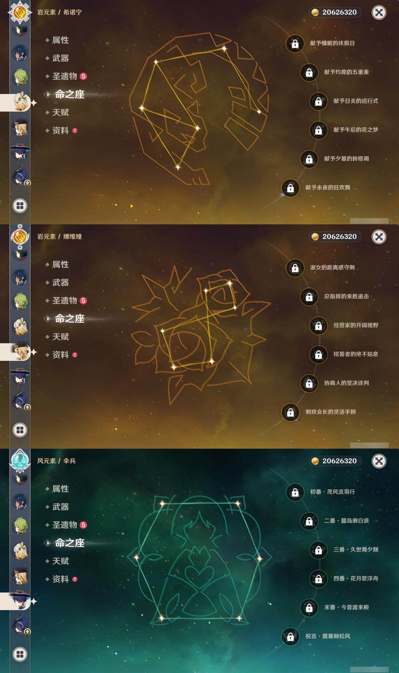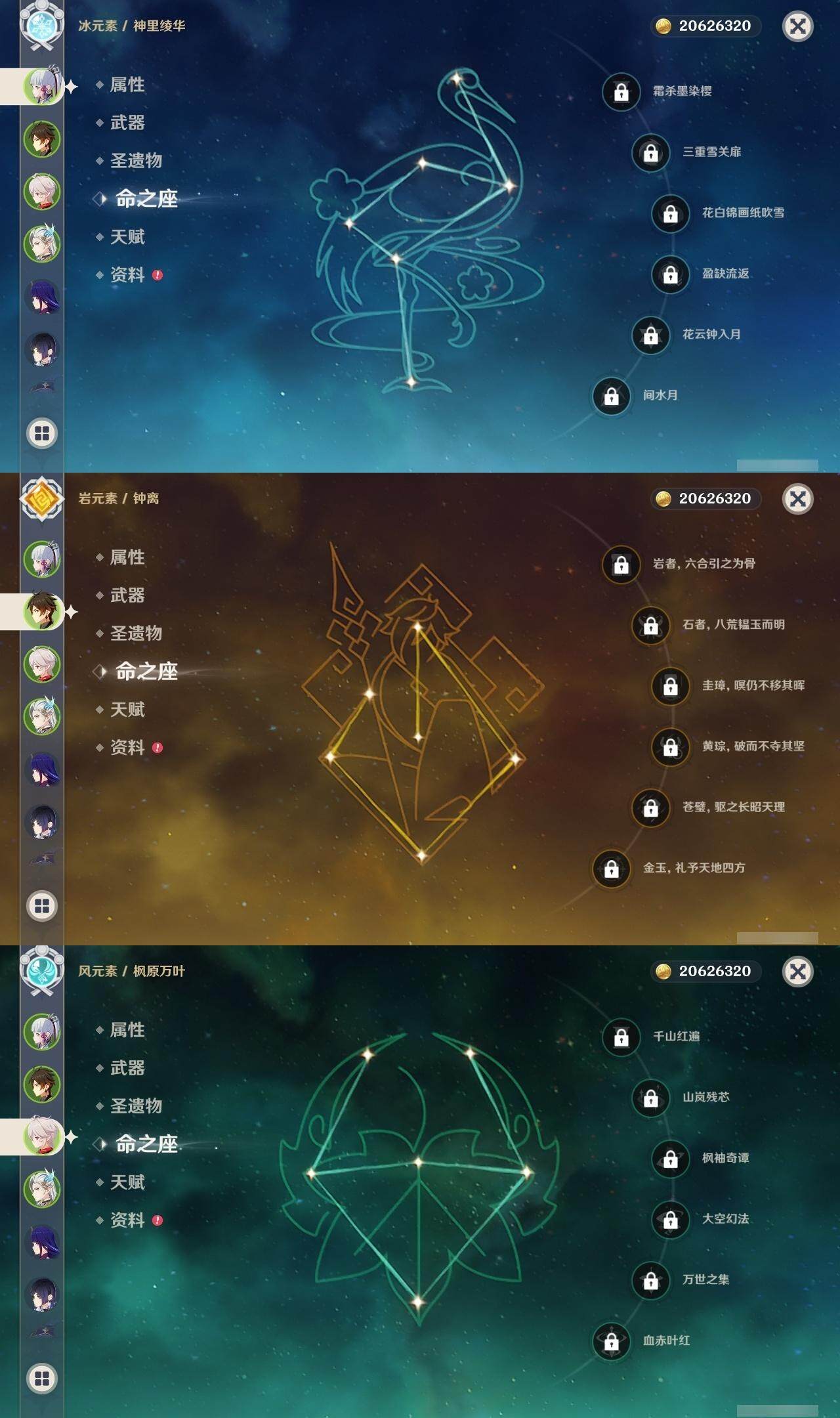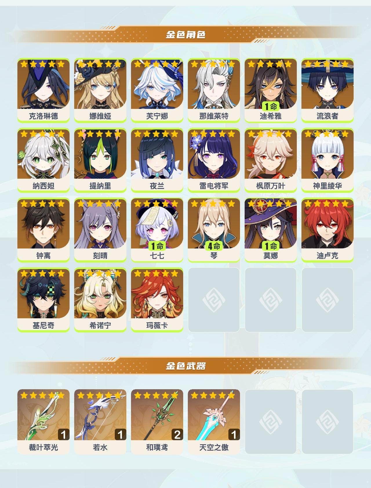 0命克洛琳德,0命娜维娅,0命芙宁娜,0命那维莱特,1命迪希雅,0命流浪者,0命纳西妲,0命提纳里,0命夜兰,0命雷电将军,0命枫原万叶,0命神里绫华,0命钟离,0命刻晴,1命七七,4命琴,1命莫娜,0命迪卢克,0命基尼奇,0命希诺宁,0命玛薇卡,精1裁叶萃光,精1若水,精2和璞鸢,精1天空之傲