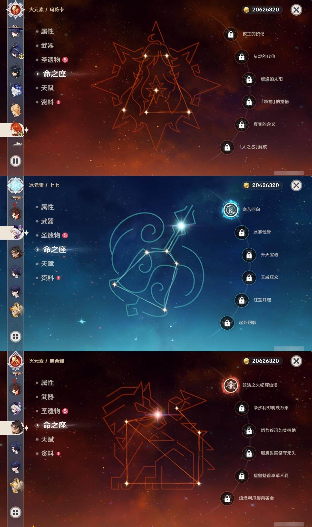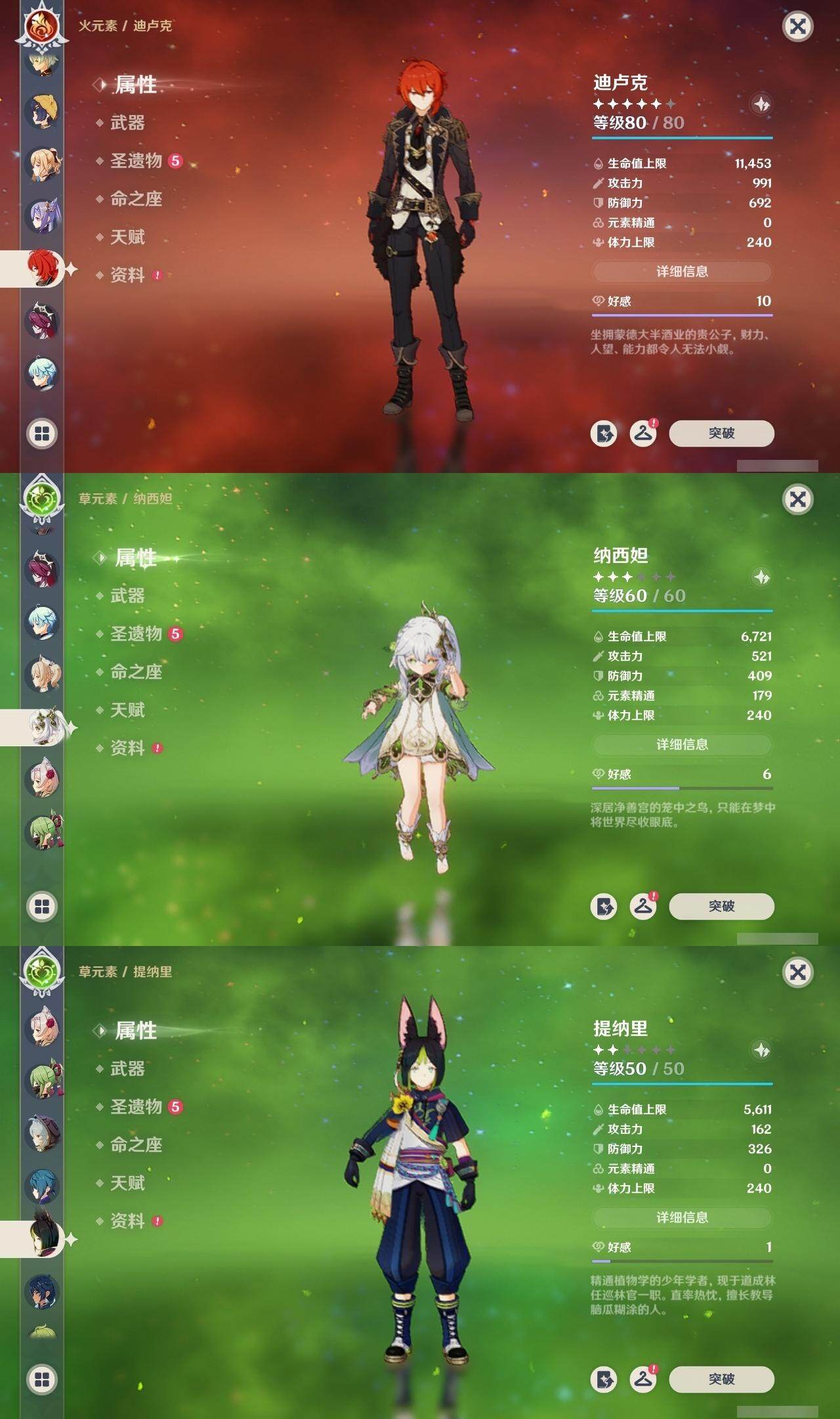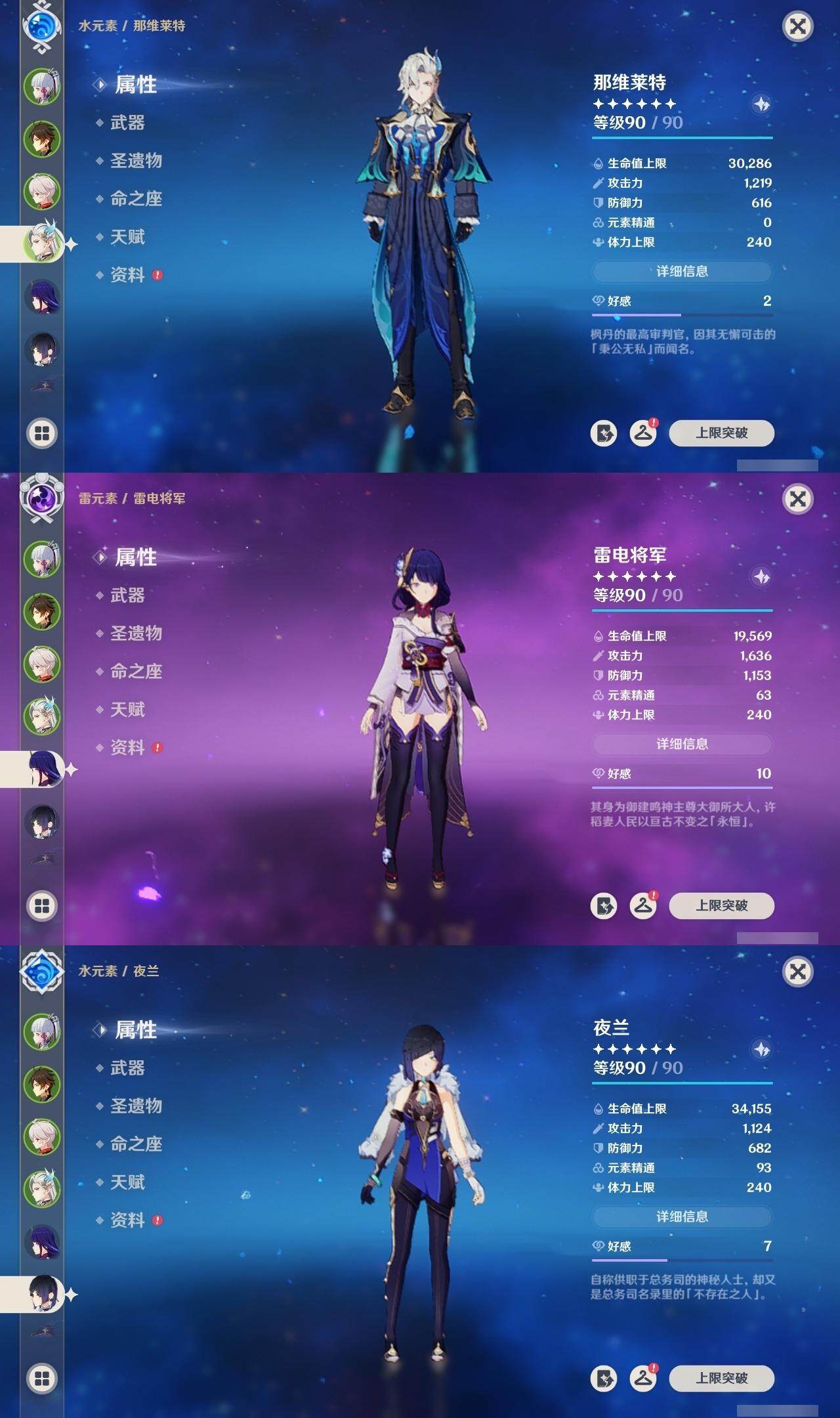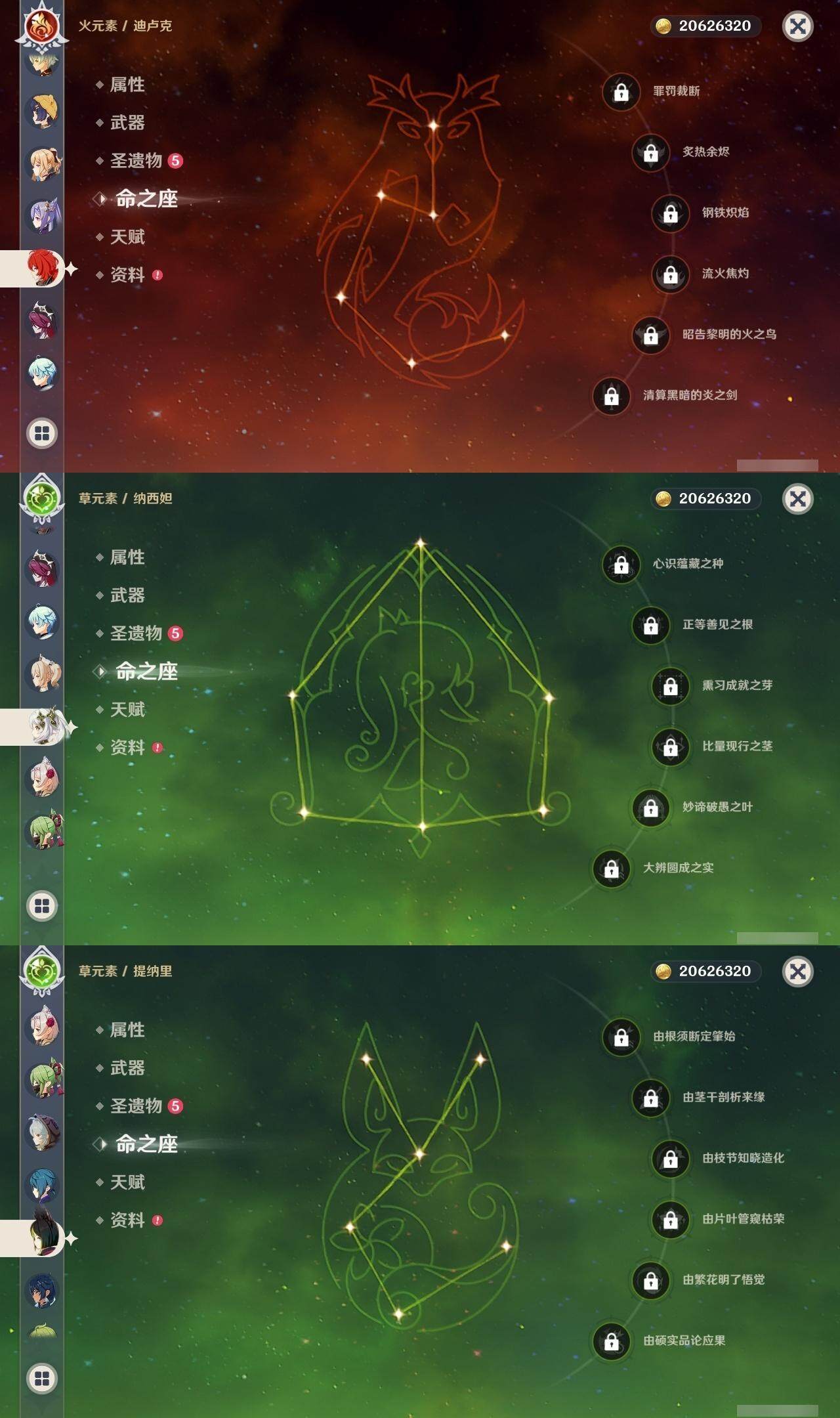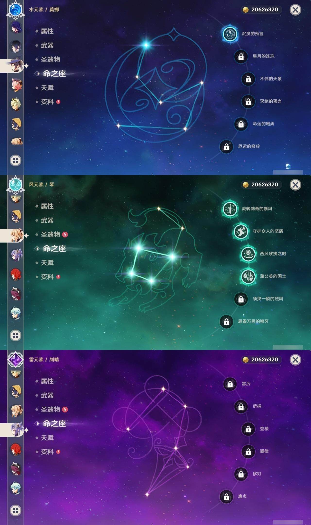 0命克洛琳德,0命娜维娅,0命芙宁娜,0命那维莱特,1命迪希雅,0命流浪者,0命纳西妲,0命提纳里,0命夜兰,0命雷电将军,0命枫原万叶,0命神里绫华,0命钟离,0命刻晴,1命七七,4命琴,1命莫娜,0命迪卢克,0命基尼奇,0命希诺宁,0命玛薇卡,精1裁叶萃光,精1若水,精2和璞鸢,精1天空之傲