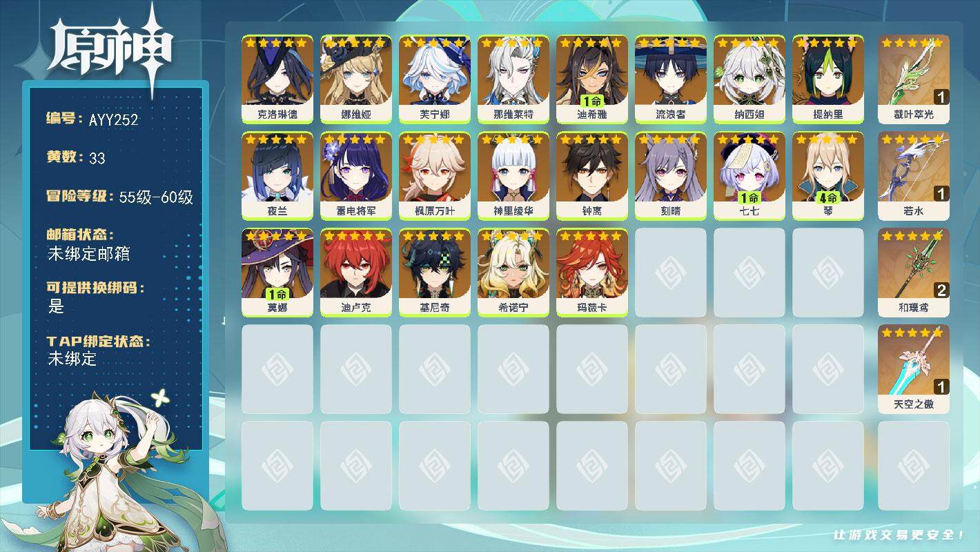 [15433724]【店主推荐捡漏号】59级/33黄/男主/21个五星角色/4个五星武器 0命克洛琳德,0命娜维娅,0命芙宁娜,0命那维莱特,1命迪希雅,0命流浪者,0命纳西妲,0命提纳里,0命夜兰,0命雷电将军,0命枫原万叶,0命神里绫华,0命钟离,0命刻晴,1命七七,4命琴,1命莫娜,0命迪卢克,0命基尼奇,0命希诺宁,0命玛薇卡,精1裁叶萃光,精1若水,精2和璞鸢,精1天空之傲