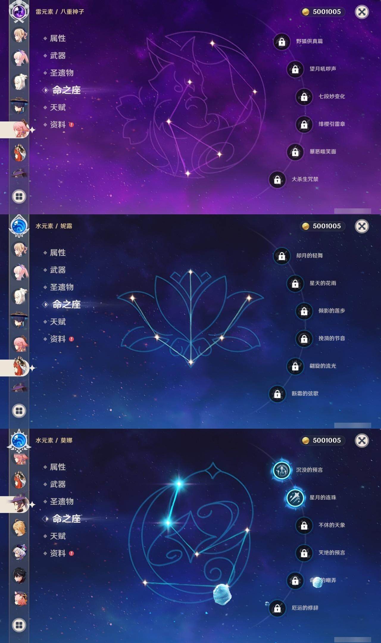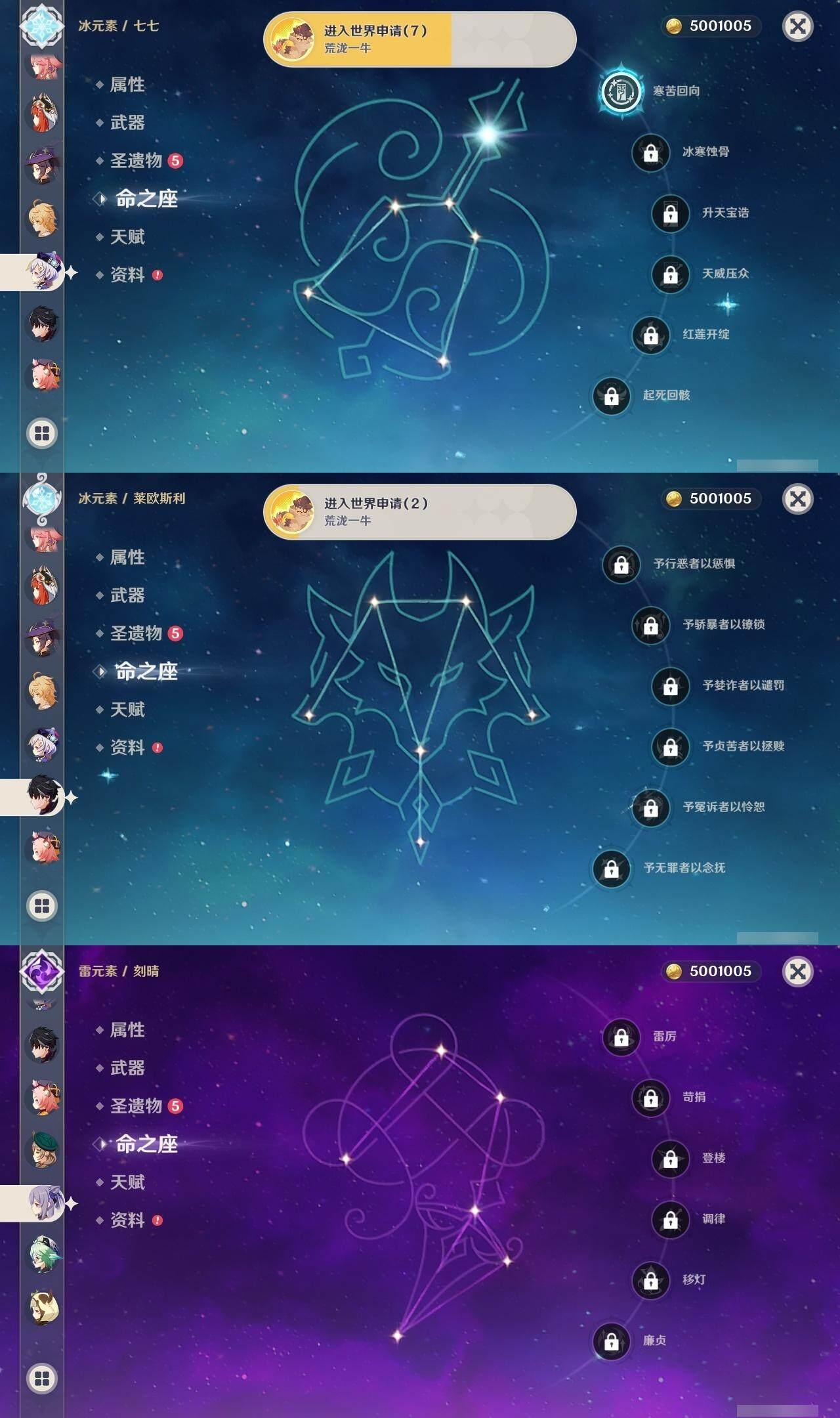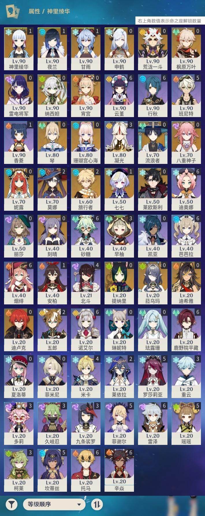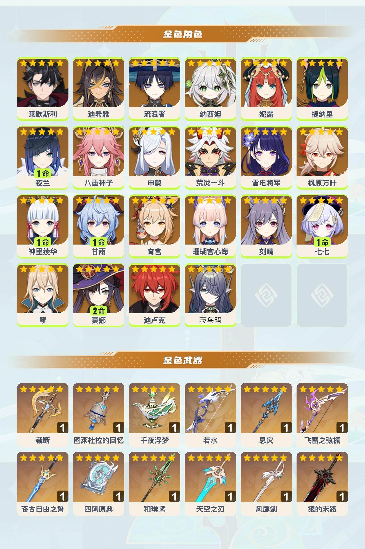 0命莱欧斯利,0命迪希雅,0命流浪者,0命纳西妲,0命妮露,0命提纳里,1命夜兰,0命八重神子,0命申鹤,0命荒泷一斗,0命雷电将军,0命枫原万叶,1命神里绫华,1命甘雨,0命宵宫,0命珊瑚宫心海,0命刻晴,1命七七,0命琴,2命莫娜,0命迪卢克,0命菈乌玛,精1裁断,精1图莱杜拉的回忆,精1千夜浮梦,精1若水,精1息灾,精1飞雷之弦振,精1苍古自由之誓,精1四风原典,精1和璞鸢,精1天空之刃,精1风鹰剑,精1狼的末路