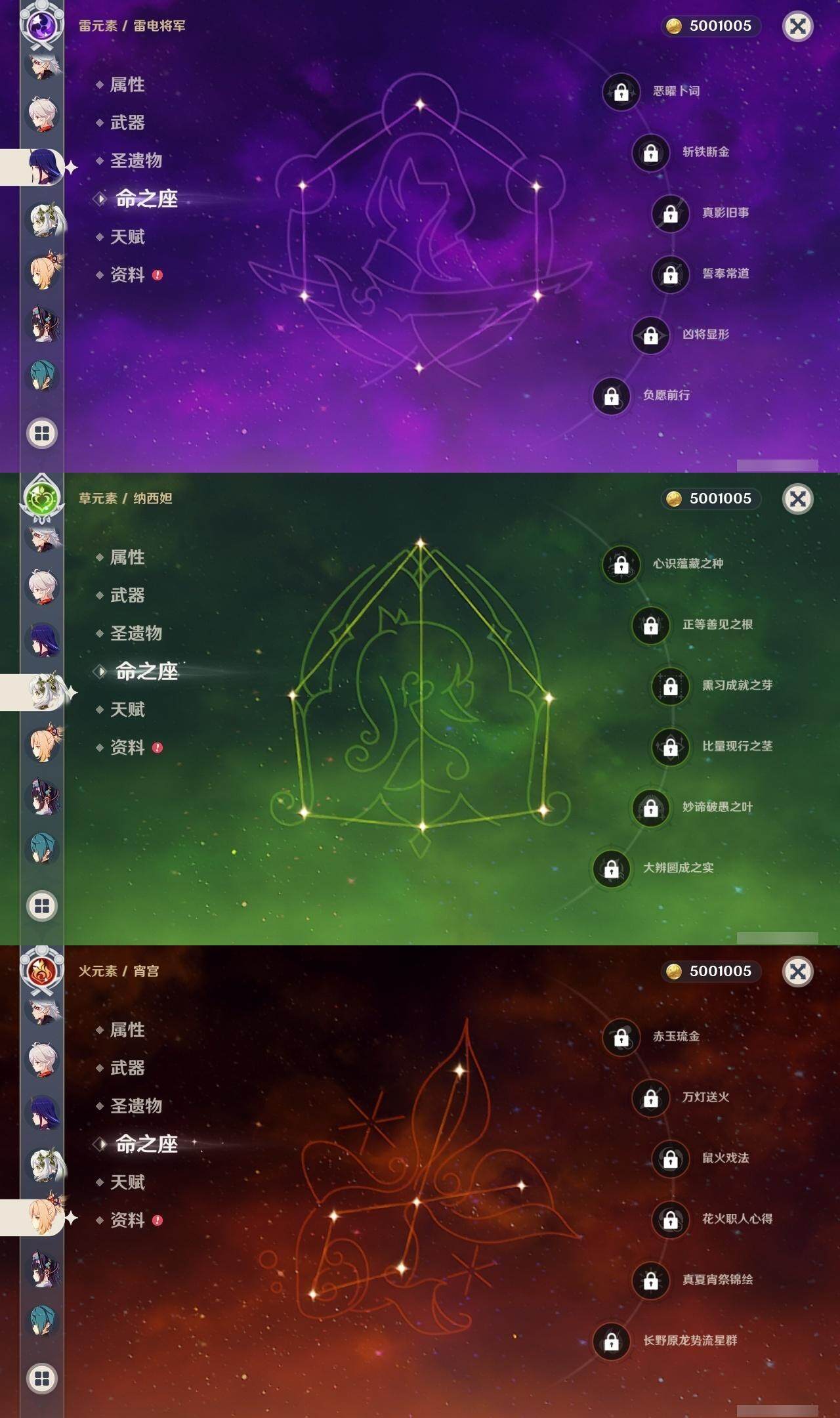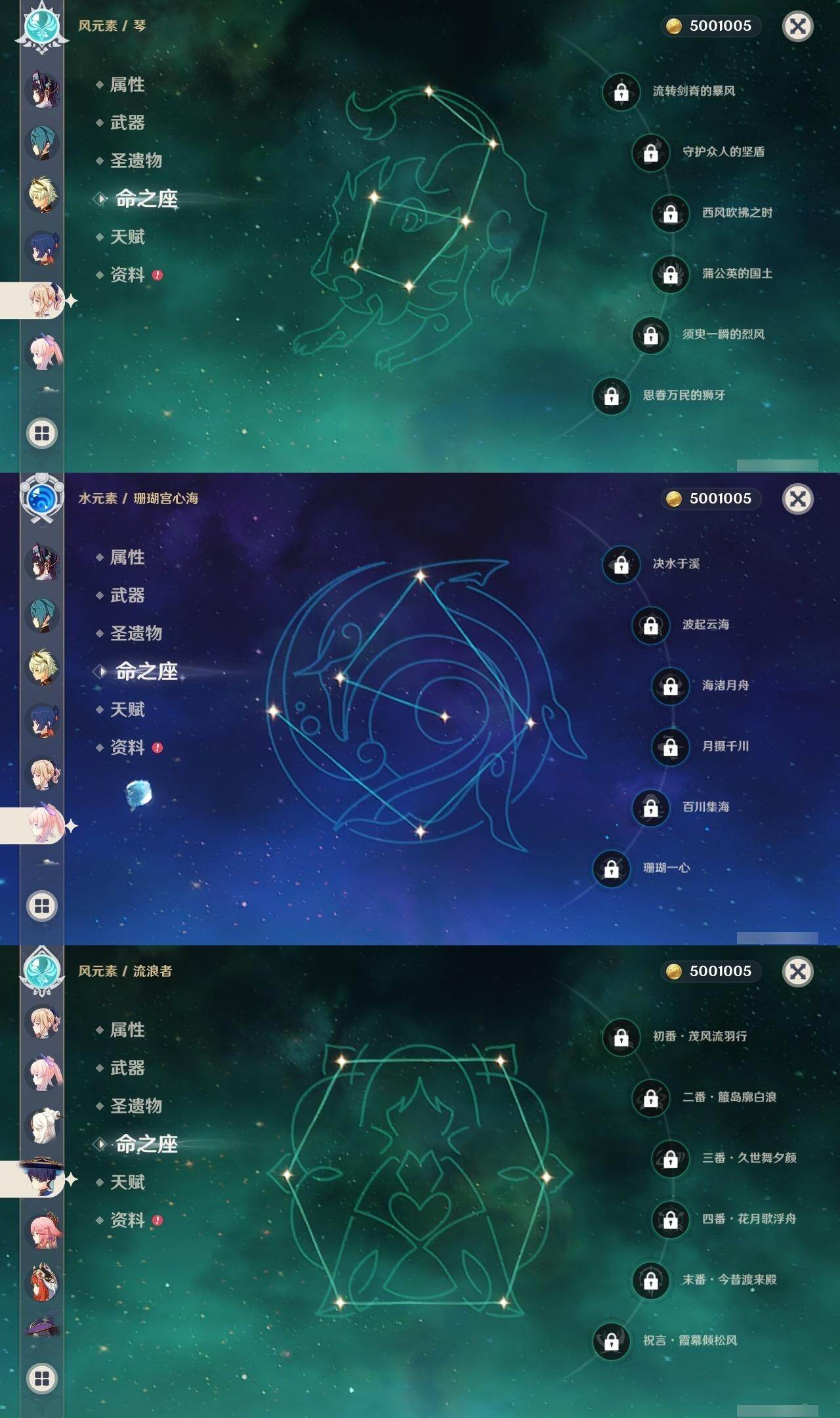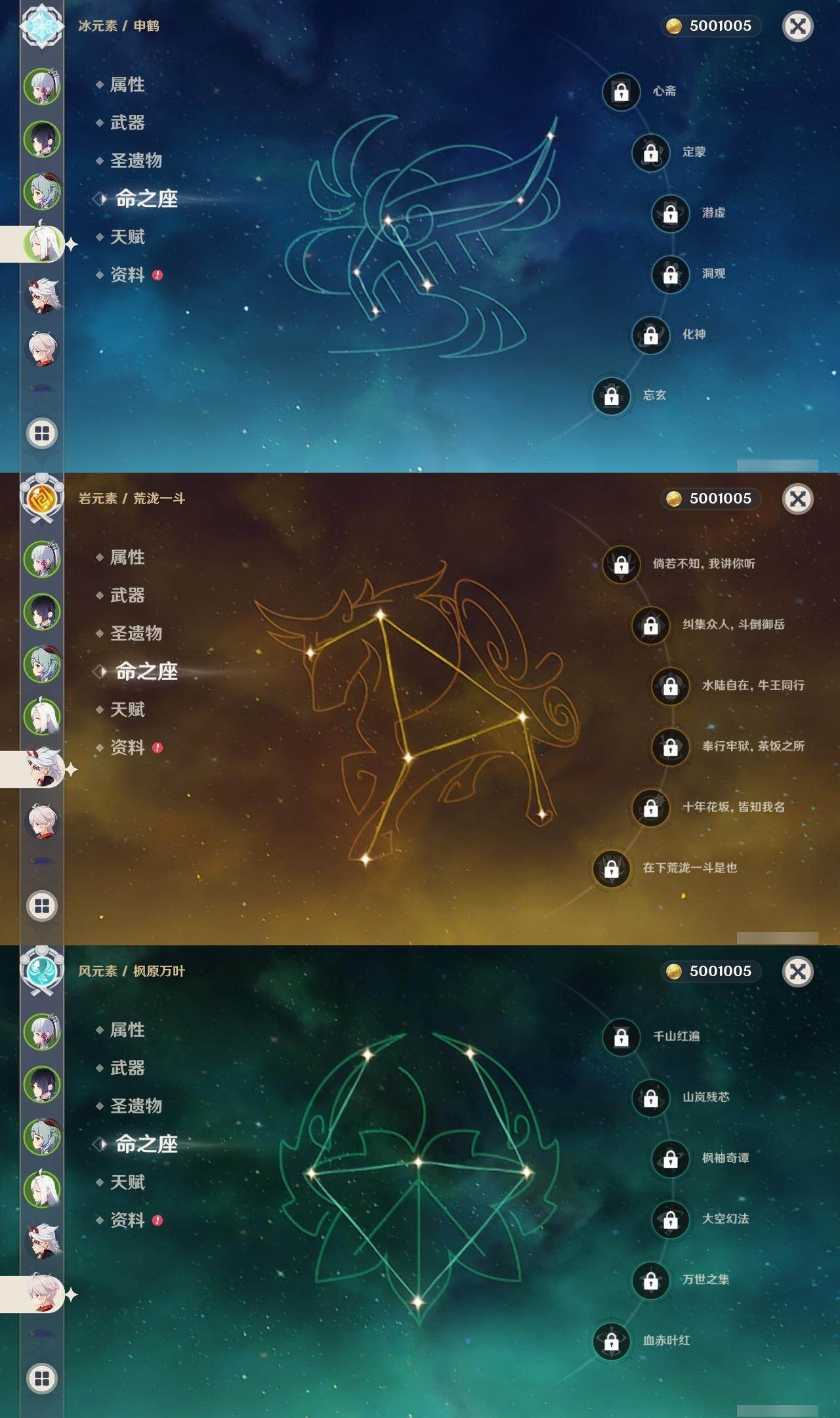 0命莱欧斯利,0命迪希雅,0命流浪者,0命纳西妲,0命妮露,0命提纳里,1命夜兰,0命八重神子,0命申鹤,0命荒泷一斗,0命雷电将军,0命枫原万叶,1命神里绫华,1命甘雨,0命宵宫,0命珊瑚宫心海,0命刻晴,1命七七,0命琴,2命莫娜,0命迪卢克,0命菈乌玛,精1裁断,精1图莱杜拉的回忆,精1千夜浮梦,精1若水,精1息灾,精1飞雷之弦振,精1苍古自由之誓,精1四风原典,精1和璞鸢,精1天空之刃,精1风鹰剑,精1狼的末路