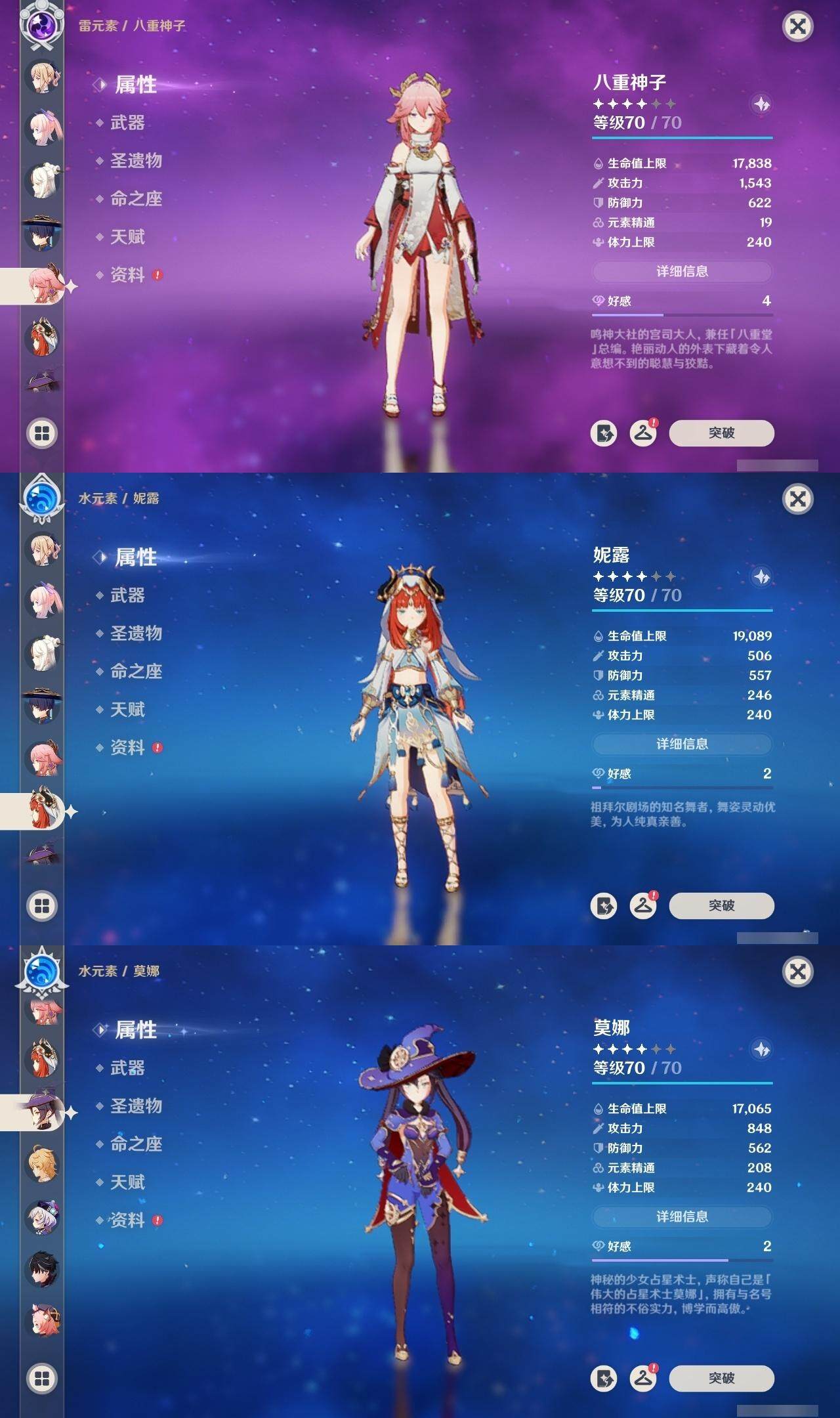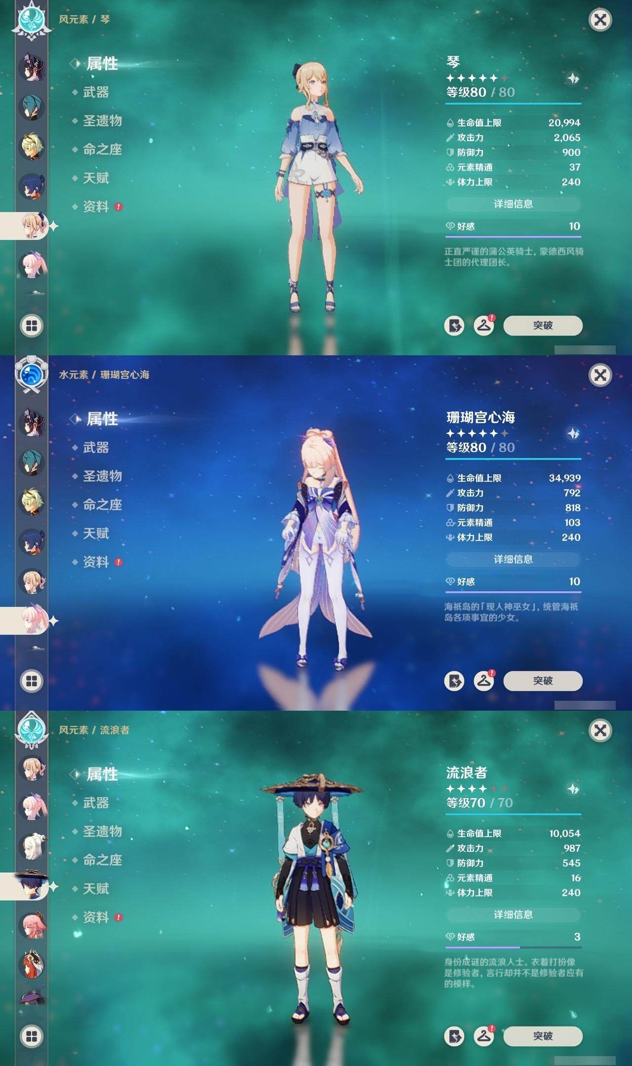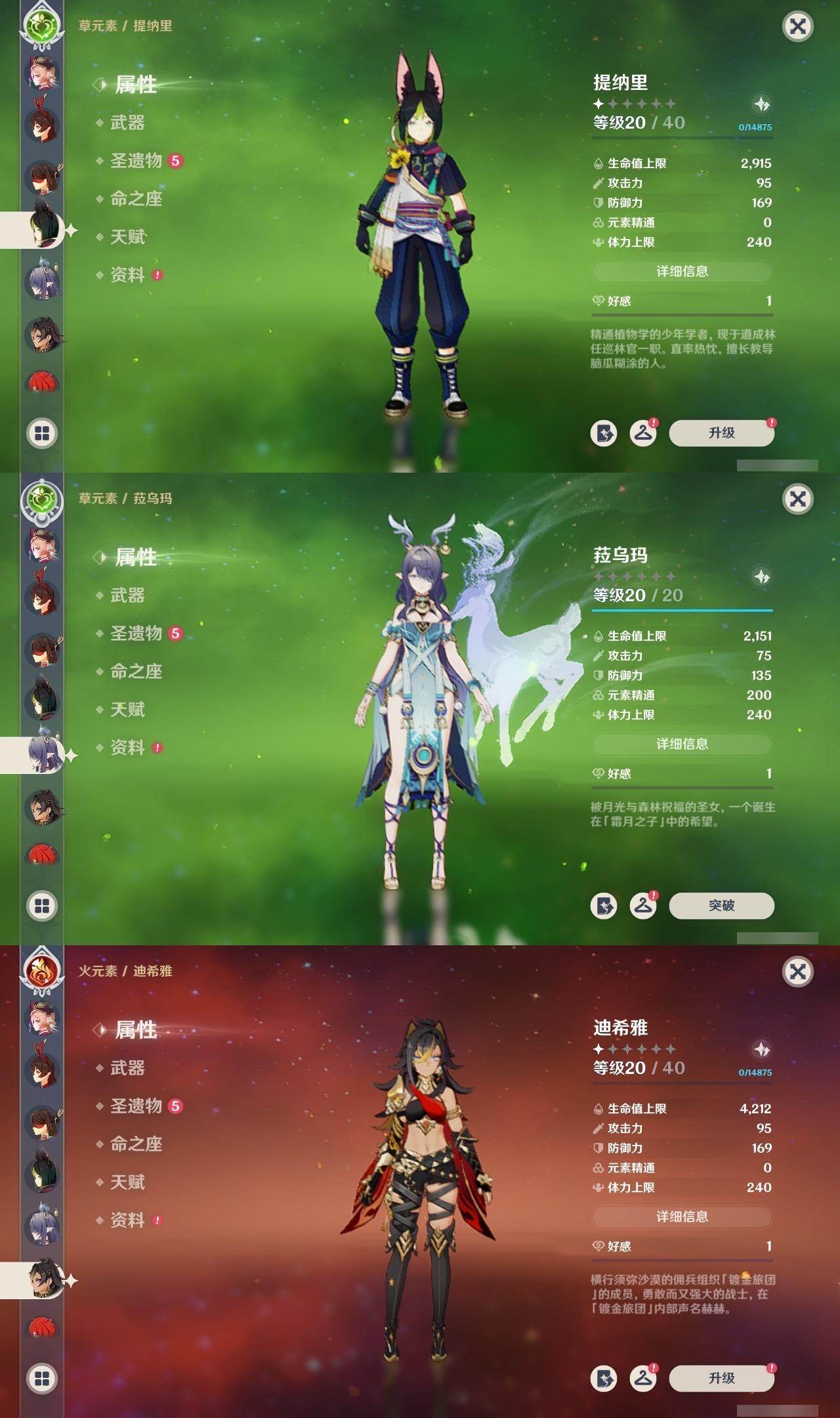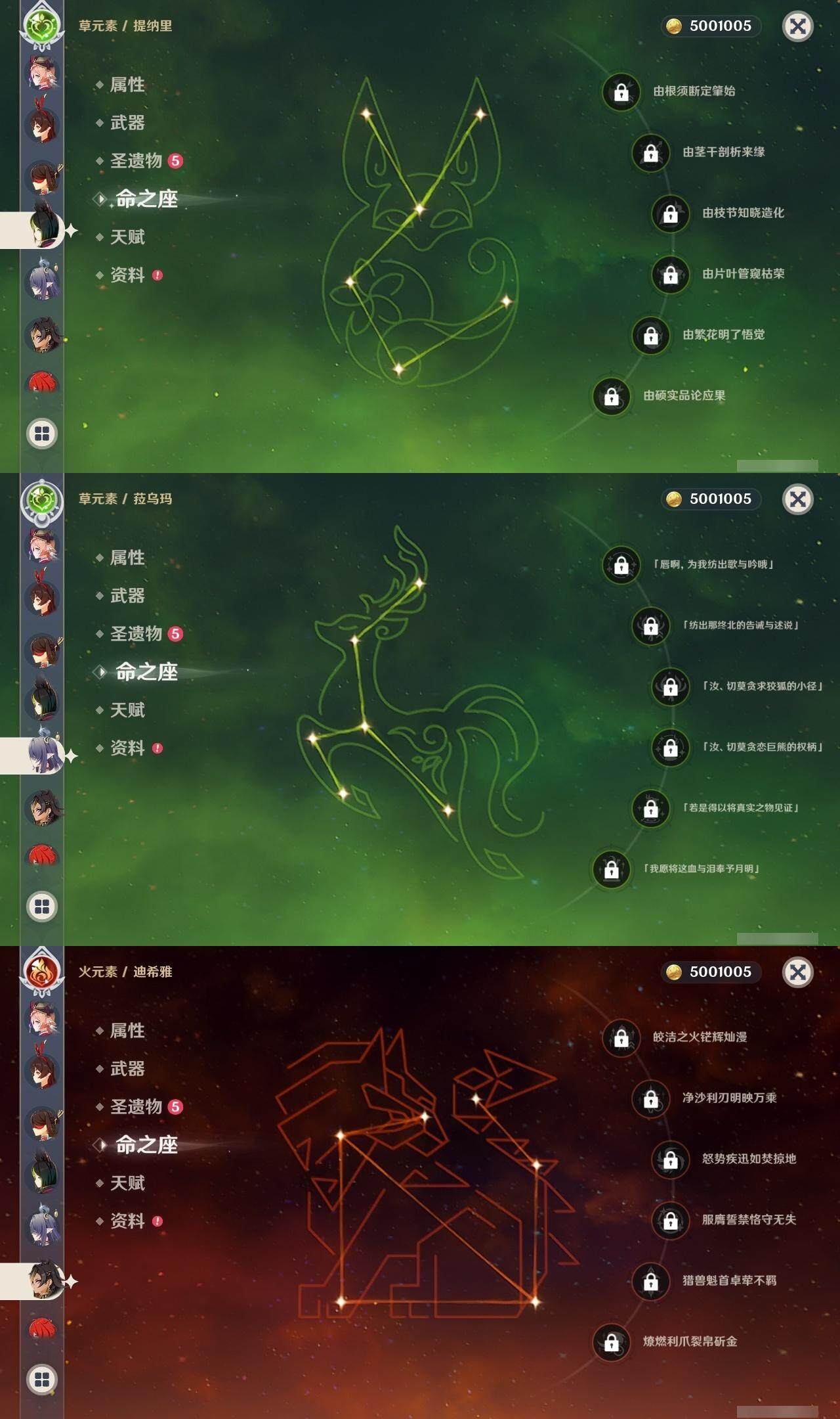 0命莱欧斯利,0命迪希雅,0命流浪者,0命纳西妲,0命妮露,0命提纳里,1命夜兰,0命八重神子,0命申鹤,0命荒泷一斗,0命雷电将军,0命枫原万叶,1命神里绫华,1命甘雨,0命宵宫,0命珊瑚宫心海,0命刻晴,1命七七,0命琴,2命莫娜,0命迪卢克,0命菈乌玛,精1裁断,精1图莱杜拉的回忆,精1千夜浮梦,精1若水,精1息灾,精1飞雷之弦振,精1苍古自由之誓,精1四风原典,精1和璞鸢,精1天空之刃,精1风鹰剑,精1狼的末路