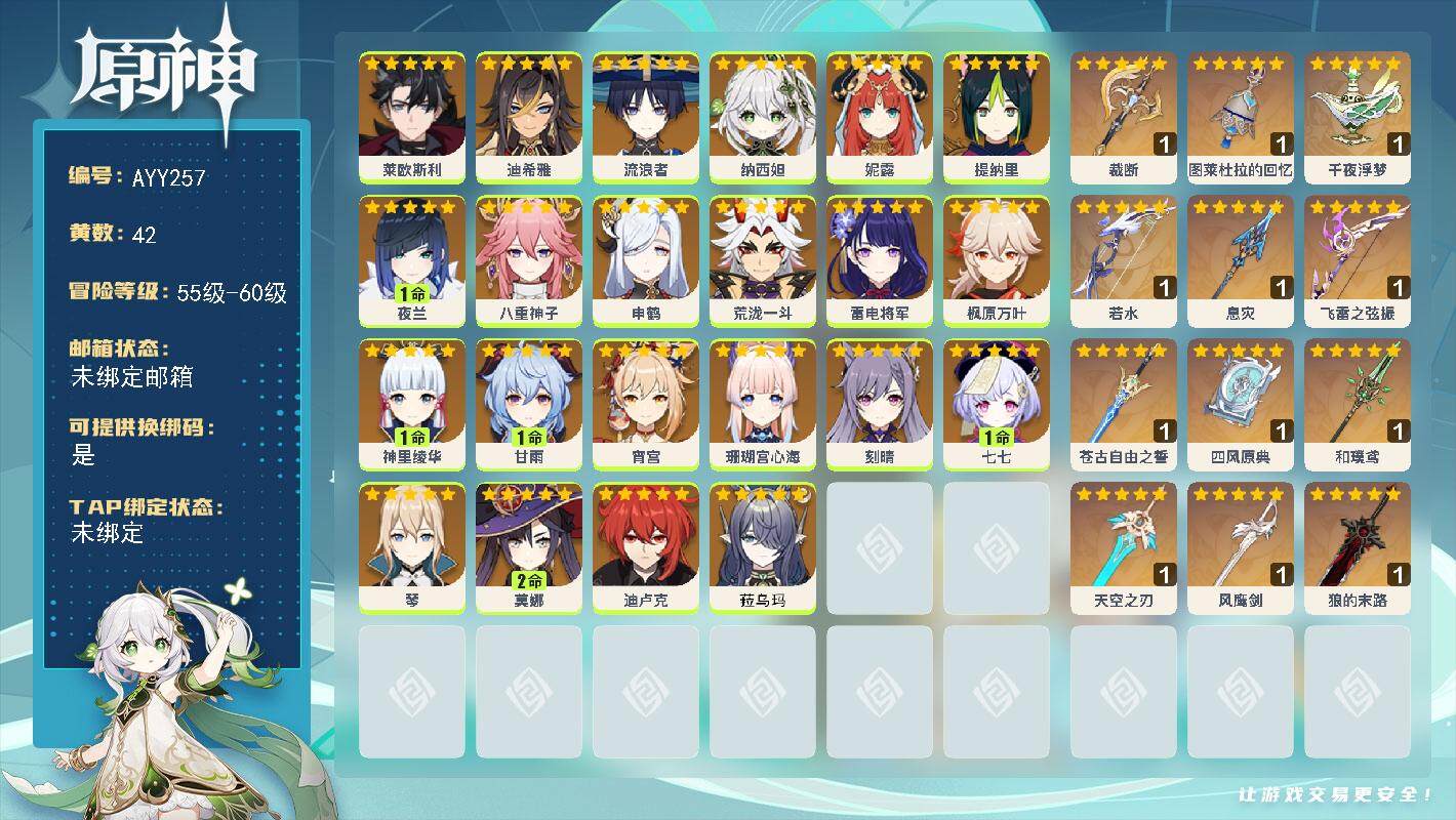 [15434567]58级/42黄/男主/22个五星角色/14个五星武器 0命莱欧斯利,0命迪希雅,0命流浪者,0命纳西妲,0命妮露,0命提纳里,1命夜兰,0命八重神子,0命申鹤,0命荒泷一斗,0命雷电将军,0命枫原万叶,1命神里绫华,1命甘雨,0命宵宫,0命珊瑚宫心海,0命刻晴,1命七七,0命琴,2命莫娜,0命迪卢克,0命菈乌玛,精1裁断,精1图莱杜拉的回忆,精1千夜浮梦,精1若水,精1息灾,精1飞雷之弦振,精1苍古自由之誓,精1四风原典,精1和璞鸢,精1天空之刃,精1风鹰剑,精1狼的末路