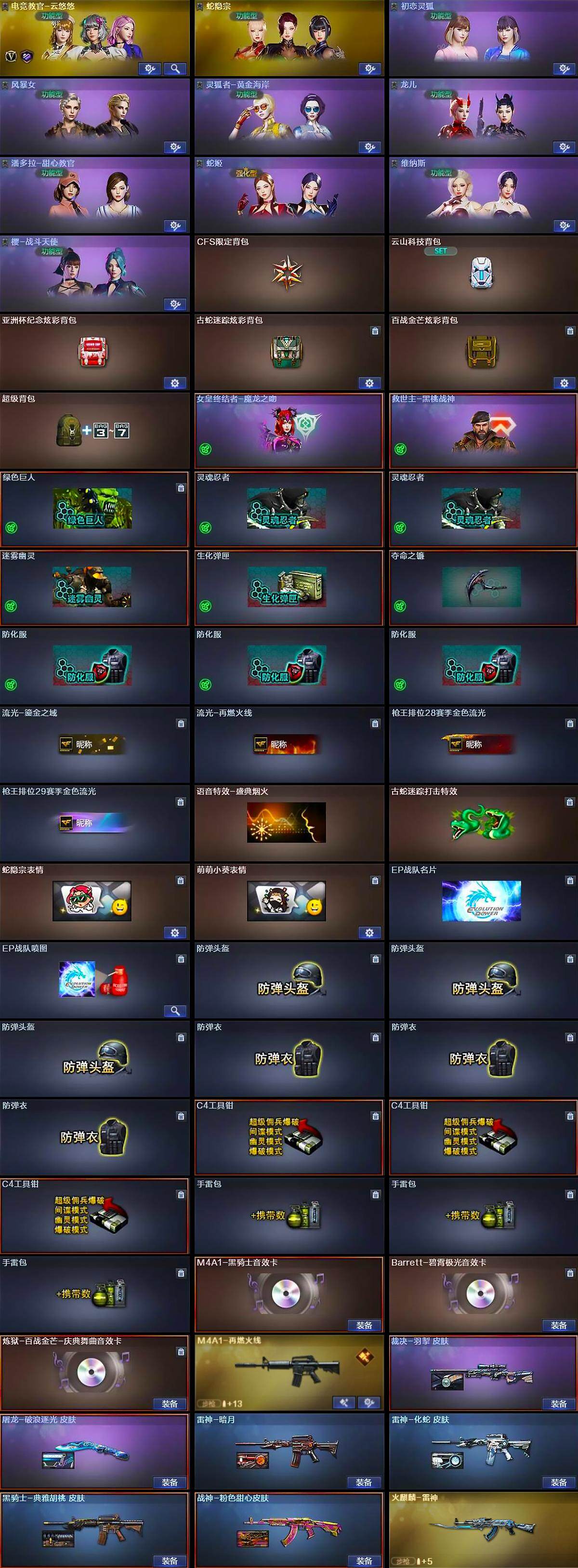【道具】:CFS限定背包,云山科技背包,亚洲杯纪念炫彩背包,古蛇迷踪炫彩背包,百战金芒炫彩背包,超级背包,女皇终结者-魔龙之吻,救世主-黑桃战神,绿色巨人,灵魂忍者*2,迷雾幽灵,生化弹匣,夺命之镰,防化服*3,流光-鎏金之域,流光-再燃火线,枪王排位28赛季金色流光,枪王排位29赛季金色流光,语音特效-盛典烟火,古蛇迷踪打击特效,蛇隐宗表情,萌萌小葵表情,EP战队名片,EP战队喷图,防弹头盔*3,防弹衣*3,C4工具钳*3,手雷包*3