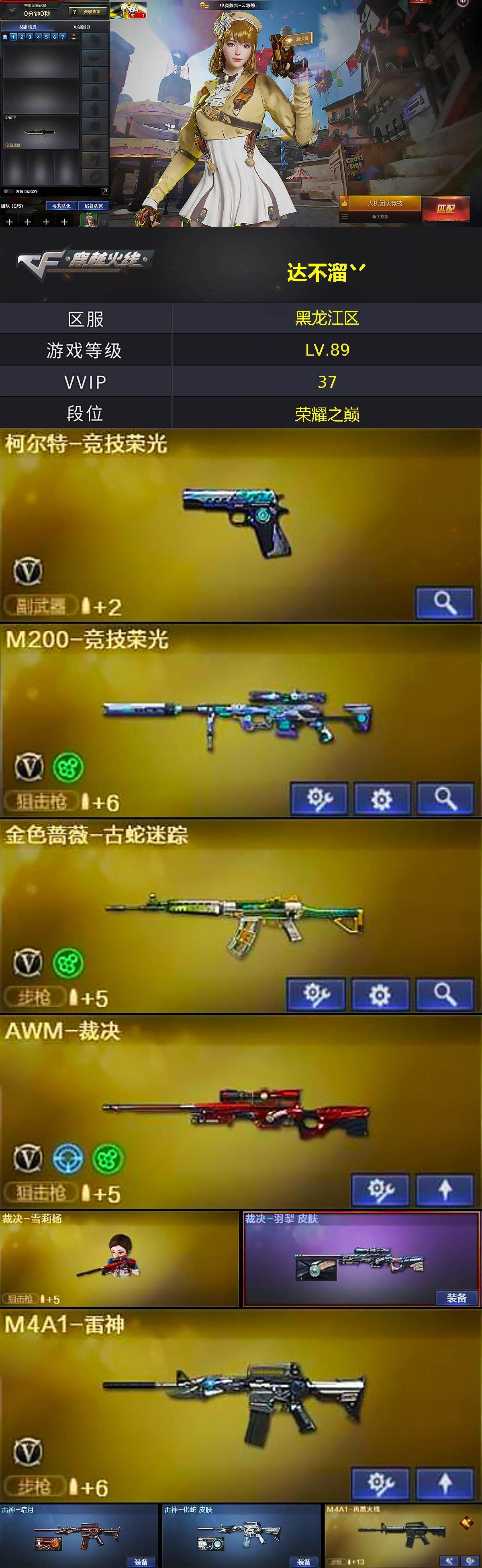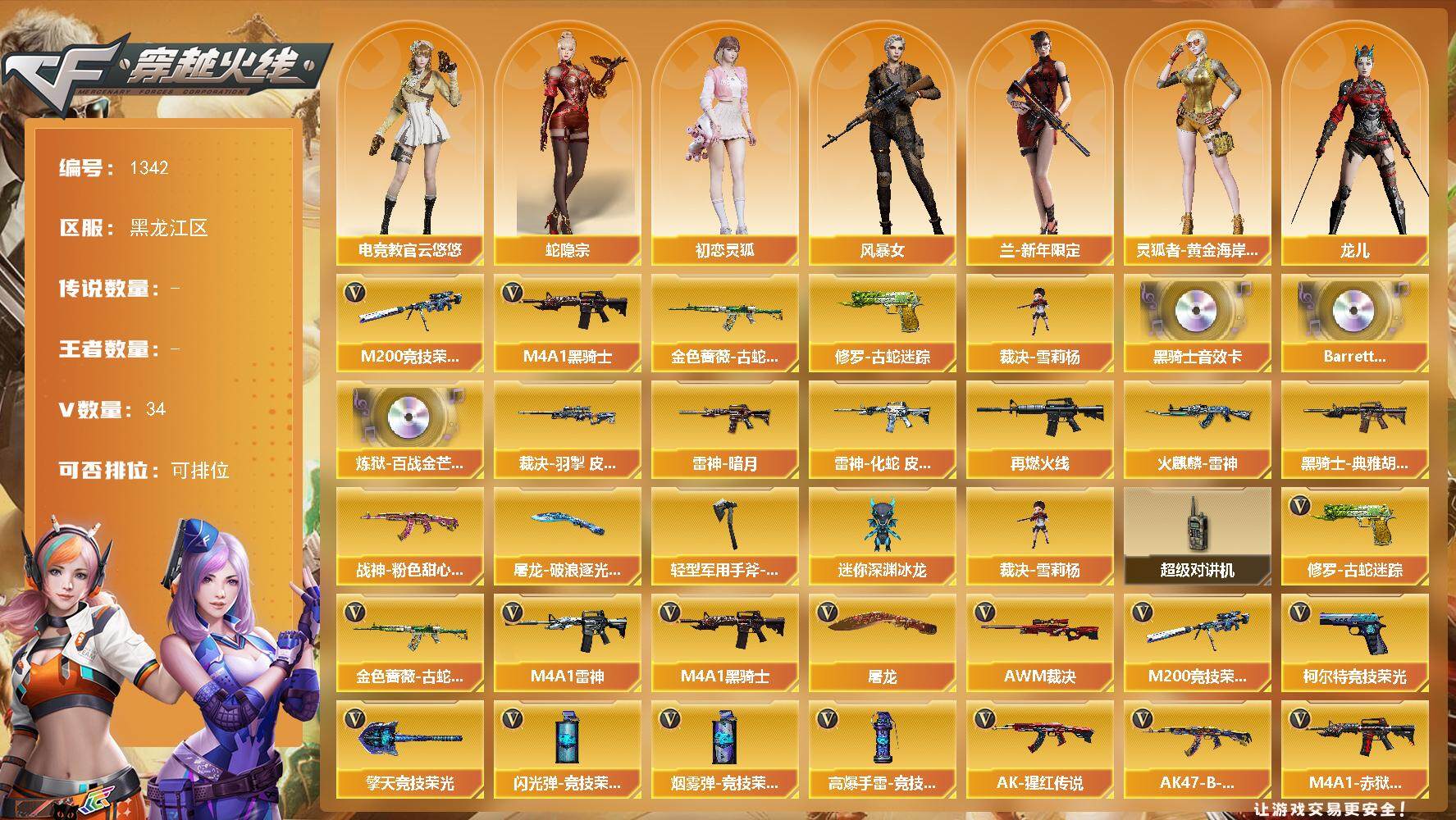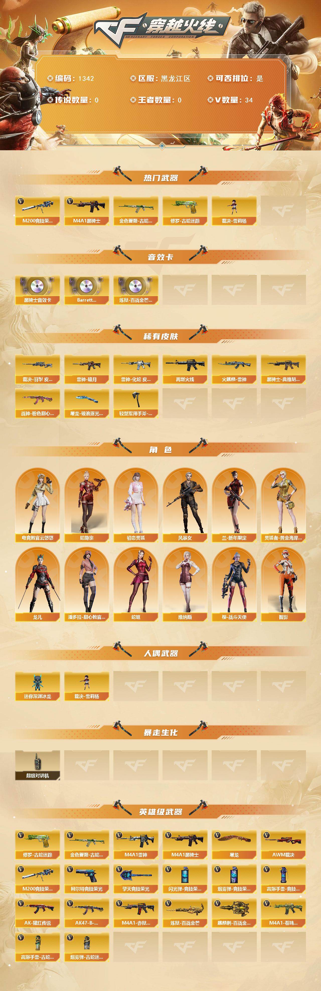 [15434979]黑龙江区-34V-0王者-0炫金 【热门武器】:金色蔷薇-古蛇迷踪,修罗-古蛇迷踪,M200-竞技荣光,M4A1-黑骑士,裁决-雪莉杨 【音效卡】:M4A1-黑骑士音效卡,Barrett-碧霄极光音效卡,炼狱-百战金芒-庆典舞曲音效卡 【皮肤】:裁决-羽掣 皮肤,雷神-暗月,雷神-化蛇 皮肤,M4A1-再燃火线,火麒麟-雷神,黑骑士-典雅胡桃 皮肤,战神-粉色甜心皮肤,屠龙-破浪逐光 皮肤,轻型军用手斧-再燃火线 【角色】:电竞教官-云悠悠,蛇隐宗,初恋灵狐,风暴女,兰-新年限定,灵狐者-黄金海岸,龙儿,潘多拉-甜心教官,蛇姬,维纳斯,樱-战斗天使,智影 【人偶武器】:裁决-雪莉杨,迷你深渊冰龙 【暴走生化】:超级对讲机 【英雄级武器】:M4A1-雷神,M4A1-黑骑士,金色蔷薇-古蛇迷踪,AK-47-猩红传说*2,AK47-B-战神,AWM-裁决,M200-竞技荣光,炼狱-百战金芒,柯尔特-竞技荣光,修罗-古蛇迷踪,屠龙,擎天-竞技荣光,麒麟刺-百战金芒,高爆手雷-竞技荣光*4,高爆手雷-古蛇迷踪,闪光弹-竞技荣光*4,烟雾弹-竞技荣光*4,烟雾弹-古蛇迷踪,M4A1-赤狱骑士,M4A1-苍鸣雷神 【道具】:CFS限定背包,云山科技背包,亚洲杯纪念炫彩背包,古蛇迷踪炫彩背包,百战金芒炫彩背包,超级背包,女皇终结者-魔龙之吻,救世主-黑桃战神,绿色巨人,灵魂忍者*2,迷雾幽灵,生化弹匣,夺命之镰,防化服*3,流光-鎏金之域,流光-再燃火线,枪王排位28赛季金色流光,枪王排位29赛季金色流光,语音特效-盛典烟火,古蛇迷踪打击特效,蛇隐宗表情,萌萌小葵表情,EP战队名片,EP战队喷图,防弹头盔*3,防弹衣*3,C4工具钳*3,手雷包*3 【特殊枪械】:1黑骑士