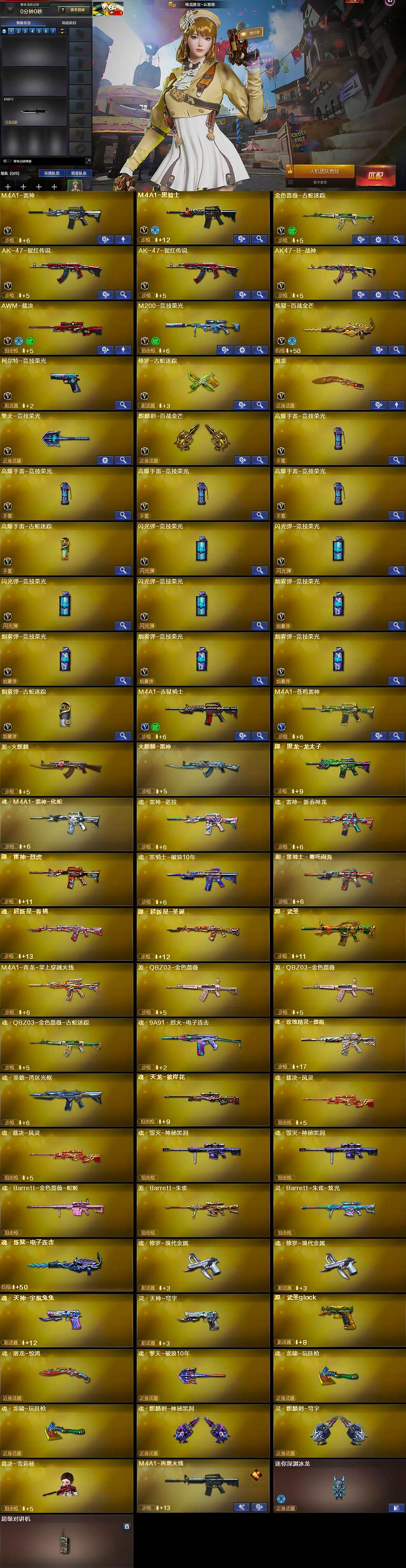 【英雄级武器】:M4A1-雷神,M4A1-黑骑士,金色蔷薇-古蛇迷踪,AK-47-猩红传说*2,AK47-B-战神,AWM-裁决,M200-竞技荣光,炼狱-百战金芒,柯尔特-竞技荣光,修罗-古蛇迷踪,屠龙,擎天-竞技荣光,麒麟刺-百战金芒,高爆手雷-竞技荣光*4,高爆手雷-古蛇迷踪,闪光弹-竞技荣光*4,烟雾弹-竞技荣光*4,烟雾弹-古蛇迷踪,M4A1-赤狱骑士,M4A1-苍鸣雷神