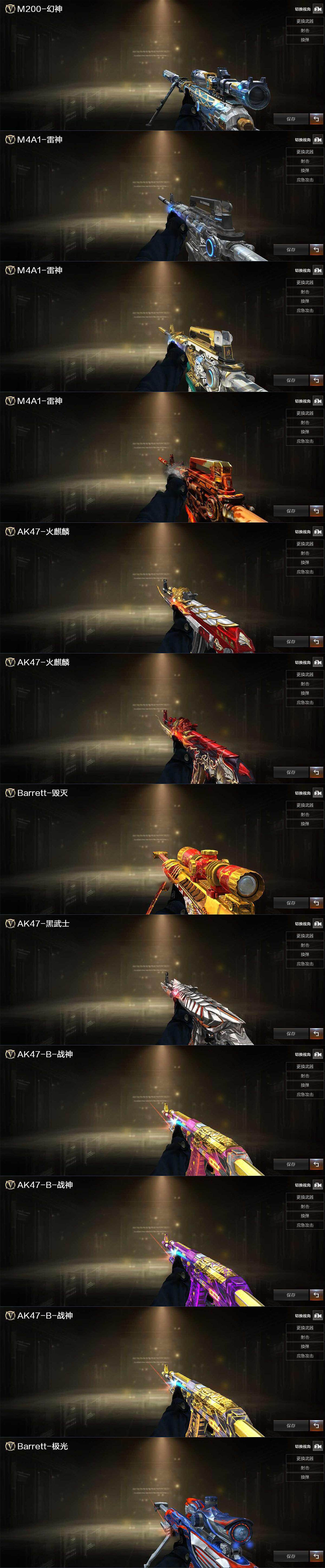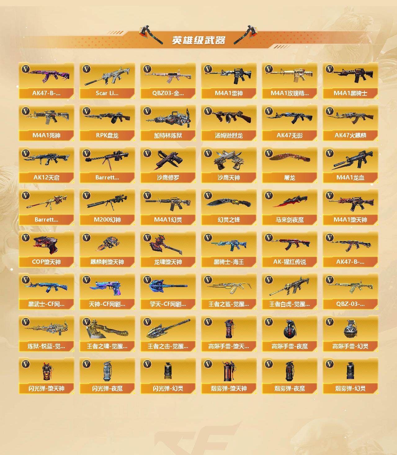 【热门武器】:传说圣灵,QBZ03-金色蔷薇,Scar Light-白虎*3,M200-幻神,死亡之眼,牛牛-AK47,M4A1-黑骑士,汤姆逊-烈龙*6,RPK-盘龙*6,加特林-炼狱,斯泰尔-蝴蝶,COP-白鲨,COP-堕天神,沙鹰-修罗,金刚伞*4