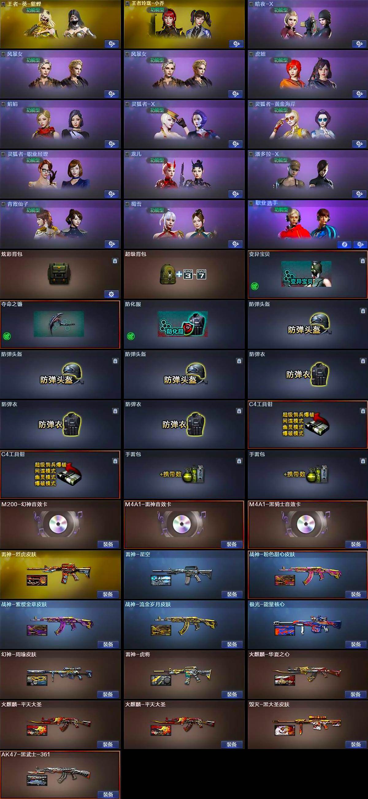 - [13101206]安卓 手Q-2神装-18粉装-10特效枪-8载具-6粉色飞行器-92108热力值-16王牌印记-177套装-224枪皮 【红色神装等级】:魔童闹海-哪吒(二级),角色-银枪赵云(一级) 【红色角色神装】:魔童闹海-哪吒,角色-银枪赵云 【热门品类】:套装-火箭少女101,套装-深海小丑鱼,角色-军刀雅典娜,角色-2B战斗服款,角色-2P战斗服款,角色-忠猛周仓,角色-忠真马岱,角色-忠义严颜,套装-六号树人,套装-龟仙人,套装-暗影哥特,套装-糯粉咩咩,大砍刀-青龙偃月刀,撬棍-龙胆亮银枪 【粉色载具】:玛莎拉蒂Quattroporte(夜幕蓝),乔治巴顿战车(乳石白),宾利欧陆GT敞篷(火焰橘),迈凯伦570S(天际蓝),Formula E Gen2(幽光蓝),极速兔兔车,僚机-萌兔起飞,僚机-萌酷奶龙,赤兔,照夜玉狮子 【粉色套装】:粉装-新星烈龙,粉装-焦糖拿铁,粉装-筑梦精灵,角色-复仇流浪者,粉装-垂柳戏鸭,粉装-彩虹甜喵,蜀山剑侠-李逍遥,女娲后裔-赵灵儿,粉装-青空秋雨,粉装-第五大道,粉装-挚爱序曲,角色-小可学妹,角色-幻影,粉装-炫光之旅,角色-茉莉星,角色-宙之时溯,粉装-莲影清波,角色-羊梦糖心 【粉色枪皮等级】:AKM-绿萝繁花(五级),SCAR-L-纯梦嫁纱(七级),M416-至情至圣(四级),AUG-超新星(六级),P90-能量风暴(一级),P90-魔童闹海 敖丙(三级),Kar98K-巳巳如意(五级),M24-莲影清波(一级),DP-28-豹影疾电(五级) 【粉色枪皮】:AKM-绿萝繁花,SCAR-L-纯梦嫁纱,M416-至情至圣,AUG-超新星,P90-能量风暴,P90-魔童闹海 敖丙,Kar98K-巳巳如意,M24-莲影清波,DP-28-豹影疾电,破片手榴弹-粉粉猫爪 【粉色飞行器】:激战未来飞行器,璀璨巨星飞行器,变形金刚飞行器,沙丘之主天马,飞天猪飞行器,灵珠游龙飞行器 【粉色降落伞】:伏魔团降落伞,焦糖拿铁降落伞,橘柚倾心降落伞,筑梦精灵降落伞,炙焰牛王降落伞,环太平洋降落伞,垂柳戏鸭降落伞,彩虹甜喵降落伞,暗夜鎏金降落伞,海螺星光降落伞,音爆索尼克降落伞,第五大道降落伞,黄族统领降落伞,璀璨巨星降落伞,未来歌姬降落伞,莲影清波降落伞,龙行天下降落伞,喜羊羊与灰太狼降落伞,魔童闹海 敖丙降落伞,异瞳寒姬降落伞 【稀有套装】