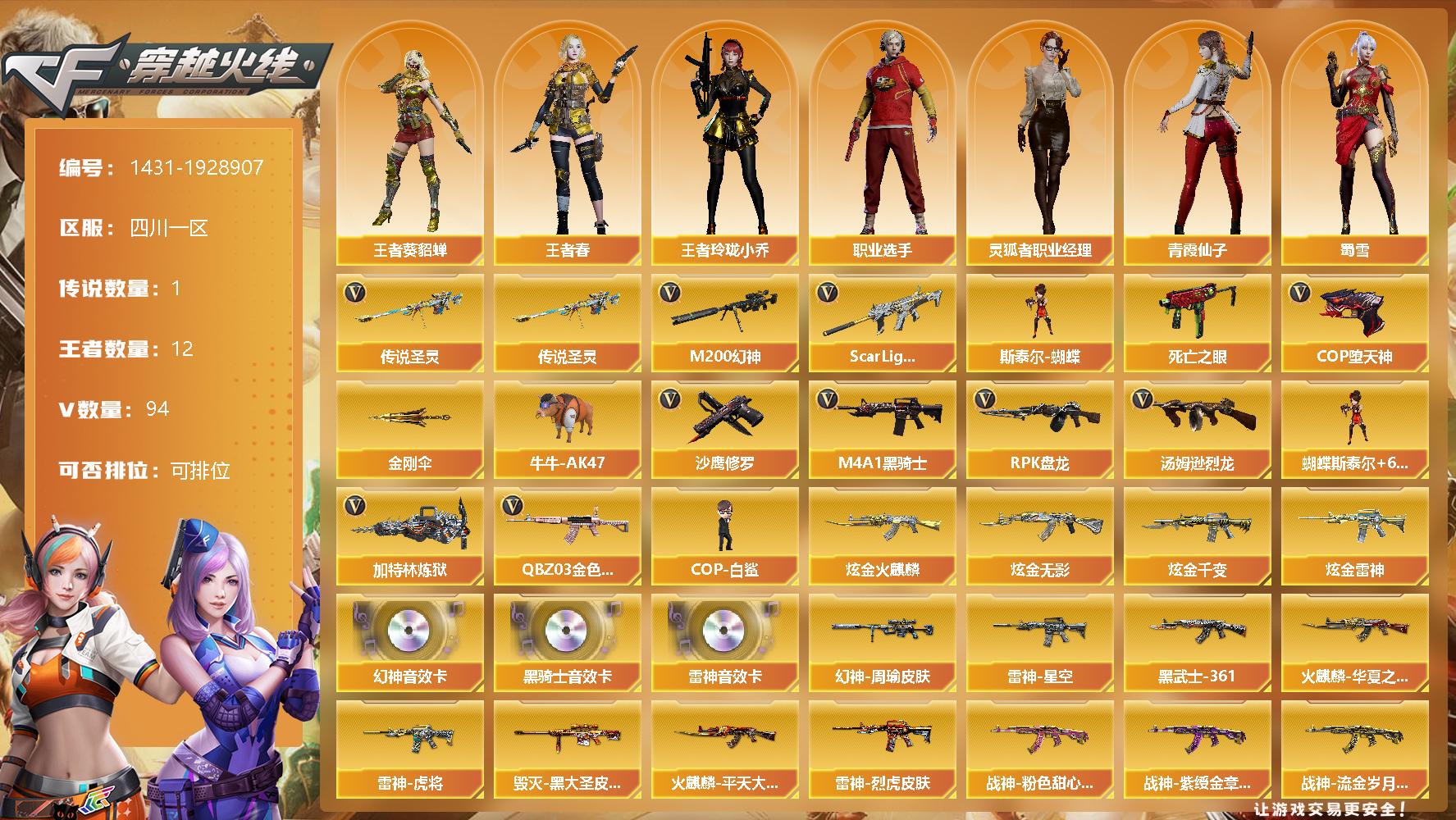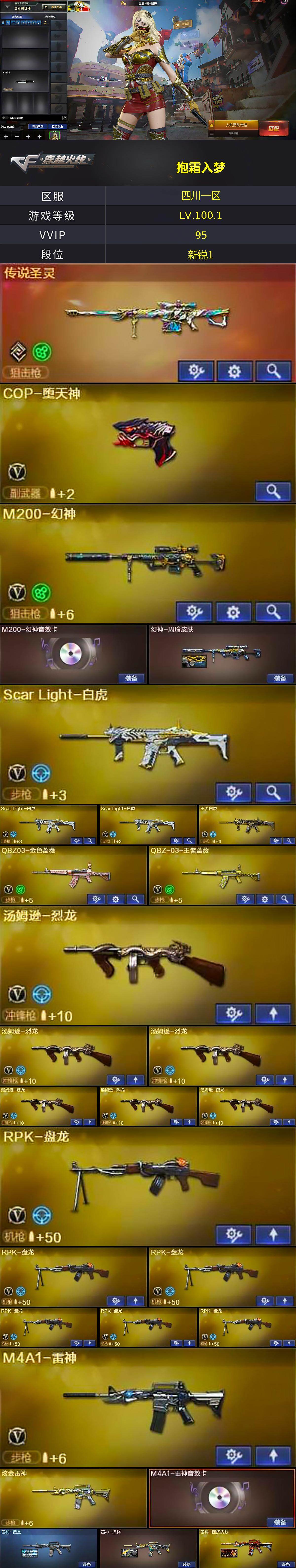 [15435706]四川一区-94V-12王者-4炫金 【传说武器】:传说圣灵 【热门武器】:传说圣灵,QBZ03-金色蔷薇,Scar Light-白虎*3,M200-幻神,死亡之眼,牛牛-AK47,M4A1-黑骑士,汤姆逊-烈龙*6,RPK-盘龙*6,加特林-炼狱,斯泰尔-蝴蝶,COP-白鲨,COP-堕天神,沙鹰-修罗,金刚伞*4 【王者炫金武器】:炫金火麒麟,炫金无影,炫金千变,炫金雷神 【音效卡】:M200