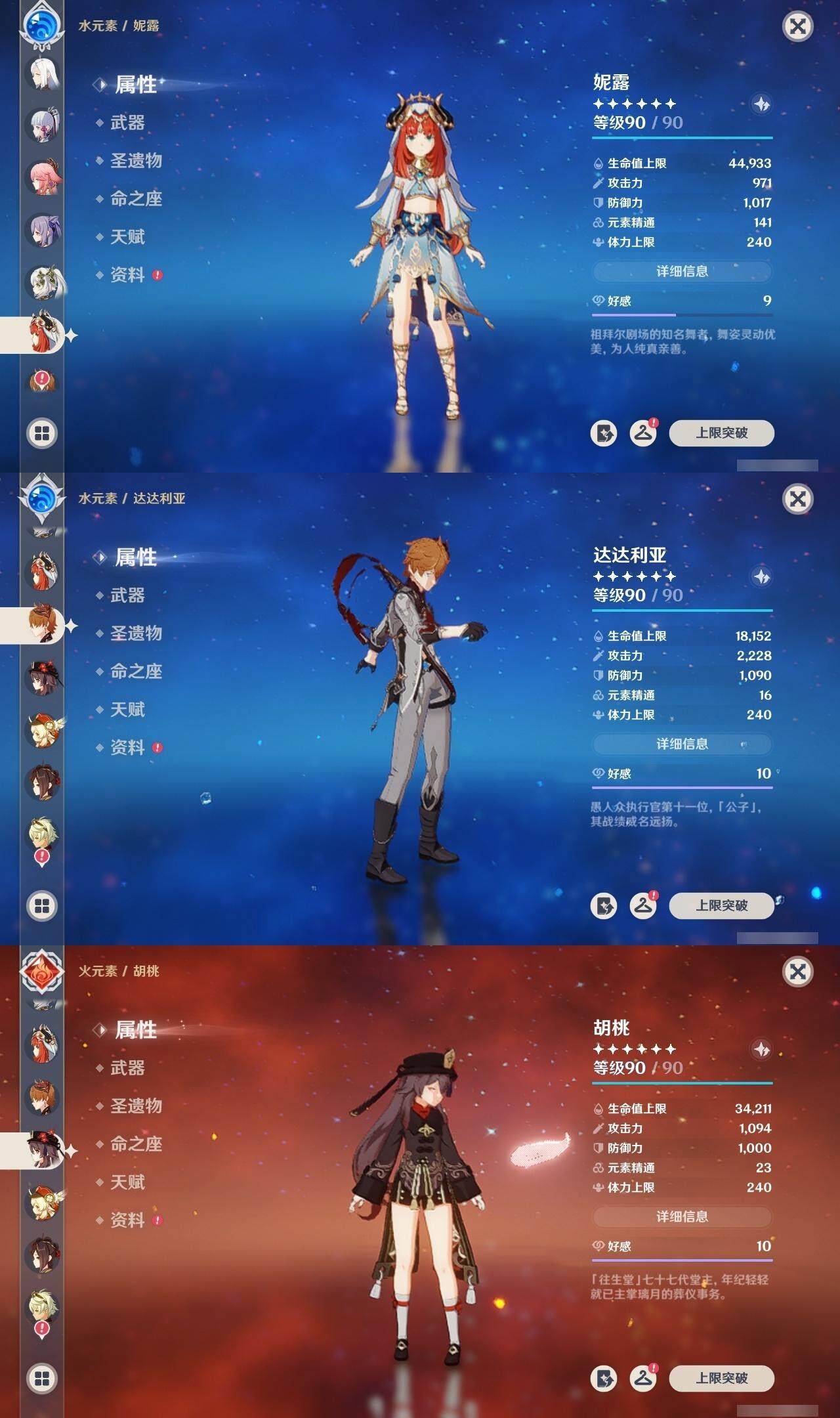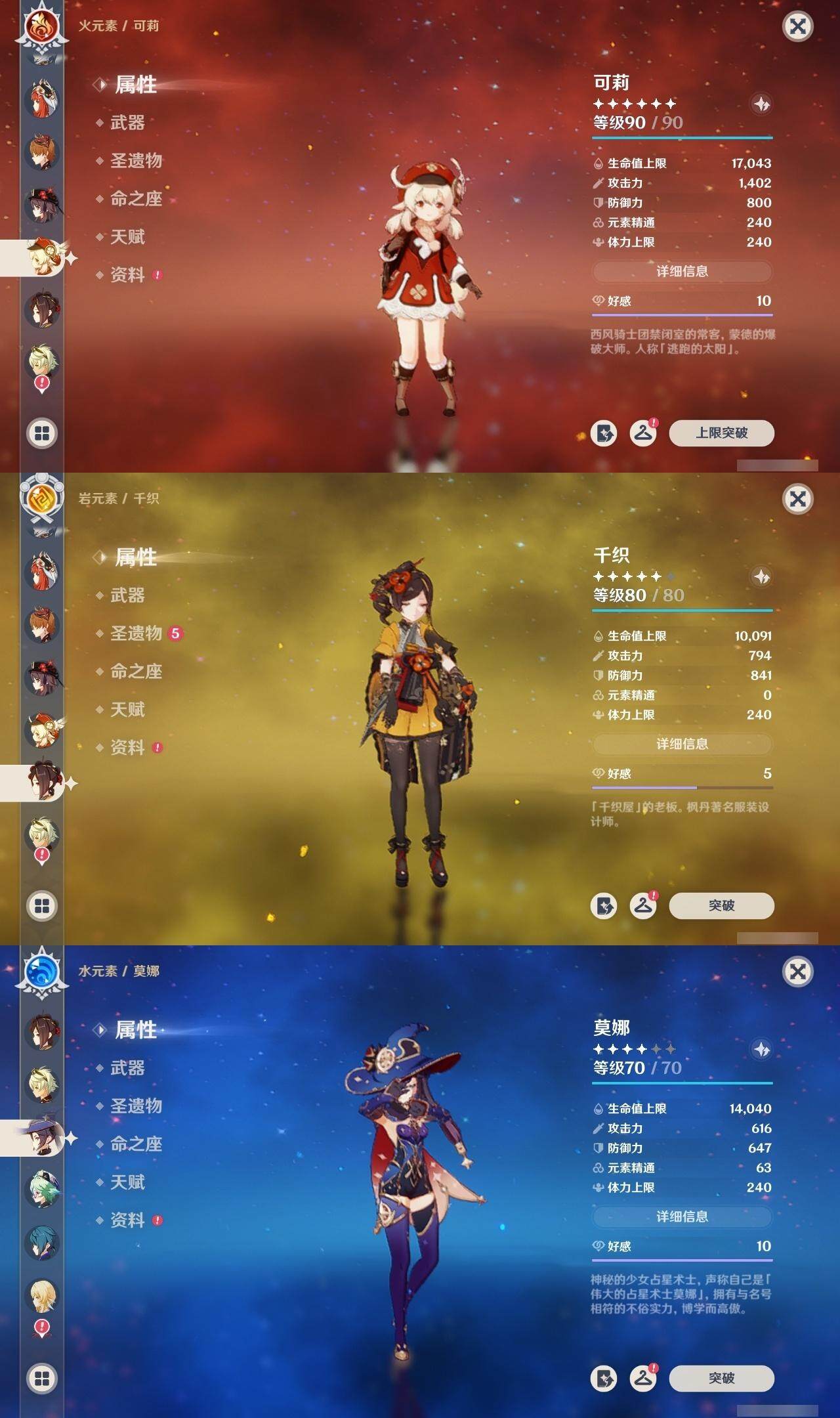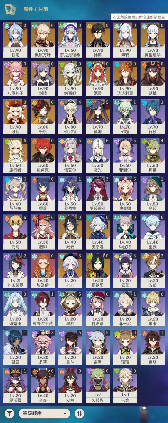 - [15261052]56级/19黄/女主/12个五星角色/5个五星武器 0命阿蕾奇诺,0命妮露,0命夜兰,0命雷电将军,0命钟离,0命胡桃,0命魈,0命宵宫,0命温迪,0命刻晴,2命莫娜,0命迪卢克,精1最初的大魔术,精1和璞鸢,精1天空之脊,精1阿莫斯之弓