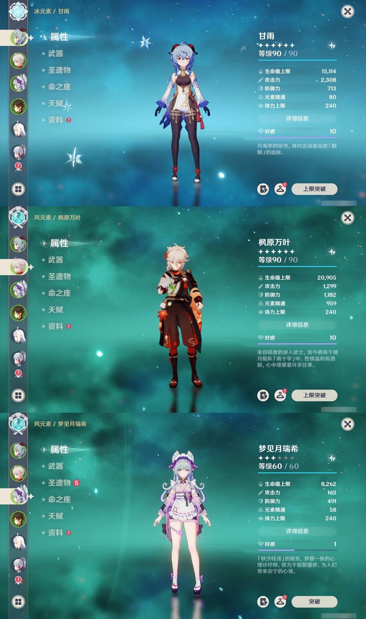 甘雨,枫原万叶,钟离,申鹤,神里凌华,八重神子,刻晴,达达利亚,胡桃,可莉,莫娜,迪卢克,七七