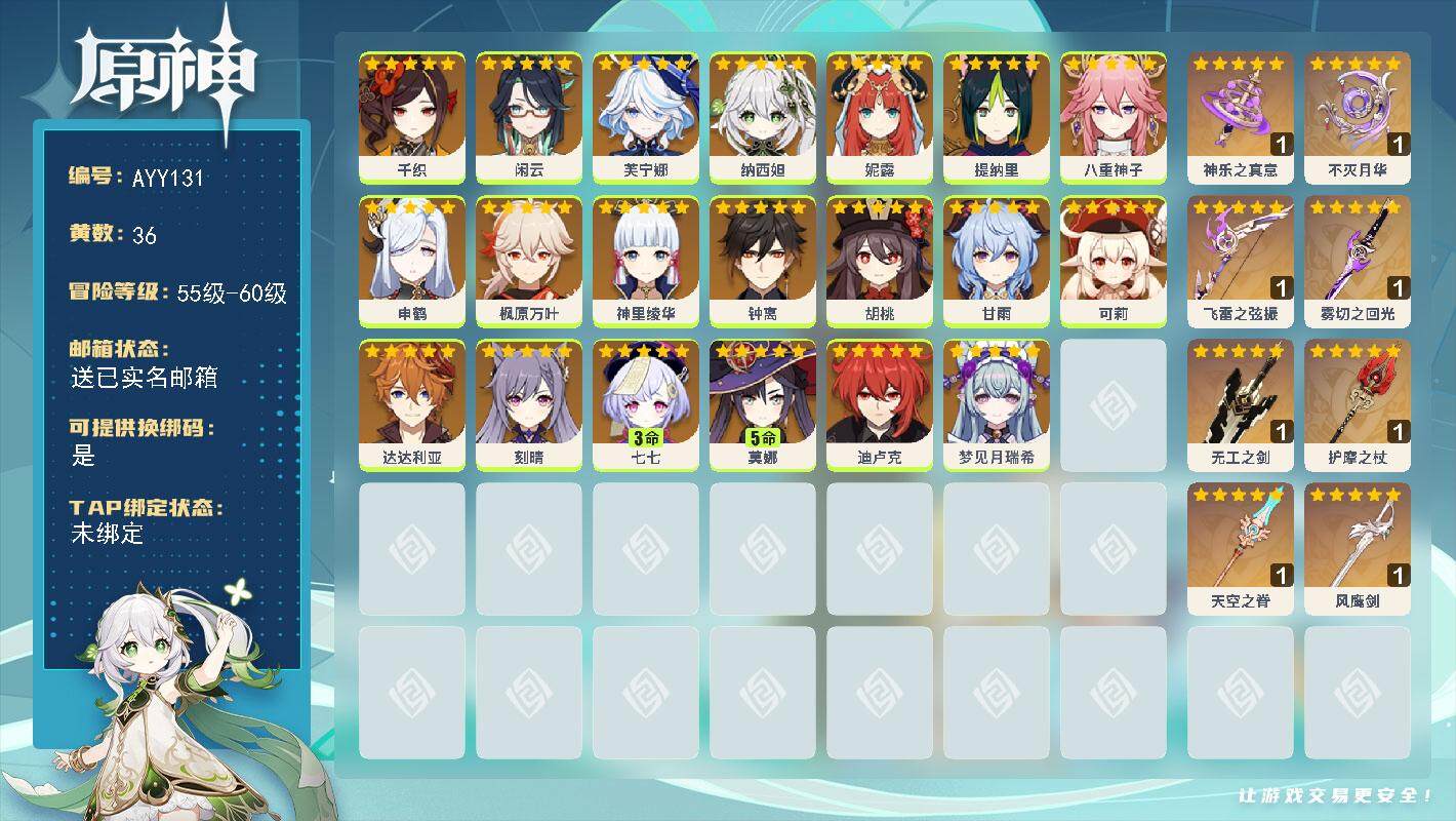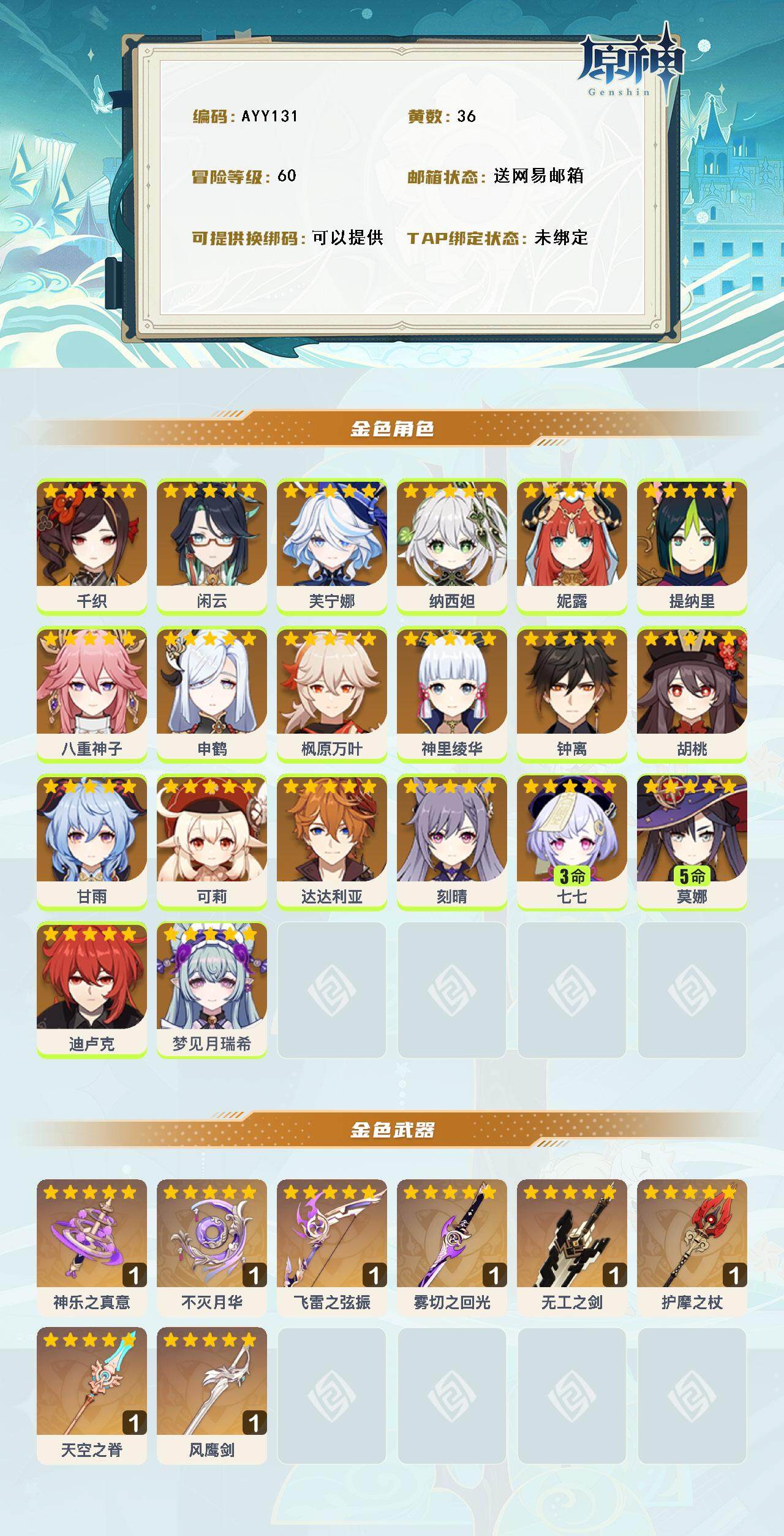 [15405562]60级/36黄/女主/20个五星角色/8个五星武器 0命千织,0命闲云,0命芙宁娜,0命纳西妲,0命妮露,0命提纳里,0命八重神子,0命申鹤,0命枫原万叶,0命神里绫华,0命钟离,0命胡桃,0命甘雨,0命可莉,0命达达利亚,0命刻晴,3命七七,5命莫娜,0命迪卢克,0命梦见月瑞希,精1神乐之真意,精1不灭月华,精1飞雷之弦振,精1雾切之回光,精1无工之剑,精1护摩之杖,精1天空之脊,精1风鹰剑