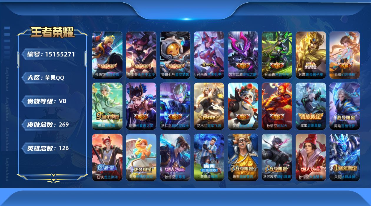 [15155271]【店主推荐捡漏号!可直接换绑/3市标】:苹果Q-V8-永恒钻石III段位-126英雄-269皮肤-3典藏-1星元-12传说-67史诗