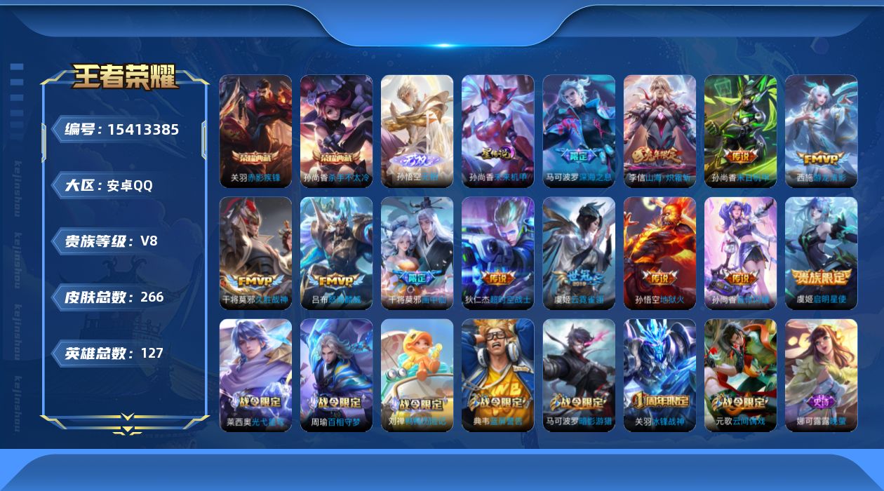 - [12279387]V8 1典藏 19传说 125英雄 222皮肤 可修改实名 优质装备:鸣剑·曳影,云鹰飞将(小将军),绛天战甲(鸡嘴战神),炽阳神光,一念神魔,云霓雀翎,仲夏夜之梦(大飞蛾),李逍遥,淬星耀世,末日机甲-孙策,山海·苍雷引(电光曜子),浮生妄 传说皮:云诺千山 珍宝阁皮:优雅恋人,女武神 限定皮:白虎志(电光耗子),凤求凰(白切鸡),异界灵契(白毛香),时雨天司(水龙头),神威(电光马子),遇见飞天,高山流水,诗剑行,五谷丰年,御风骁将(吕布年限),祈雪灵祝(雪兔子),天狼绘梦者,李小龙,默契交锋-花木兰,大圣娶亲 史诗皮:鸭鸭历险记-刘禅,龙之律动,石田雨龙,织梦人,紫霞仙子,电玩小子(小书包),白龙吟,特工魅影,千年之狐,永昼,江河有灵,魅语,无限星赏官,冰冠公主,偶像歌手,白蛇,晚萤,电玩·爆裂旋风,暗夜猫娘,猫狗日记-孙策,时之恋人-孙尚香,节奏热浪,修罗,女仆咖啡,水果甜心,天才门将,星夜王子,时之奇旅-安琪拉,功夫厨神,德古拉伯爵,暗隐猎兽者,幽灵船长,鬼剑武藏,暗渊魔法,舞动绿茵,地狱岩魂,纤云弄巧,繁星吟游(呼啦呼啦),拒霜思,缤纷独角兽,乘风破浪,逐浪之夏,曙光守护者,热力回旋,箭羽风息,原初追逐者,圣诞恋歌,鹰眼统帅,魅力维加斯,黎明之约,赏金猎手,无心,未来纪元-赵云