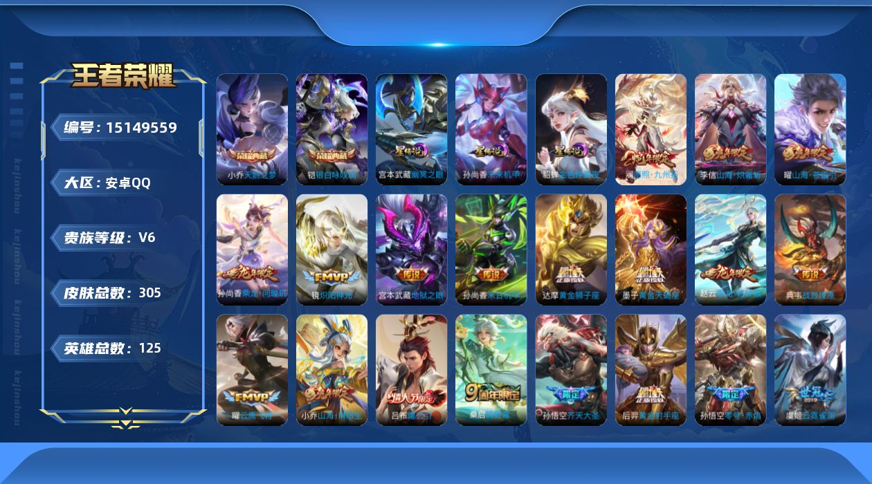 - [11523660]V10 2典藏 23传说 125英雄 343皮肤 典藏英雄武则天 可修改实名 优质装备:天鹅之梦(小乔典藏),鸣剑·曳影,黄金狮子座,冠军飞将,云鹰飞将(小将军),黄金白羊座,猫影幻舞,久胜战神,一念神魔,云霓雀翎,末日机甲-孙尚香(绿蚂蚱),地狱火,仲夏夜之梦(大飞蛾),海洋之心,超时空战士-狄仁杰,澜逐花归海,艾琳觅芳踪 珍宝阁皮:妄想食味,女武神 限定皮:鸣野蒿,至尊宝,凤求凰(白切鸡),凤凰于飞,太华(伽罗年限),时之彼端,白晶晶,时雨天司(水龙头),飞衡(韩信年限),玄嵩(庄周年限),遇见飞天,冰锋战神,幽恒(沐浴露),梁祝,御风骁将(吕布年限),逐梦之星,岱宗(典韦年限),奔雷神使(牛魔年限),祈雪灵祝(雪兔子),天狼绘梦者,李小龙,逐梦之光,永曜之星,辉光之辰,如梦令-嫦娥,如梦令-后羿,霸王别姬-项羽,霸王别姬-虞姬,奇迹圣诞,默契交锋-兰陵王,默契交锋-花木兰,引擎之心,冰霜恋舞曲,热情桑巴,美猴王 史诗皮:鸭鸭历险记-刘禅,遇见神鹿,紫霞仙子,电玩小子(小书包),白龙吟,黄金分割率,特工魅影,千年之狐,偶像歌手,龙骑士(小龙虾),白蛇,暗夜猫娘,魅语,无限星赏官,晚萤,冰冠公主,青蛇,末日机甲-吕布,猫狗日记-孙策,猫狗日记-大乔,时之恋人-孙尚香,乱世虎臣,节奏热浪,修罗,女仆咖啡,摇滚巨星,水果甜心,绅士熊喵,天才门将,星夜王子,心灵骇客,功夫厨神,德古拉伯爵,暗隐猎兽者,幽灵船长,鬼剑武藏,心灵战警,舞动绿茵,地狱岩魂,纤云弄巧,繁星吟游(呼啦呼啦),缤纷独角兽,乘风破浪,逐浪之夏,龙鼓争鸣,水晶猎龙者,曙光守护者,热力回旋,箭羽风息,金属风暴,原初追逐者,圣诞狂欢,圣诞恋歌,鹰眼统帅,暗夜贵公子,魅力维加斯,未来纪元-赵云