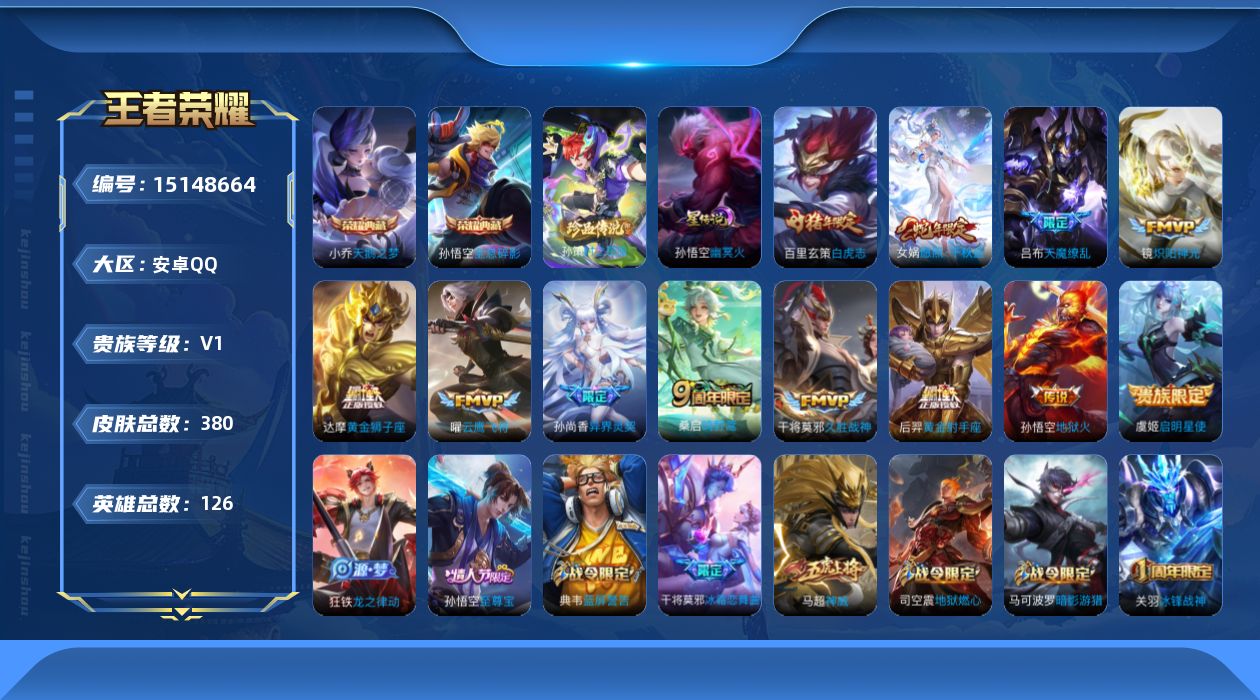 [15148664]安卓Q-V1-尊贵铂金II段位-126英雄-380皮肤-2典藏皮肤-1珍品传说-12传说-111史诗 【英雄全皮】:达摩全皮,刘邦全皮,钟馗全皮,猪八戒全皮,蒙恬全皮,戈娅全皮,影全皮 【荣耀典藏】:孙悟空全息碎影,小乔天鹅之梦 【珍品传说】:孙策时之奇旅 【传说皮肤】:女娲愿照千秋盛,桑启鸣野蒿,孙尚香异界灵契,镜炽阳神光,虞姬启明星使,曜云鹰飞将,干将莫邪久胜战神,达摩黄金狮子座,百里玄策白虎志,后羿黄金射手座,孙悟空地狱火,吕布天魔缭乱 【限定皮肤】:蔡文姬夏日便利店,大乔绒语心约,虞姬夏日便利店,姜子牙天穹之誓,杨戬破阵退雄兵,狄仁杰阴阳师,赵云皇家上将,墨子神迹守卫,嬴政优雅恋人,嬴政白昼王子,孙尚香蔷薇恋人,孙尚香异界灵契,鲁班七号狮舞东方,庄周高山流水,高渐离死亡摇滚,阿轲迷踪丽影,芈月重明,芈月幻夜卜梦,吕布天魔缭乱,吕布猎兽之王,周瑜赤莲之焰,元歌云间偶戏,夏侯惇朔风刀,甄姬游园惊梦,曹操烛龙,典韦穷奇,典韦蓝屏警告,马可波罗逐梦之星,马可波罗暗影游猎,狄仁杰魔术师,狄仁杰万华元夜,达摩星际陆战队,达摩沙漠行僧,项羽海滩派对,老夫子醍醐杖,老夫子航海奇遇记,关羽冰锋战神,程咬金演武夺筹,刘邦夺宝奇兵,韩信逐梦之影,韩信飞衡,兰陵王驯魔猎人,兰陵王金庭之子,亚瑟潮玩骑士王,孙悟空美猴王,孙悟空至尊宝,牛魔御旌,后羿辉光之辰,后羿圣弓游侠,李元芳银河之约,李元芳云中旅人,虞姬启明星使,钟馗神迹守卫,钟馗驱傩正仪,杨玉环遇见飞天,女娲朔望之晖,哪吒逐梦之翼,干将莫邪冰霜恋舞曲,干将莫邪真爱魔法,雅典娜单词大作战,雅典娜黎明之约,蔡文姬繁星吟游,太乙真人华丽摇滚,鬼谷子原初探秘者,鬼谷子五谷丰年,黄忠火炮绅士,苏烈千军破阵,百里玄策白虎志,百里玄策原初追逐者,弈星混沌棋,沈梦溪星空之诺,明世隐疑决卦,裴擒虎李小龙,裴擒虎擒涛扼浪,狂铁御狮,米莱狄御霄,米莱狄胡桃异想国,云中君纤云弄巧,盾山御銮,猪八戒西部大镖客,猪八戒猪悟能,上官婉儿梁祝,嫦娥拒霜思,西施玲珑珍味,蒙犽狂想玩偶喵,鲁班大师探海日志,戈娅驭风魔法,艾琳流音漫舞,司空震地狱燃心,阿古朵江河有灵,张良古海寻踪,蒙犽百解令,蒙恬荣光圣徽,高渐离燃音魔法,妲己灵卜魔法,鬼谷子天穹祈灯,伽罗琥珀纪元,沈梦溪龙舞盛年,鲁班七号蔬乡物语,李元芳蔬乡物语,刘邦剑破天穹,程咬金群星魔术团,镜青焰无极,项羽苍