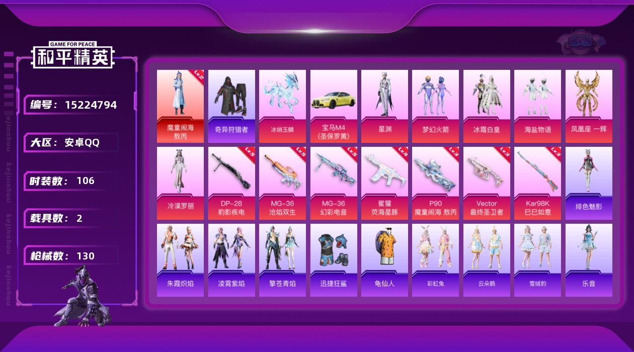 - [12803814]素材身法号 安卓 手Q-1神装-10粉装-14特效枪-2载具-7粉色飞行器-13.1w热力值-17王牌印记-274套装-396枪皮【红色神装等级】:魔童闹海-哪吒(二级)【热门品类】:粉装-梦幻火箭,套装-浪漫天命,套装-都市猎人,套装-深海小丑鱼,套装-小丑鱼,套装-奇异狩猎者,套装-金羽特工,套装-龟仙人,套装-暗影哥特,套装-浪漫波比,套装-粉红小猪,套装-萌熊伴侣,角色-8号机【粉色载具】:兰博基尼Estoque(银翼灰),黑曜夜骑【粉色套装】:粉装-天使彩虹糖,粉装-梦幻火箭,粉装-新星烈龙,粉装-星之彼岸,粉装-庄周梦蝶,粉装-飒粉甜心,角色-水仙星,粉装-金丰海韵,粉装-幻彩电音,角色-奇迹舞步 美雪【粉色枪皮等级】:AKM-星际浪客(六级),AKM-绿萝繁花(四级),SCAR-L-梦幻火箭(五级),M416-五爪金龙(一级),M416-灵猫魔法师(三级),GROZA-镜光银凌(四级),AUG-暖羊咩咩(五级),M762-激战未来(五级),蜜獾-异瞳寒姬(四级),AKS-74U-信仰神谕(五级),Kar98K-巳巳如意(五级),Mk14-甜梦熊击(四级),SLR-暗夜玫瑰(六级),DP-28-豹影疾电(五级)【粉色飞行器】:梦幻火箭飞行器,庄周梦蝶飞行器,沙丘之主天马,镜域双华-灵镜之阶,月下星之子飞行器,灵猫魔法师飞行器