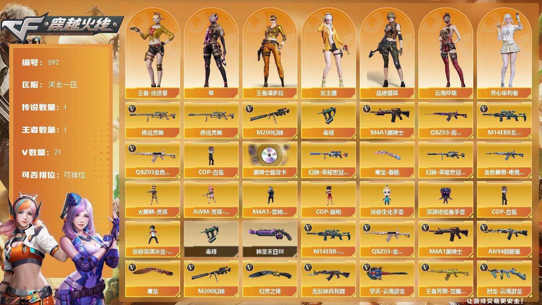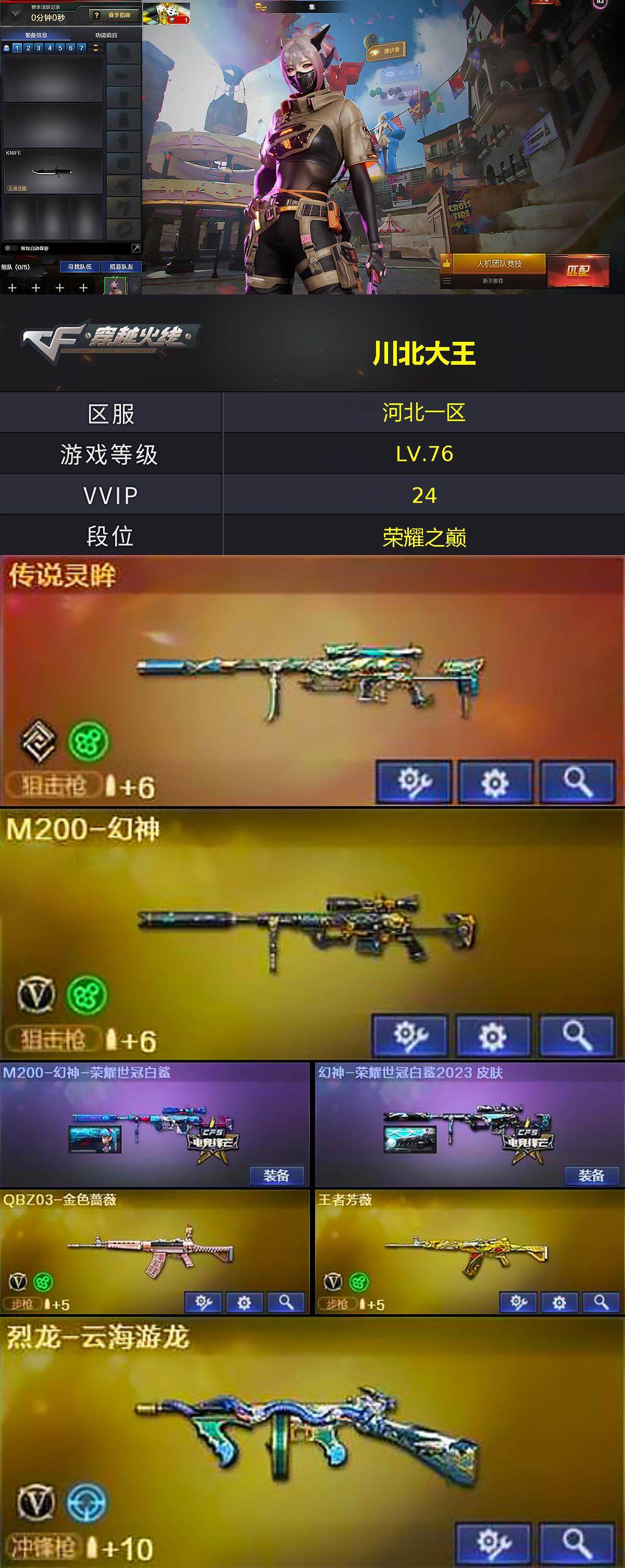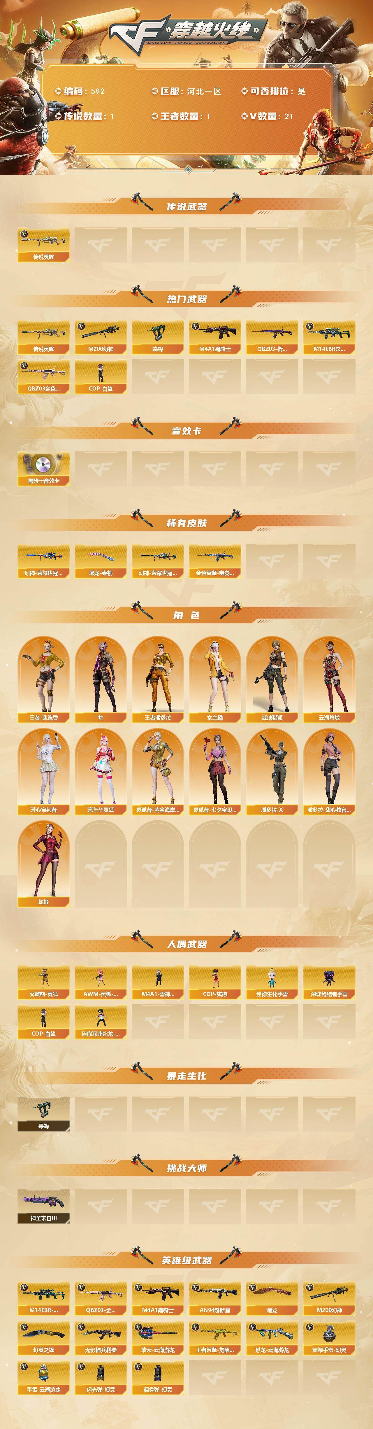[15032668]河北一区-21V-1王者-0炫金 【传说武器】:传说灵眸 【热门武器】:传说灵眸,QBZ03-金色蔷薇,M14EBR-玄武,M200-幻神,QBZ03-街机,毒蜂,M4A1-黑骑士,COP-白鲨 【音效卡】:M4A1-黑骑士音效卡 【皮肤】:M200-幻神-荣耀世冠白鲨,幻神-荣耀世冠白鲨2023 皮肤,金色蔷薇-电竞之星 皮肤,屠龙-春桃 皮肤 【角色】:隼,战地猎狐,王者-迷迭香,王者潘多拉,云海玲珑,芳心审判者,嘉年华灵狐,灵狐者-黄金海岸,灵狐者-七夕宝贝,女主播,潘多拉-X,潘多拉-甜心教官,蛇姬 【人偶武器】:COP-白鲨,火麒麟-灵狐,M4A1-雷神-精英刀锋,AWM-灵狐-15周年嘉年华,COP-旗袍,迷你生化手雷,深渊终结者手雷,迷你深渊冰龙-王绿豆 【暴走生化】:毒蜂 【挑战大师】:神圣爆裂者-末日III 【英雄级武器】:M4A1-黑骑士,AN94-超新星,M14EBR-玄武,无影-神兵利器,QBZ03-金色蔷薇,王者芳薇-觉醒版,M200-幻神,烈龙-云海游龙,屠龙*2,幻灵之锋,擎天-云海游龙,高爆手雷-幻灵,手雷-云海游龙,闪光弹-幻灵,烟雾弹-幻灵 【道具】:CFS限定背包,云海游龙炫彩背包,亚洲杯纪念炫彩背包,超级背包,救世主-黑桃战神,绿色巨人,灵魂忍者,迷雾幽灵,夺命之镰,防化服*2,金色流光-枪王排位,枪王排位29赛季金色流光,云海游龙表情,防弹头盔*2,防弹衣*2,C4工具钳*2,手雷包*2 【特殊枪械】:1黑骑士